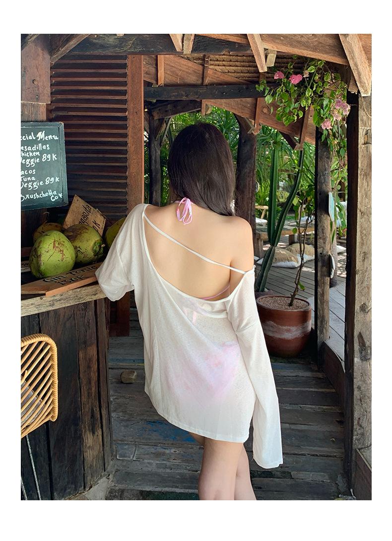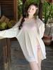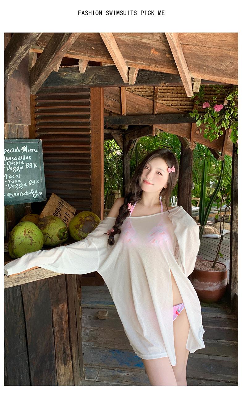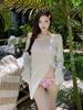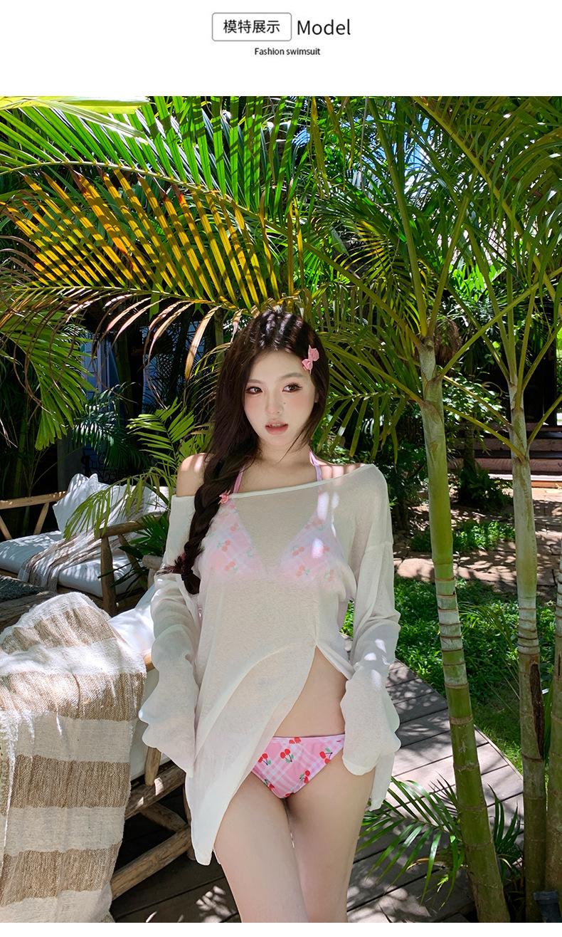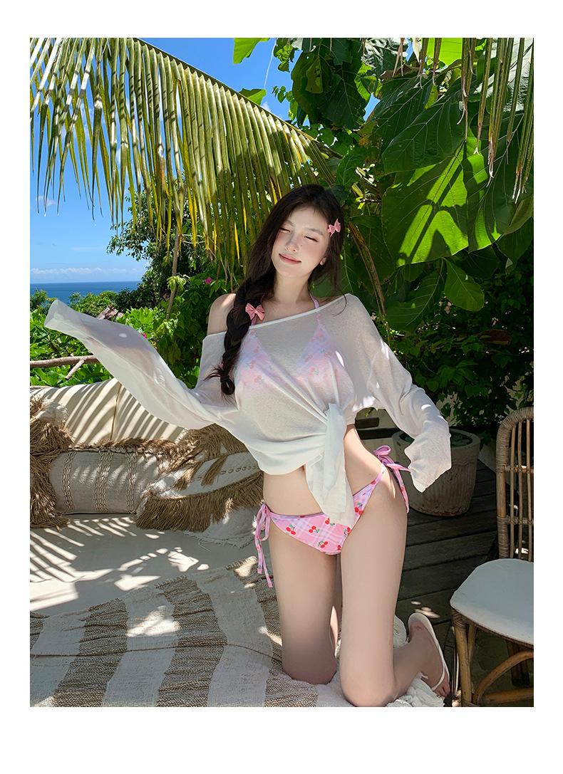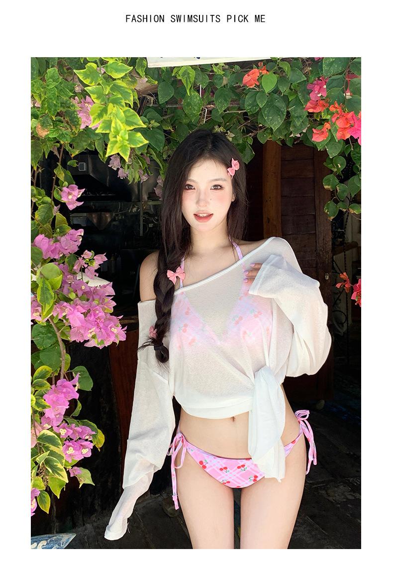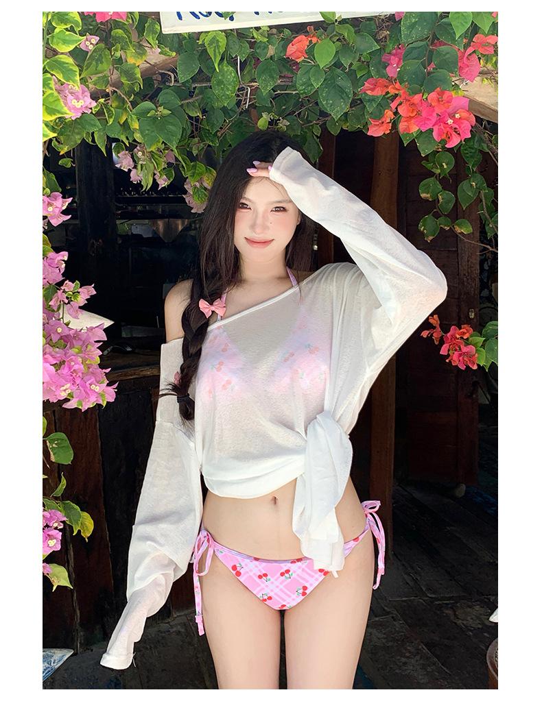 Conjunto de tres piezas de bikini sexy con estampado de cerezas pequeñas y conservador, blusa de manga larga con protector solar, traje de baño para mujer