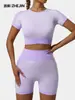 【Muestra】Conjunto Deportivo Sexy de Yoga Transfronterizo Europeo y Americano para Mujer, Sujetador de Manga Corta, Shorts de Fitness de Cintura Alta para Control de Abdomen