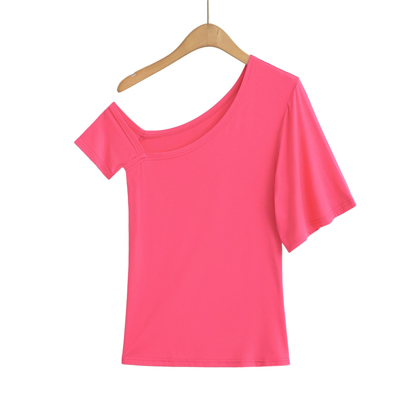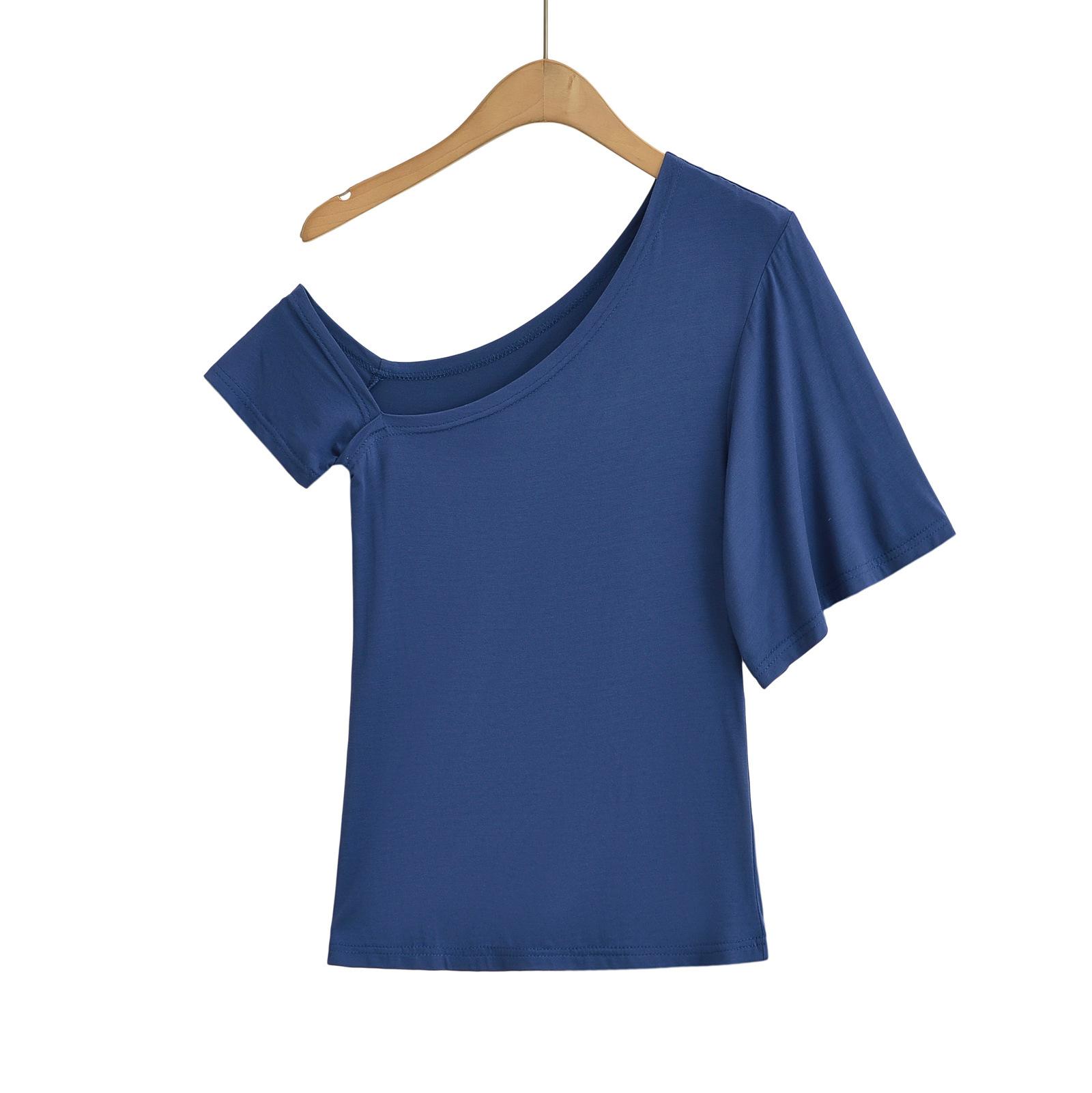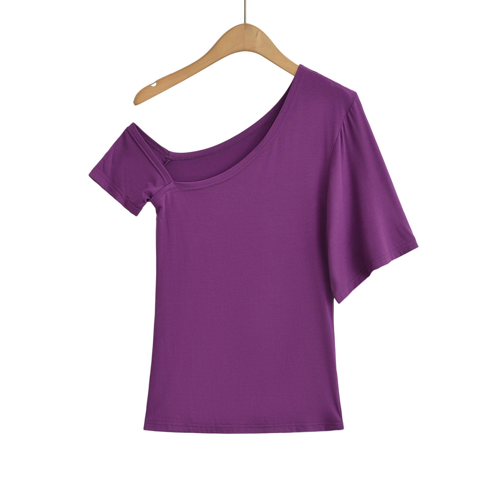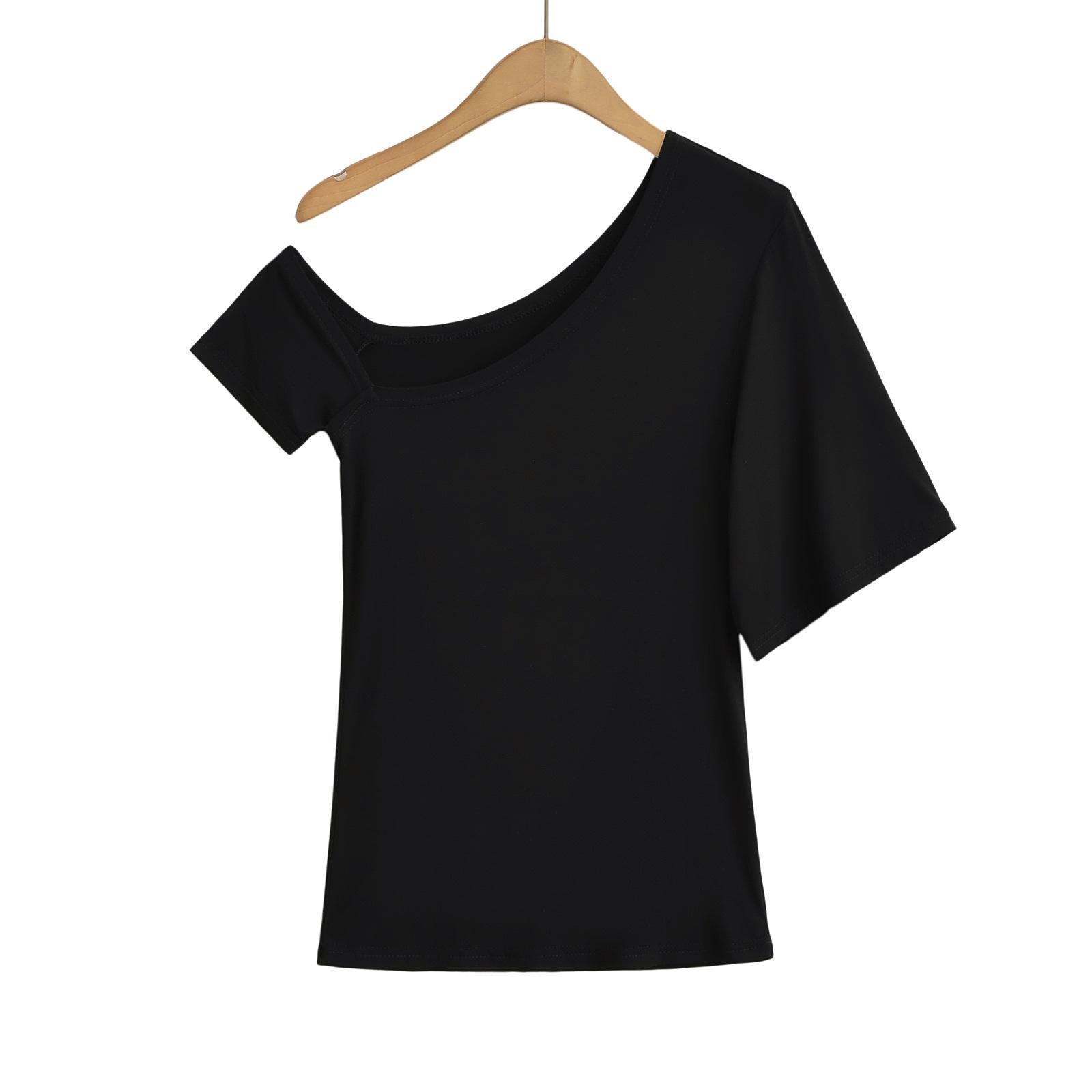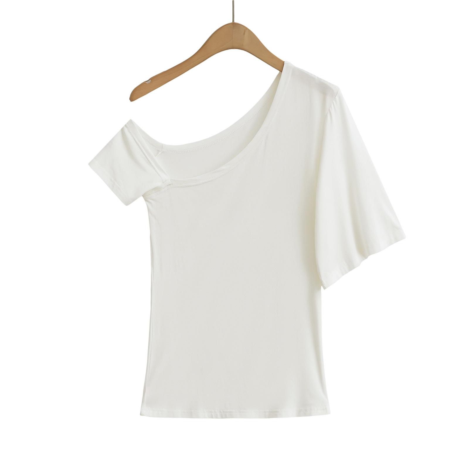 9057-24 Verano Nuevo Viento Puro Curvado Irregular Hombro Top Mujer Francés Adelgazante Hombro Manga Corta Camiseta