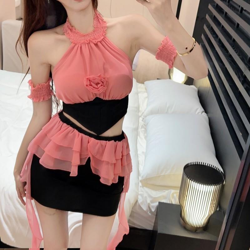 Compra Sexy Dulce y picante color de contraste sin mangas halter rosa Top Dulce falda de encaje con cinta irregular en la cadera conjunto de dos piezas para mujer al por mayor en Joom.pro
