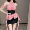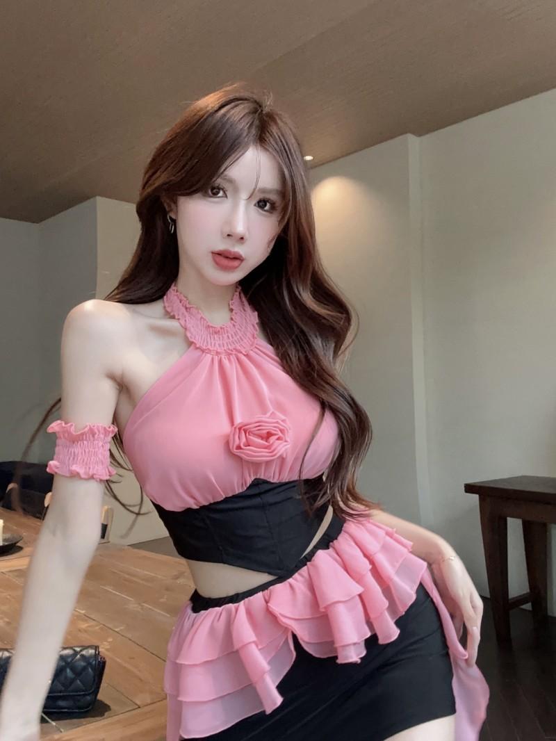 Sexy Dulce y picante color de contraste sin mangas halter rosa Top Dulce falda de encaje con cinta irregular en la cadera conjunto de dos piezas para mujer