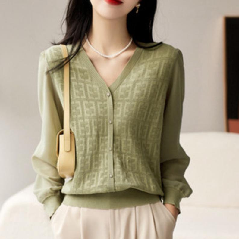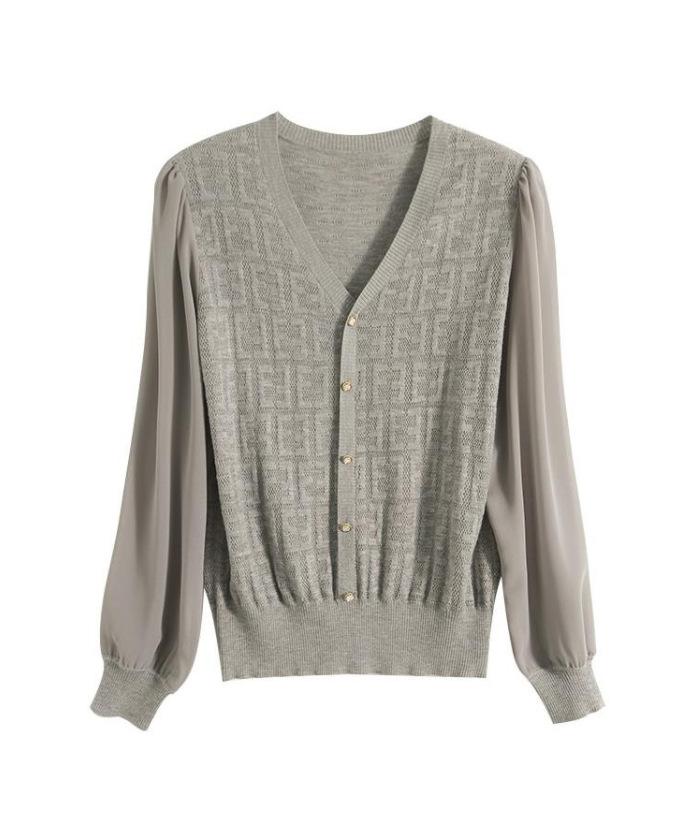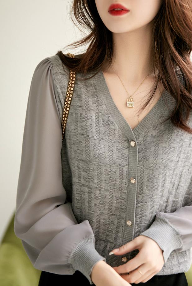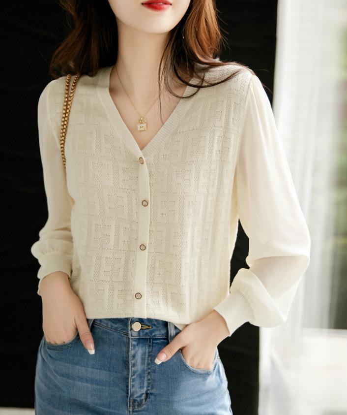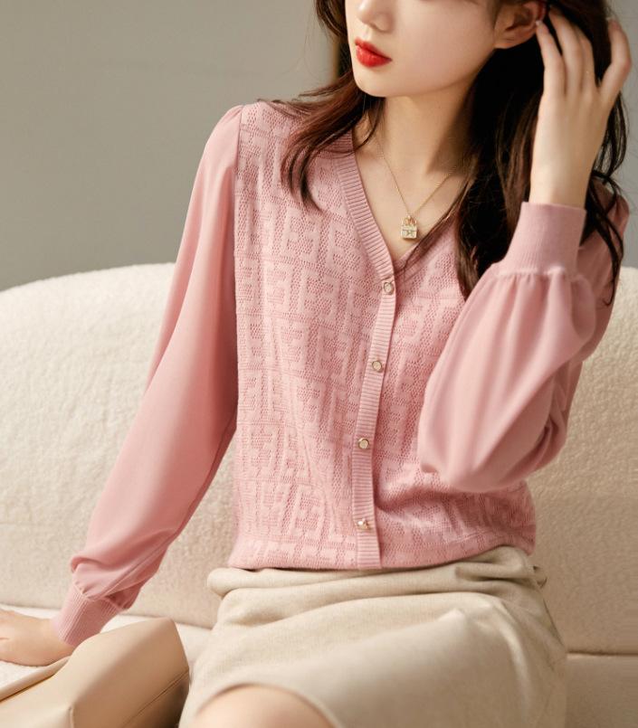 2023 primavera nuevo temperamento francés manga larga calado gasa costura cuello en V jersey tejido top camisa mujer