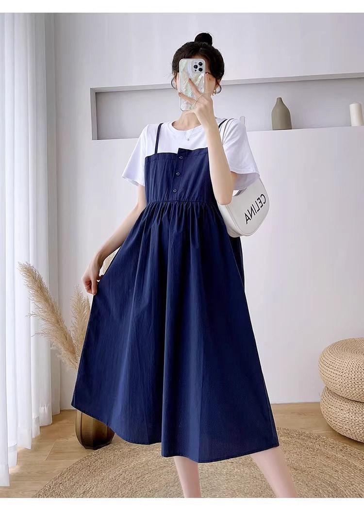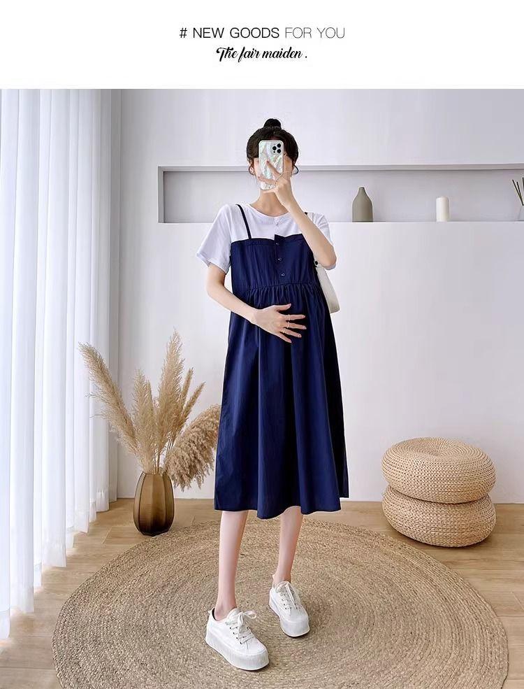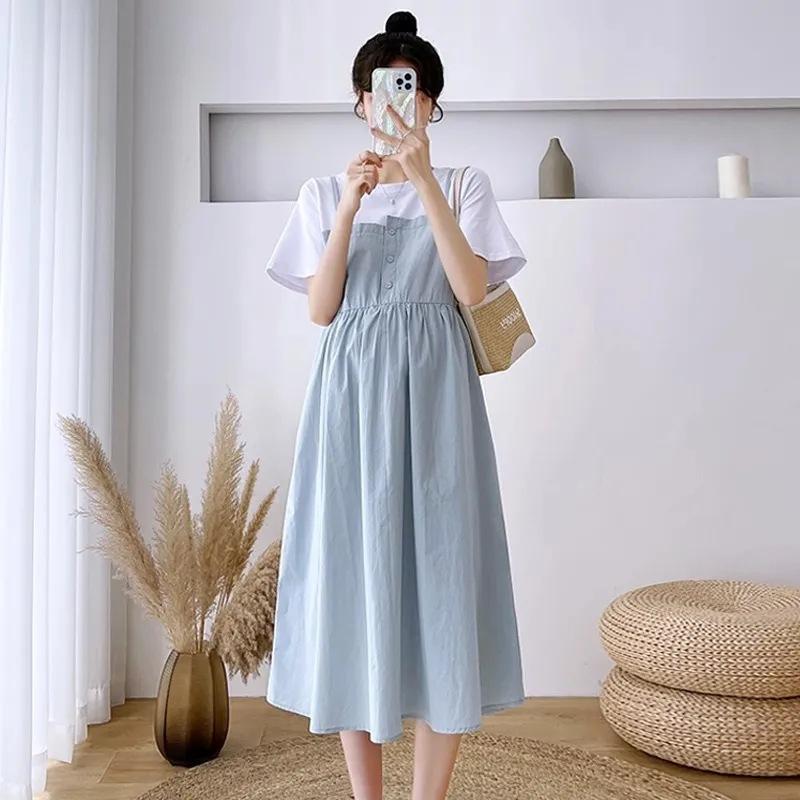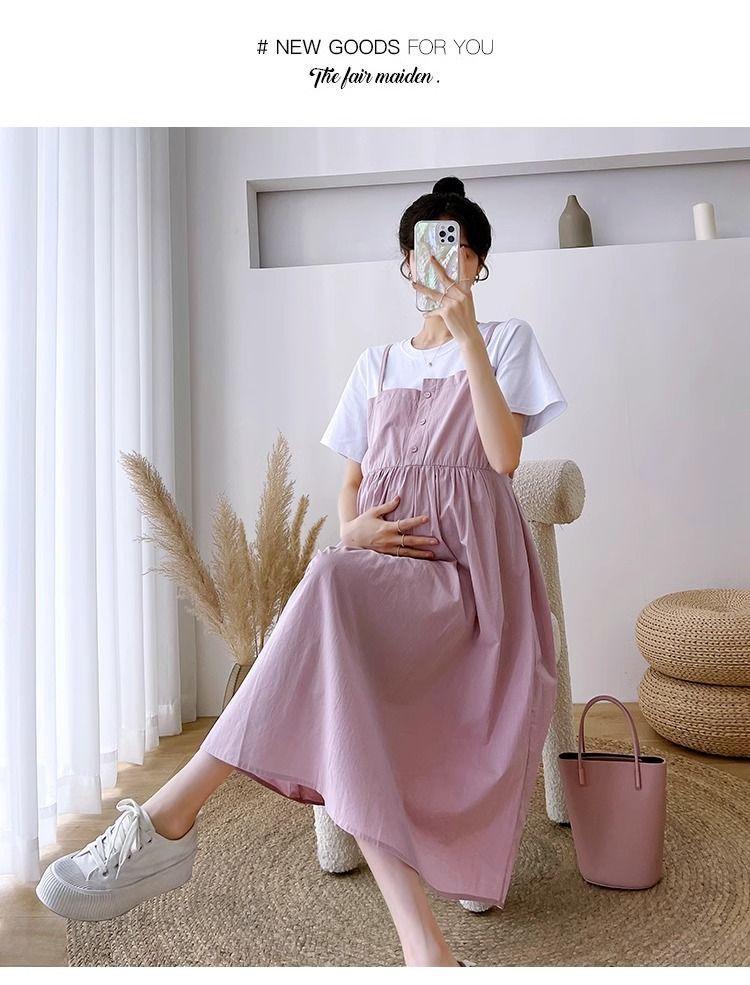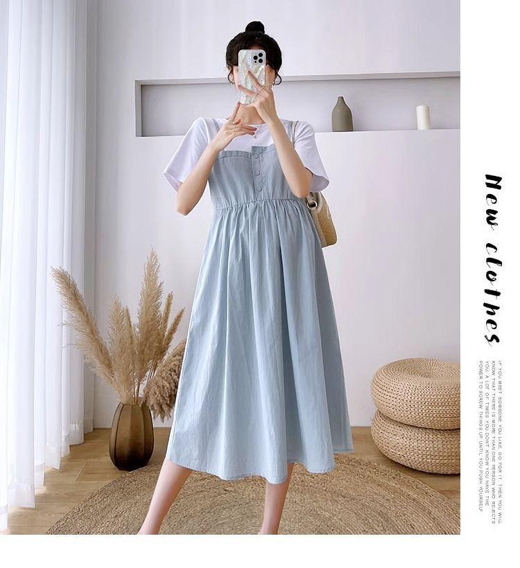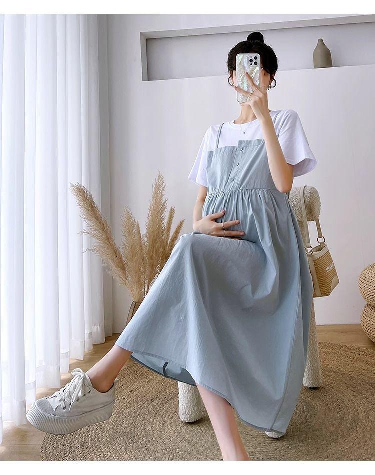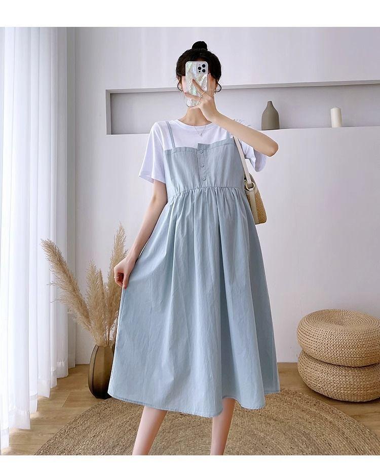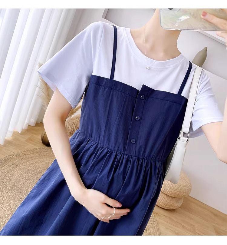 Ropa de Maternidad Vestido Nuevo de Verano Talla Grande Look Adelgazante Falda Midi Vestido Holgado con Parche de Dos Piezas Falsas Cubre Vientre para Madre Embarazada