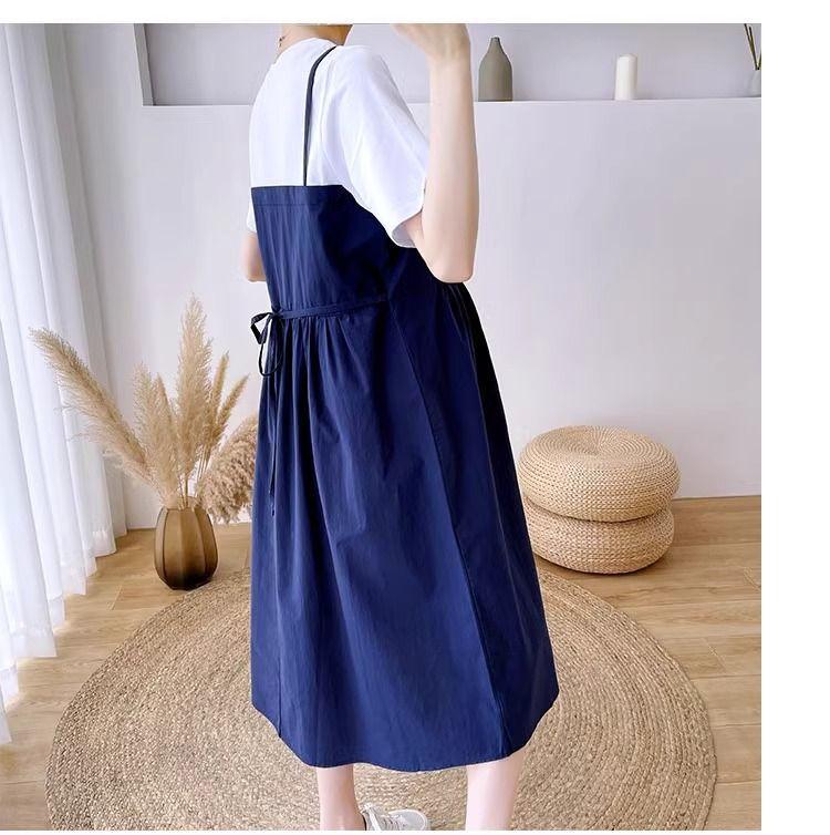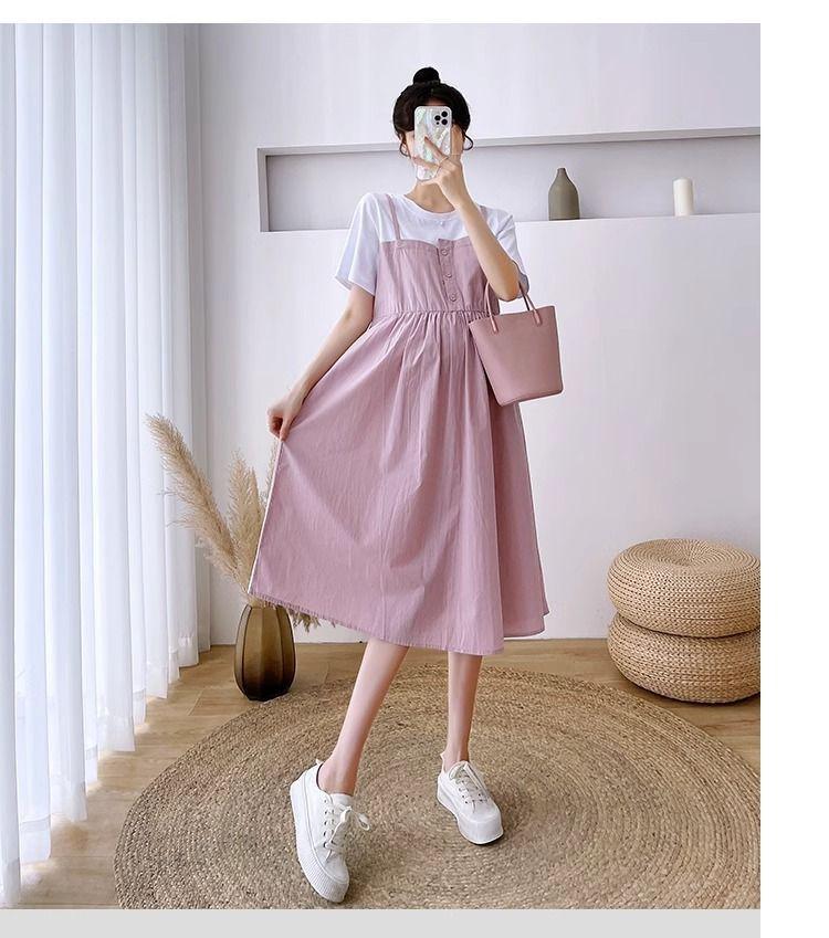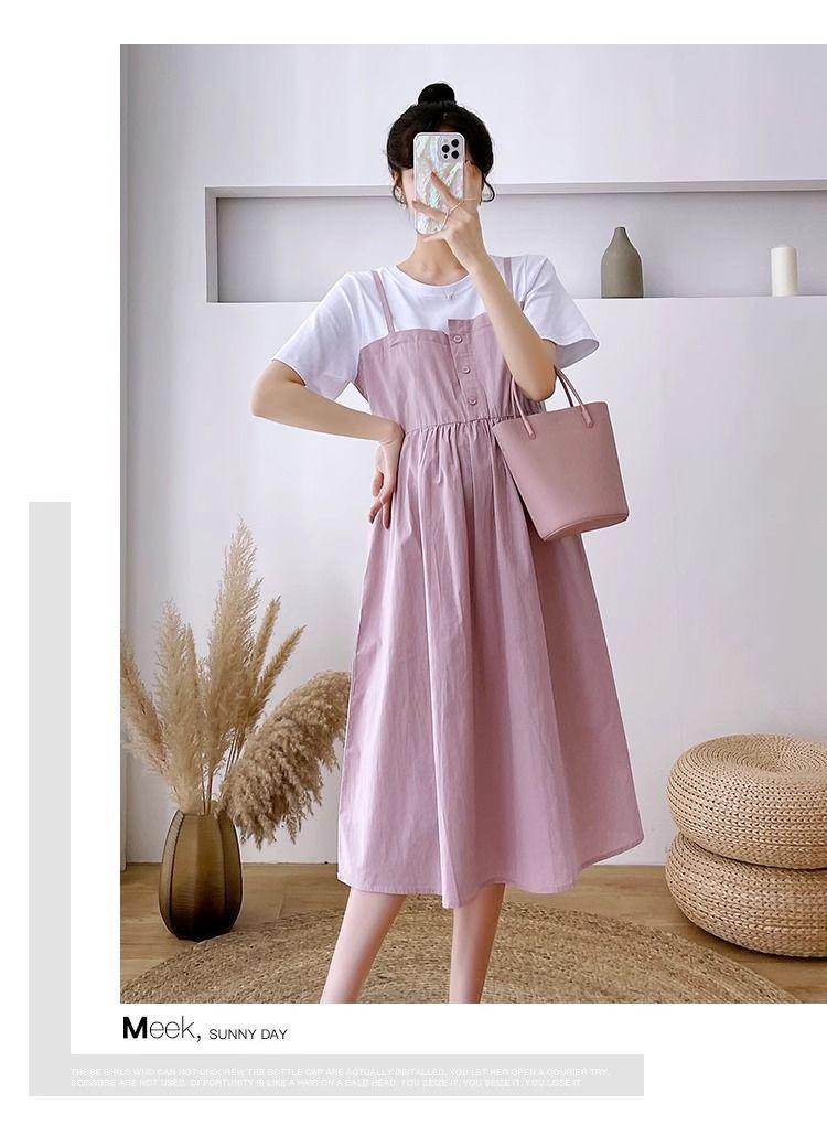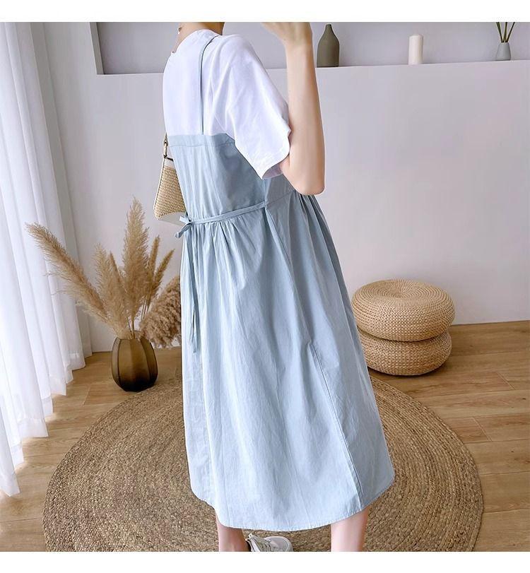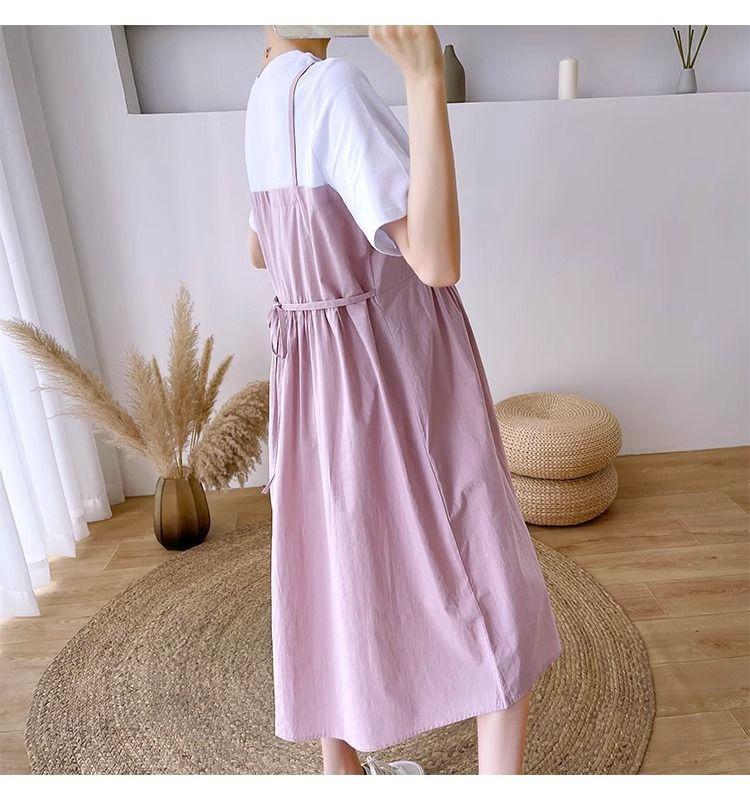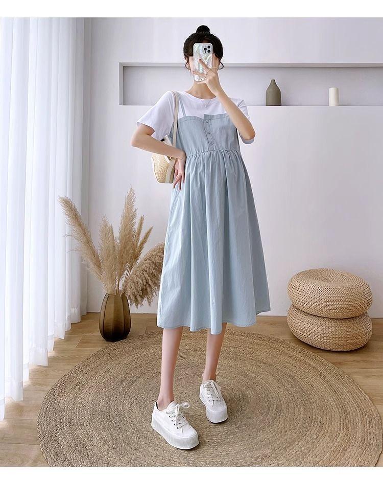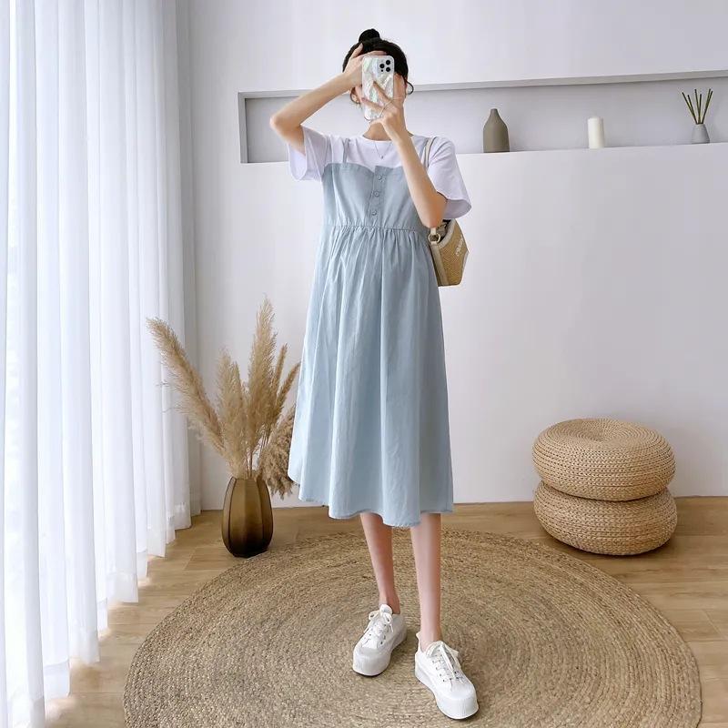Ropa de Maternidad Vestido Nuevo de Verano Talla Grande Look Adelgazante Falda Midi Vestido Holgado con Parche de Dos Piezas Falsas Cubre Vientre para Madre Embarazada