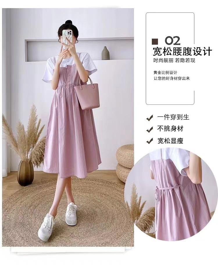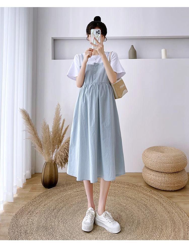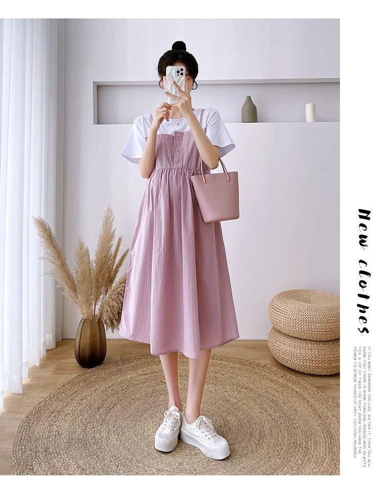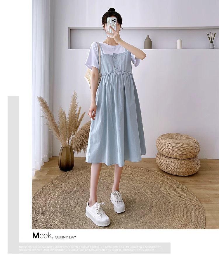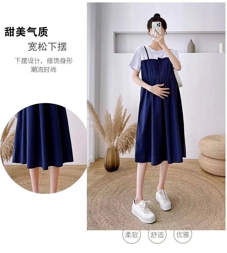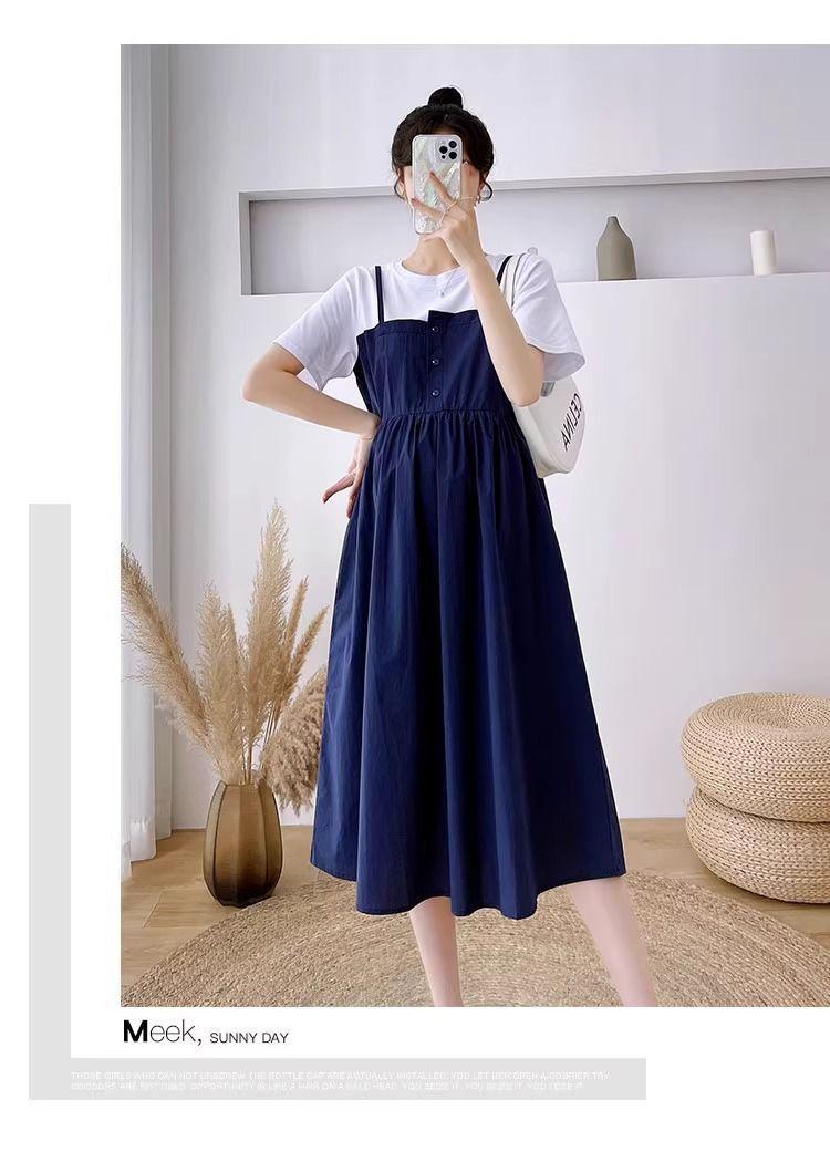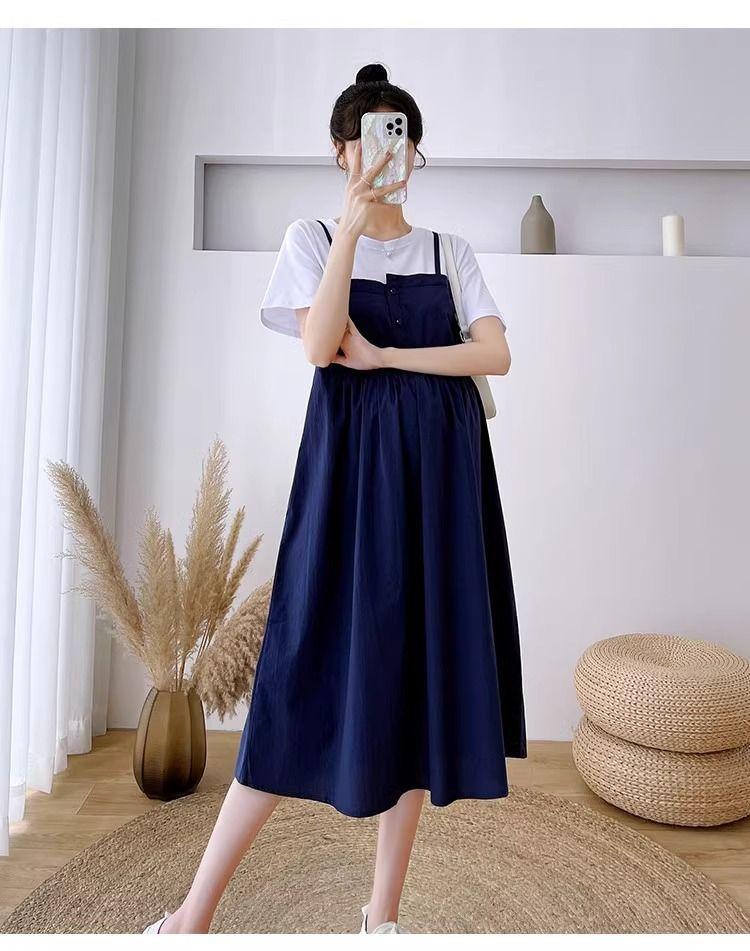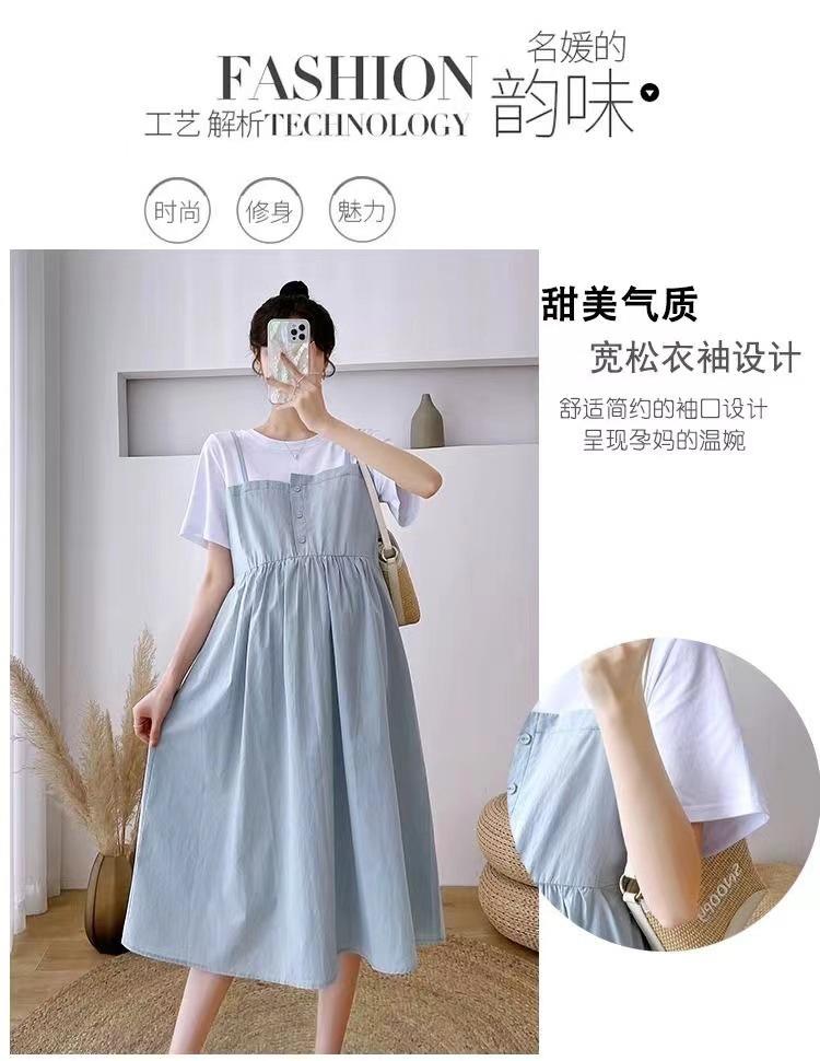 Ropa de Maternidad Vestido Nuevo de Verano Talla Grande Look Adelgazante Falda Midi Vestido Holgado con Parche de Dos Piezas Falsas Cubre Vientre para Madre Embarazada