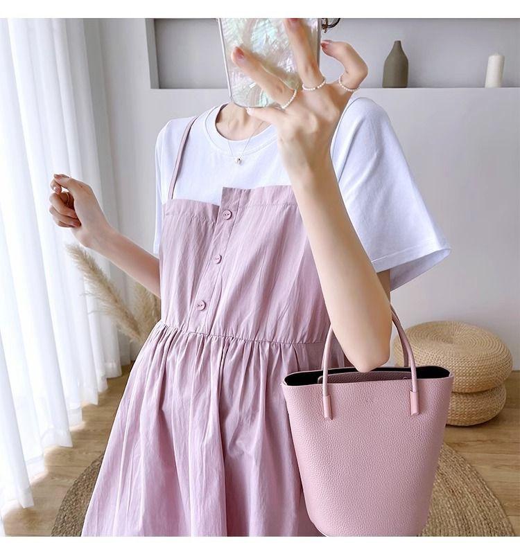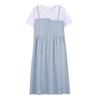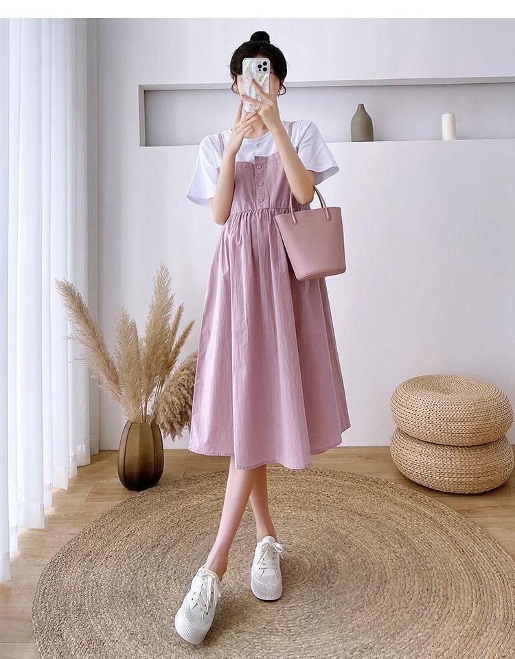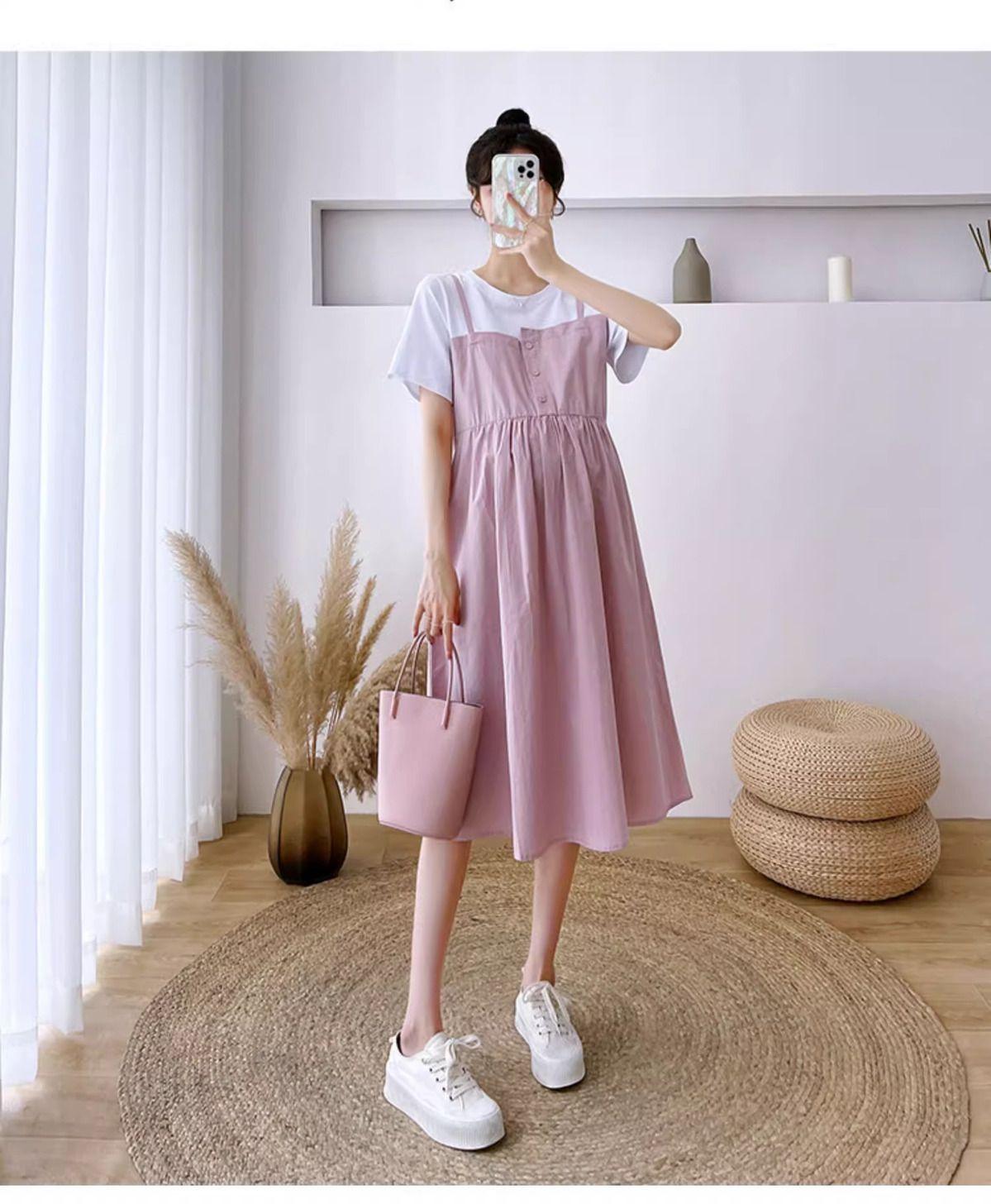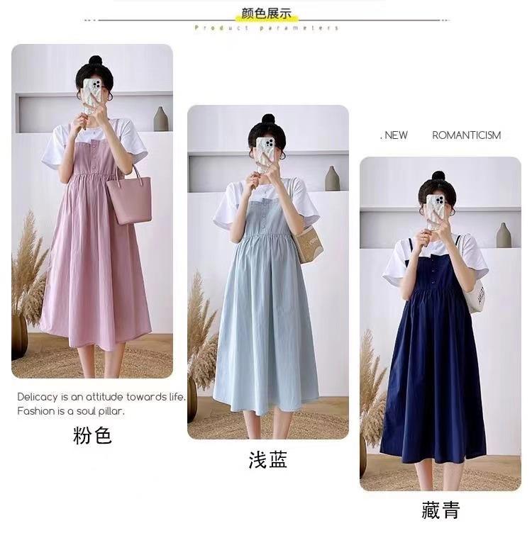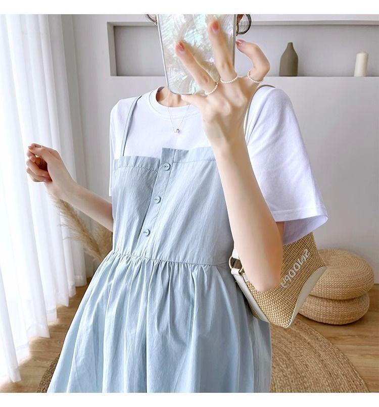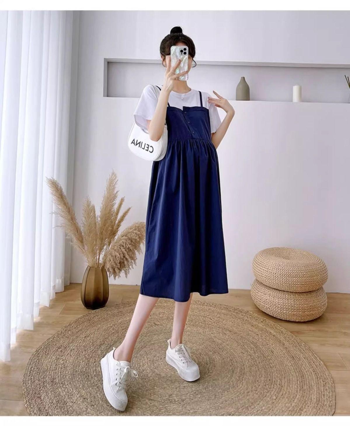 Ropa de Maternidad Vestido Nuevo de Verano Talla Grande Look Adelgazante Falda Midi Vestido Holgado con Parche de Dos Piezas Falsas Cubre Vientre para Madre Embarazada
