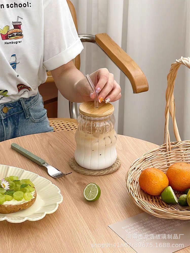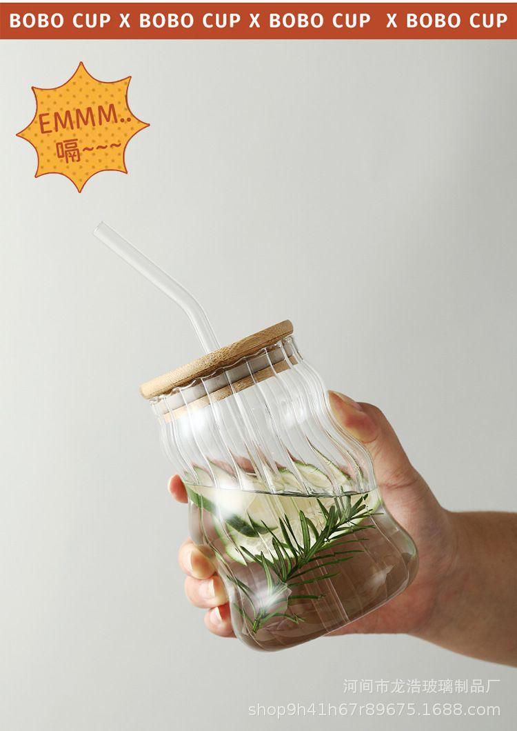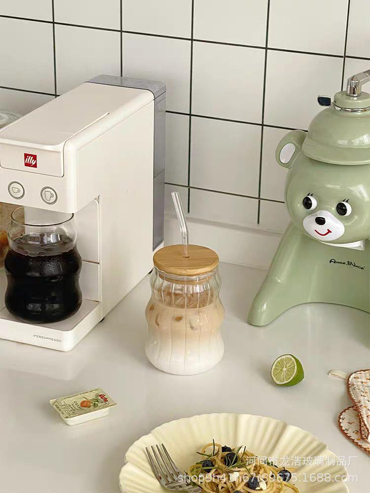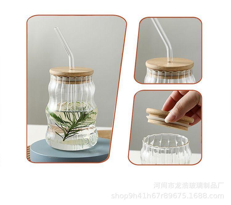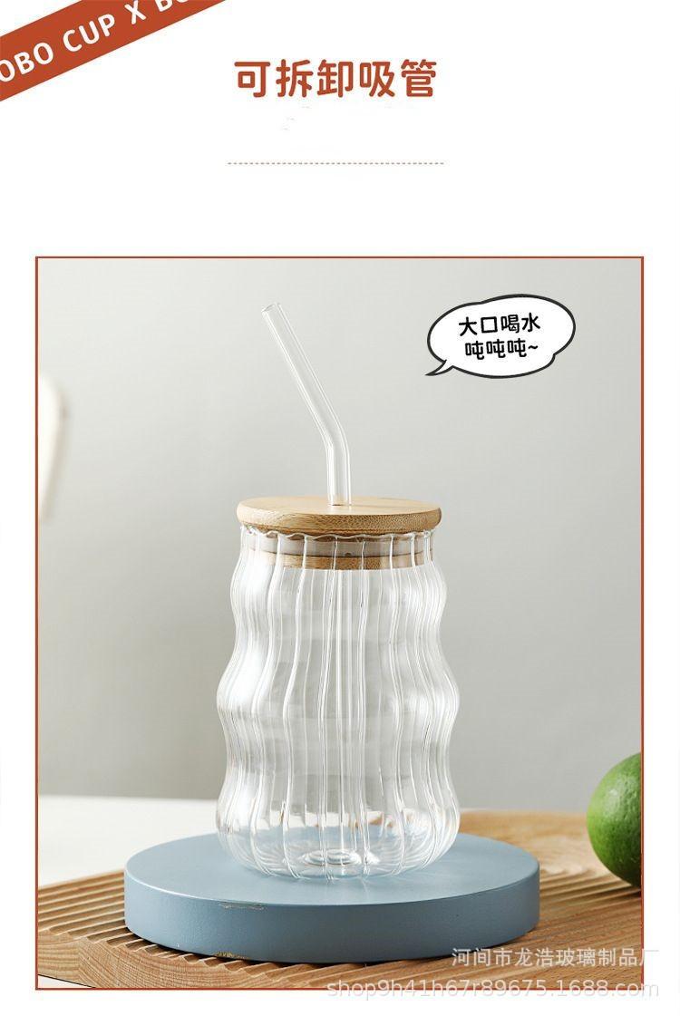 Taza de Café con Leche Transparente de Alto Valor de Color Estilo Ins, Taza Caterpillar de Gran Capacidad con Tapa y Popote, Vaso de Vidrio con Grano Vertical