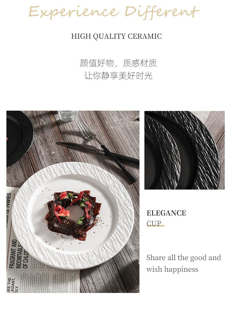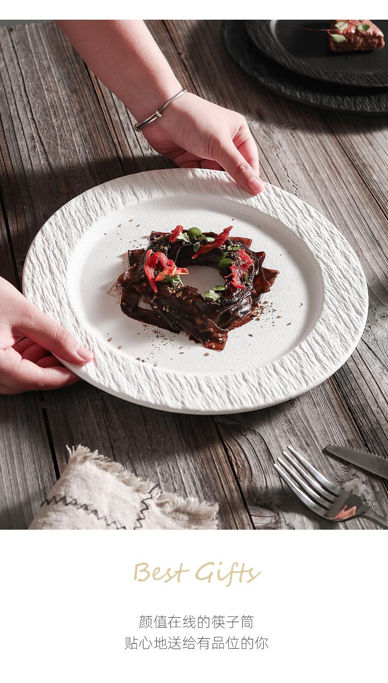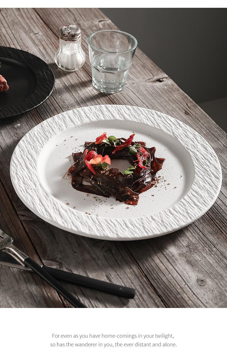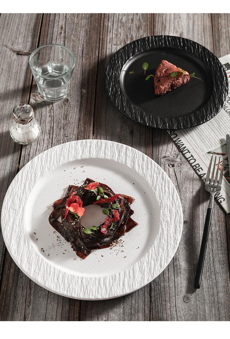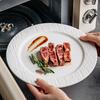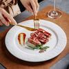 Plato de carne de restaurante, plato occidental, plato blanco doméstico, plato plano de pasta para desayuno de lujo ligero y de alta calidad.