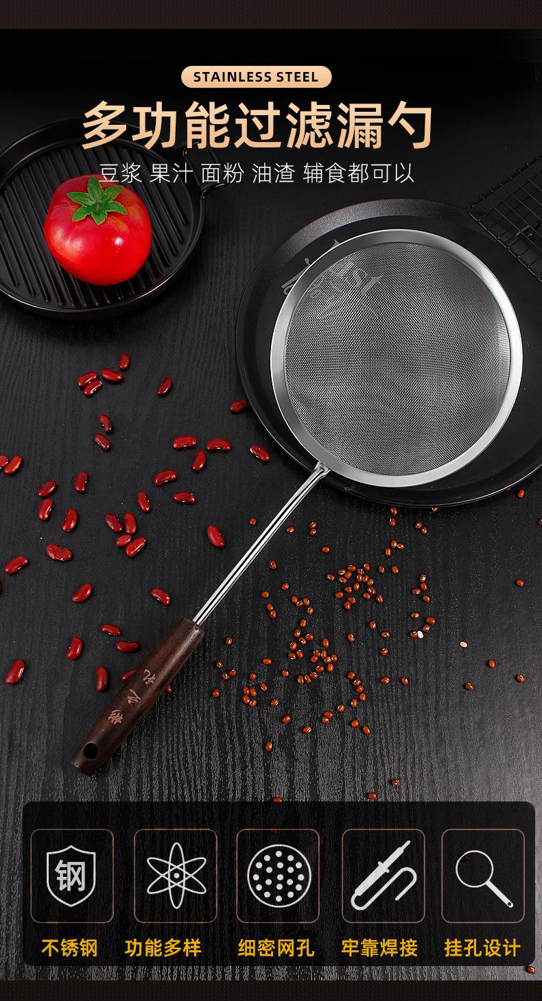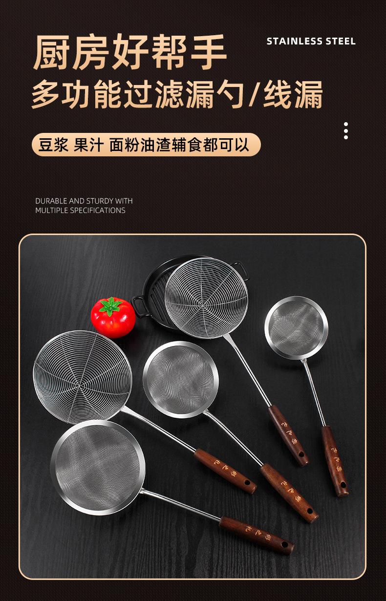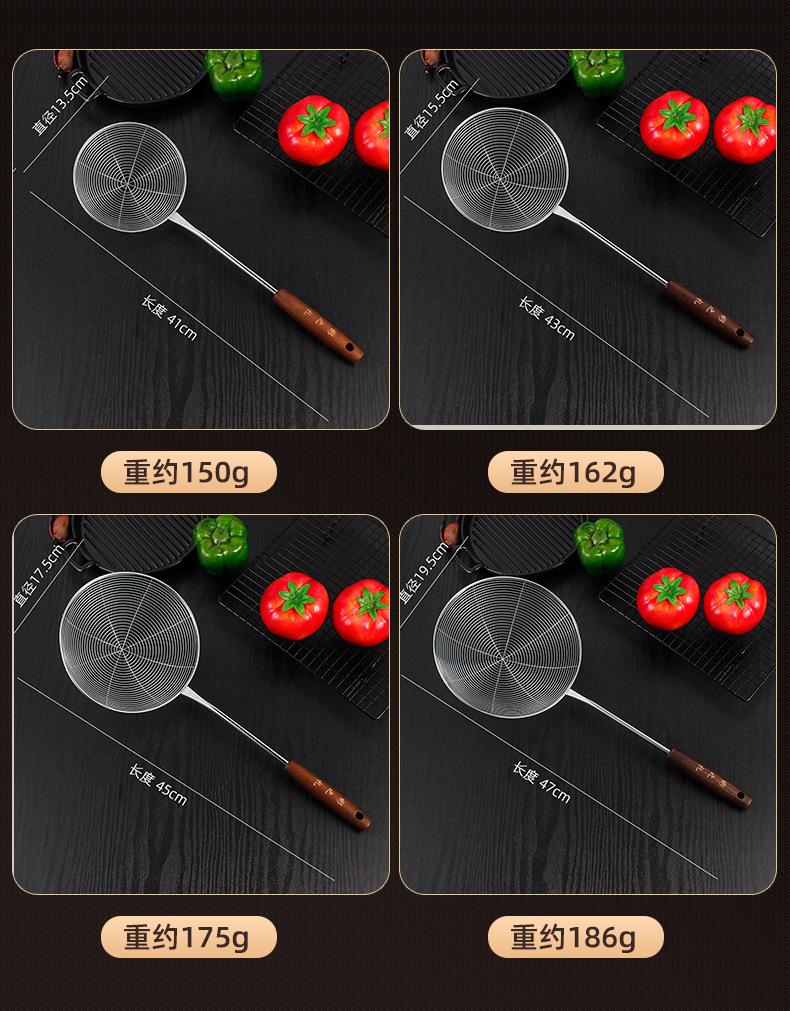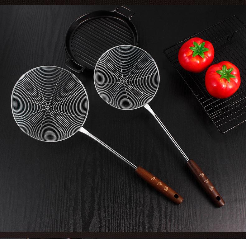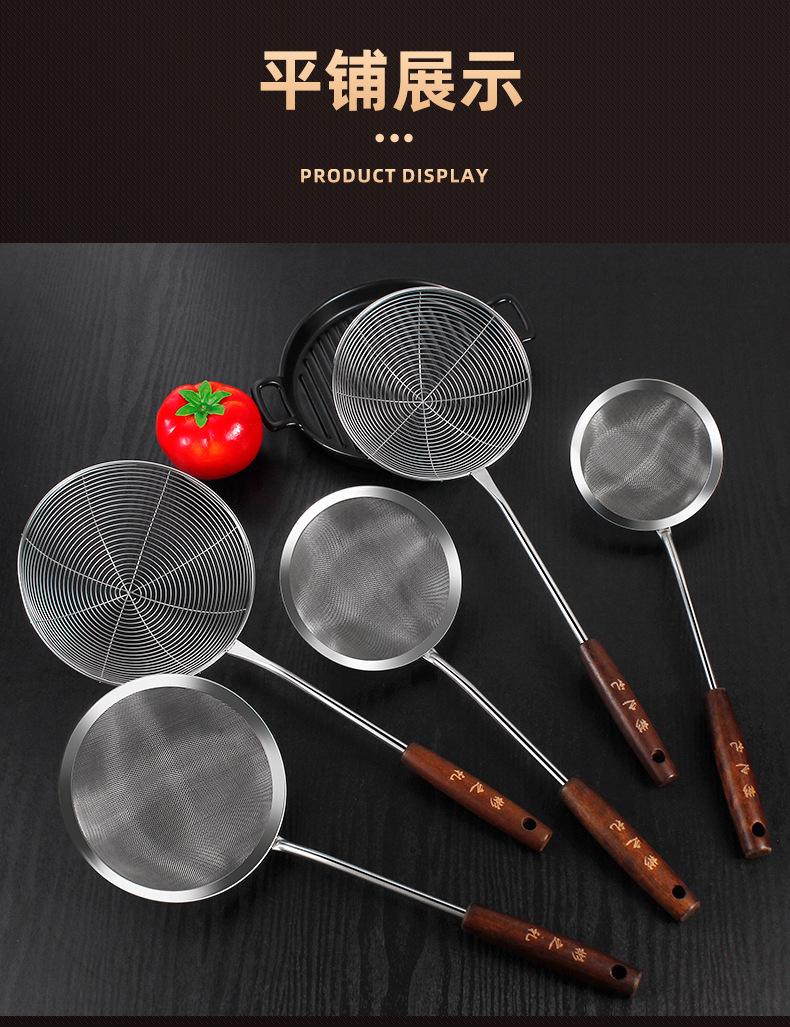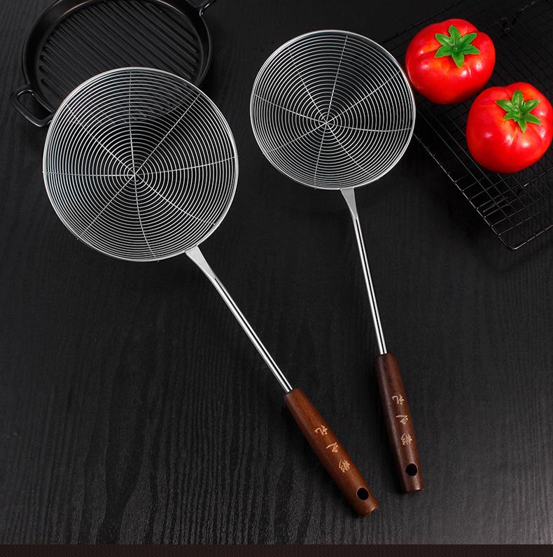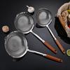 Colador de acero inoxidable con mango de madera retro, colador de línea, colador frito, colador grande para el hogar, colador de red para ollas calientes, salida de fábrica