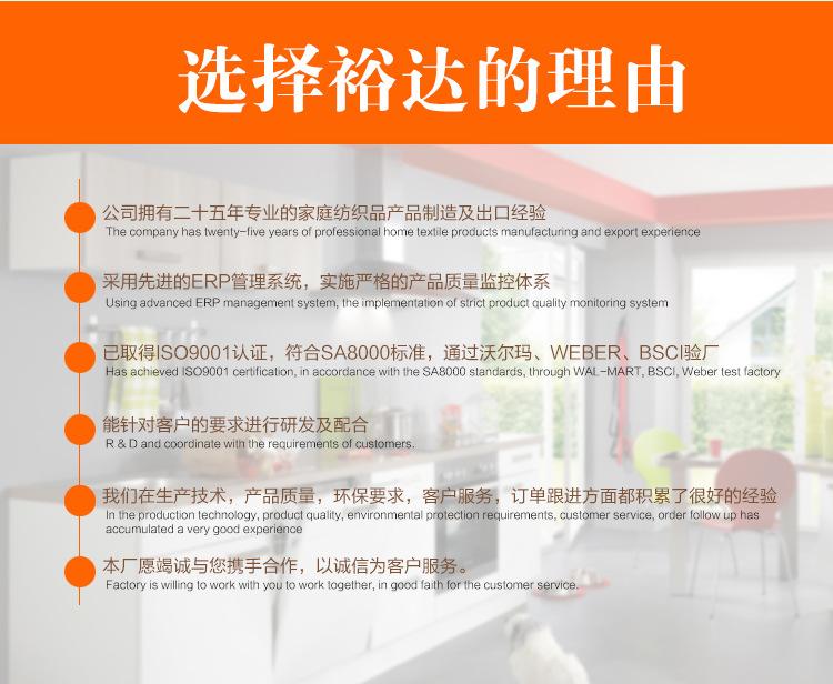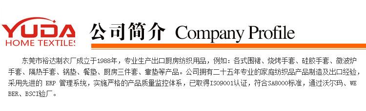 Dongguan Yuda Garment Factory se fundó en 1988 y se especializa en la producción y exportación de productos textiles para la cocina, como delantales, guantes para barbacoa, guantes de silicona, guantes para microondas, guantes aislantes del calor, manteles individuales, juegos de cocina de tres piezas, cojines y otros productos. La empresa cuenta con 25 años de experiencia profesional en la fabricación y exportación de productos textiles para el hogar. Adopta un avanzado sistema de gestión ERP e implementa un estricto control de calidad. Obtuvo la certificación ISO9001, cumple con las normas SA8000 y superó las inspecciones de fábrica de Walmart, Weber y BSCI. Sus productos se venden principalmente a Estados Unidos, Europa, Australia, Japón y otros países. Contamos con una sólida experiencia en tecnología de producción, calidad de productos, requisitos de protección ambiental, servicio al cliente y seguimiento de pedidos. Realizamos investigación, desarrollo y cooperación según las necesidades del cliente, de acuerdo con las necesidades y tendencias del mercado internacional. Nos enorgullecemos de completar todos los pedidos de manera puntual y eficiente. Nuestro profesionalismo, integridad, compromiso y dedicación al servicio son la base de nuestro desarrollo continuo. Nuestro mayor deseo es servirle con total dedicación. Nuestra fábrica está dispuesta a colaborar con usted con dedicación y a servir a nuestros clientes con integridad.