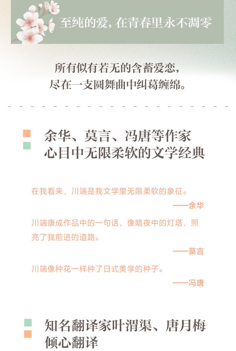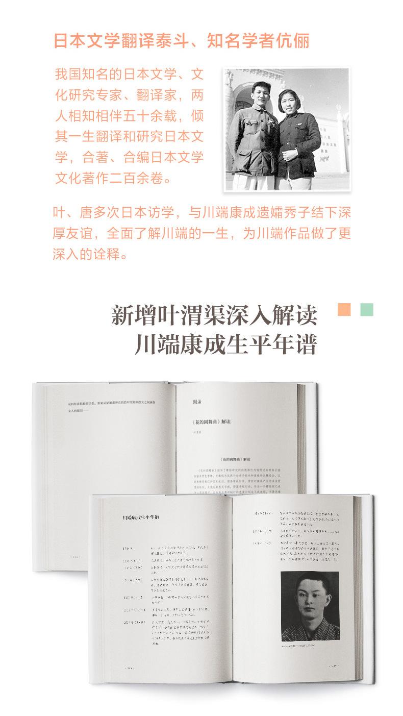 "Kawabata Yasunari, una figura destacada de la literatura japonesa, un escritor sensacionista, y un novelista muy conocido. Se hizo famoso en 1927 con la novela autobiográfica "La bailarina de Izu". En 1968, escribió tres obras representativas, "País de nieve", "La antigua capital" y "Mil grullas" Ganó el Premio Nobel de Literatura. Sus obras heredan el encanto inherente del "mono-sei" y la "elegancia" de la literatura clásica japonesa, y expresan agudamente la comprensión de la esencia de la vida con excelentes habilidades narrativas. Ye Weiqu y Tang Yuemei son estudiosos muy conocidos. Traductores. En 1952, ambos fueron admitidos en el Departamento de Lenguas y Literatura Orientales de la Universidad de Pekín. En 1956, se graduaron y se casaron. También tradujeron las obras de Kawabata Yasunari y coescribieron "Historia de la literatura japonesa". En los años restantes, ha co-traducido, co-escrito y co-editado más de 200 volúmenes de obras sobre literatura y cultura japonesa."