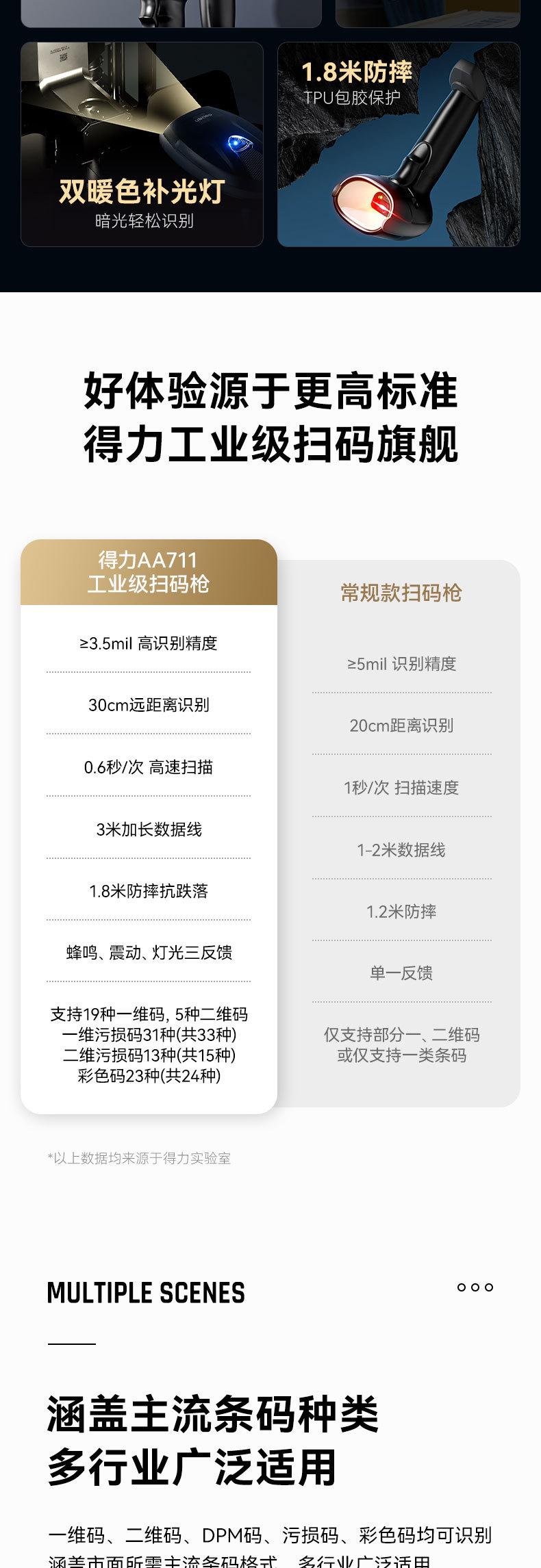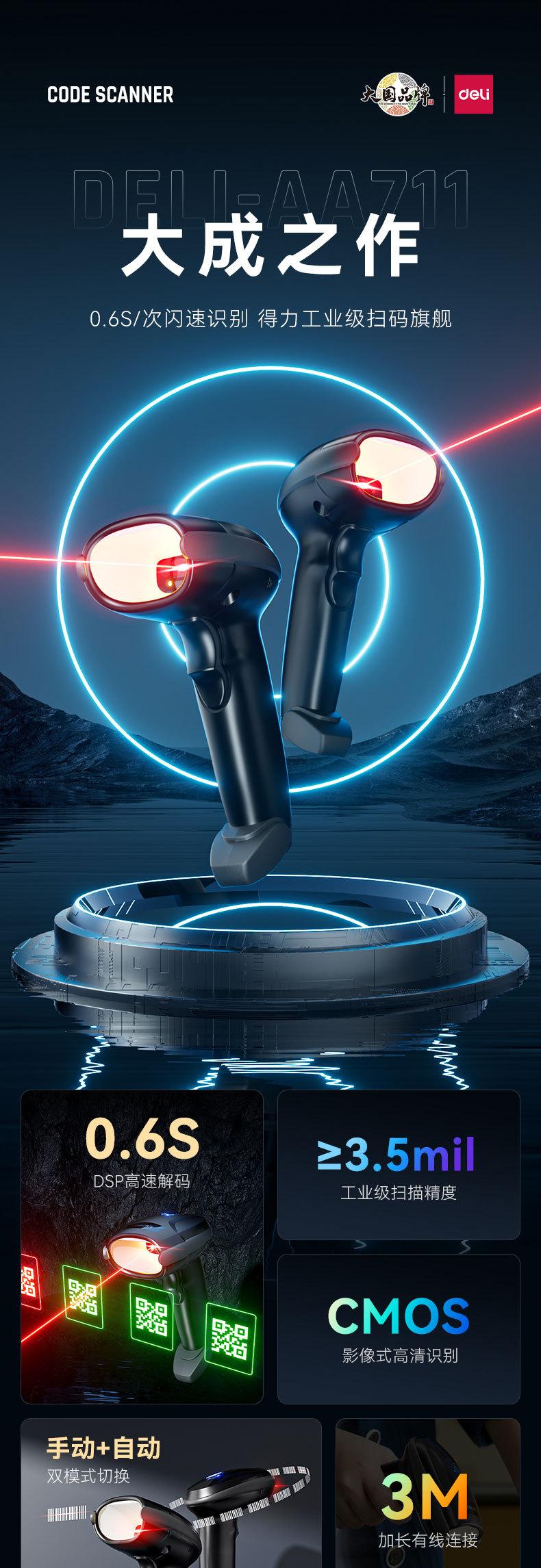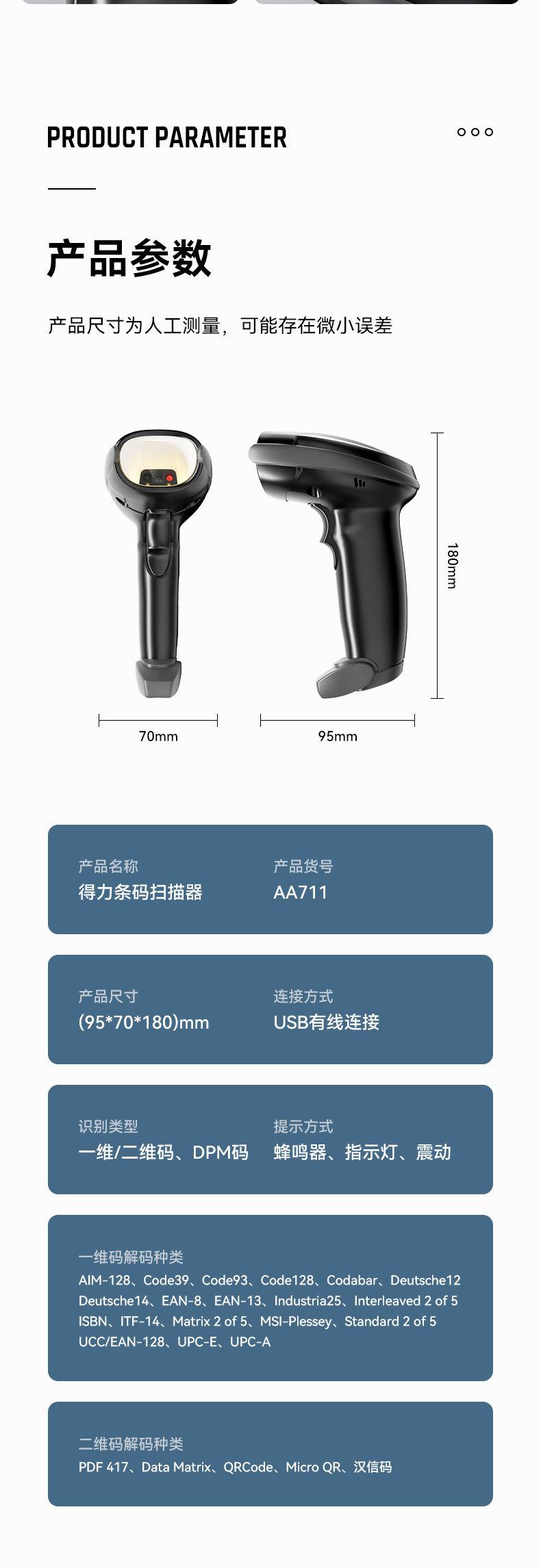 Pistola de escaneo de código industrial Deli AA711, escáner de código de barras de alta precisión y sensibilidad con cable para caja registradora de supermercado bidimensional