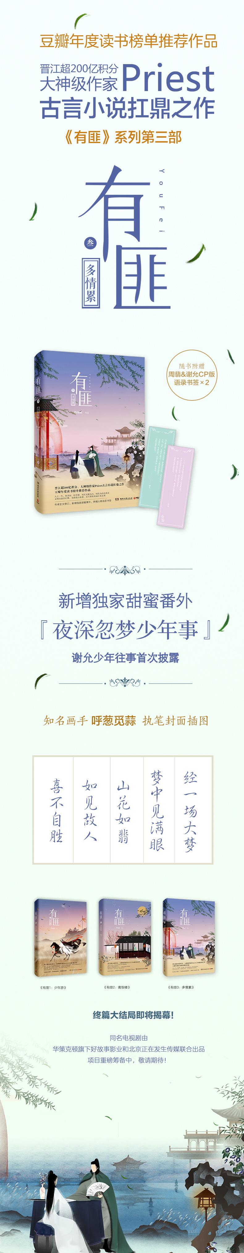 Jinjiang cuenta con más de 20 mil millones de puntos, y la obra maestra de Priest, un gran escritor de novelas chinas antiguas, está recomendada en la lista anual de lectura de Douban: ¡la tercera parte de la serie "You Fei"! El final está a punto de revelarse. El incendio en Huojiabao no quemó los cimientos de Huojiabao, pero encendió la llama en los corazones de los practicantes de las artes marciales de las Llanuras Centrales. Nacieron los "Héroes de la Expedición del Norte", y la ambición de Huo Liantao era evidente. Sin embargo, desconocía la historia interna y no esperaba que un extraño patrón de ondas de agua en el sello Shendu le causara problemas. La Montaña de los Muertos Vivientes, Beidou e incluso la Corte Sur, entusiasmados por "Mar y Cielo en un Solo Color", se reunieron en Yongzhou debido a este patrón de ondas de agua, y la situación en las artes marciales de las Llanuras Centrales sufrió una nueva reorganización. Al mismo tiempo, Zhou Fei y su grupo siguieron la pista de Xie Yun y llegaron a Yongzhou, que se encontraba en una situación precaria. Las manos frías de Xie Yun, las toxinas reprimidas durante tanto tiempo en su cuerpo y su pasado desconocido oprimían el corazón de Zhou Fei como una montaña. El antídoto contra Touguqing y el secreto de "el mar y el cielo son del mismo color" apuntaban al Qimendi perdido hace mucho tiempo...