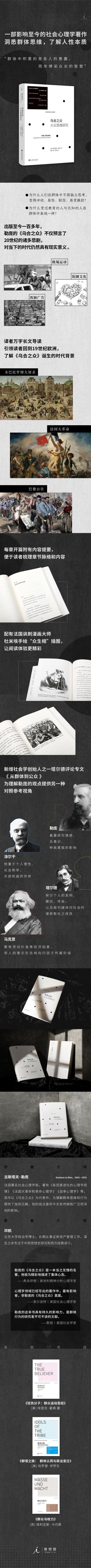 ★ Incluido especialmente: introducción de 10,000 palabras de largo por el traductor + ilustraciones dibujadas a mano de "Todos los seres" por el caricaturista satírico francés Daumier + "De la multitud al público" de Tarde, un sociólogo contemporáneo de Le Bon. Este libro viene acompañado especialmente de una larga introducción escrita por el traductor, que nos lleva de vuelta a la Europa del siglo XIX cuando Le Bon vivió, analizando el contexto económico, político y cultural de la escritura de Le Bon, y explorando profundamente por qué Le Bon estaba tan conmocionado y temeroso de la "Era de la Multitud"; también proporciona una comparación de diferentes puntos de vista de sociólogos famosos de la época de Le Bon, como Durkheim y Tarde. En el choque de ideas, podemos comprender más claramente la difícil situación de Francia e incluso de Europa en ese momento, y así entender mejor el mundo actual. El libro está acompañado de muchas ilustraciones dibujadas a mano de "Todos los seres" por el caricaturista satírico francés Daumier. Etc.