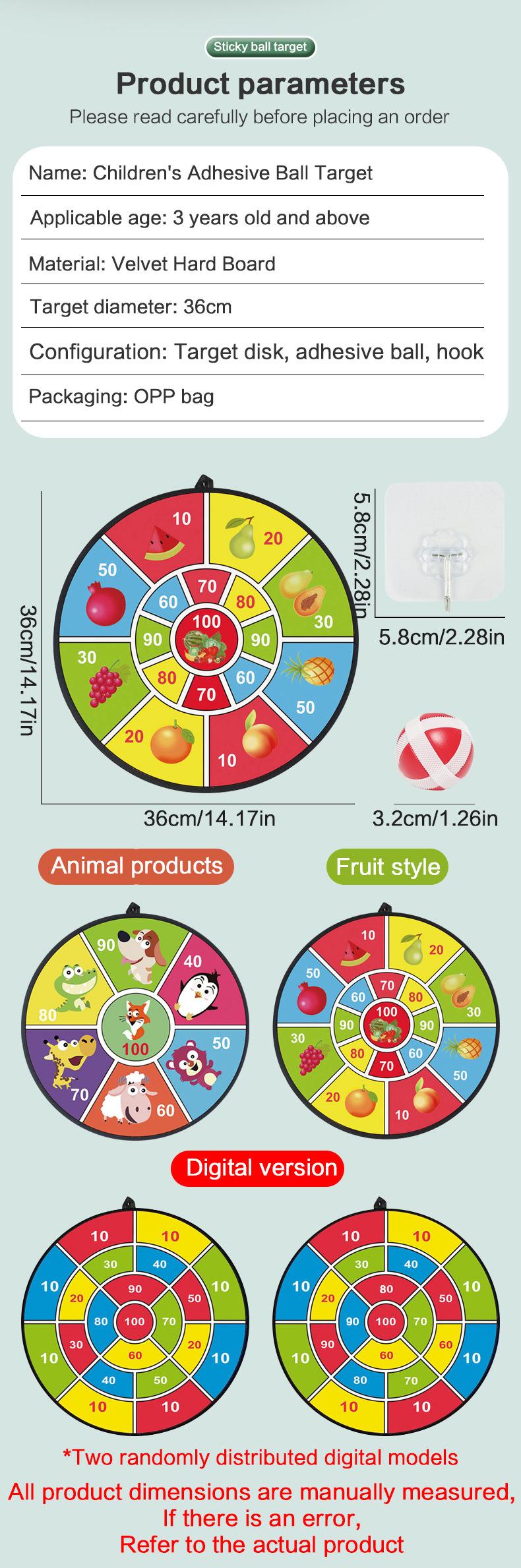 | Plato duro de 36 cm | Número 100, animales, frutas | Bolsa de polipropileno | Objetivo + gancho + 3 bolas(Color aleatorio) | 36*36centímetro | 120 | 75*40*79 |