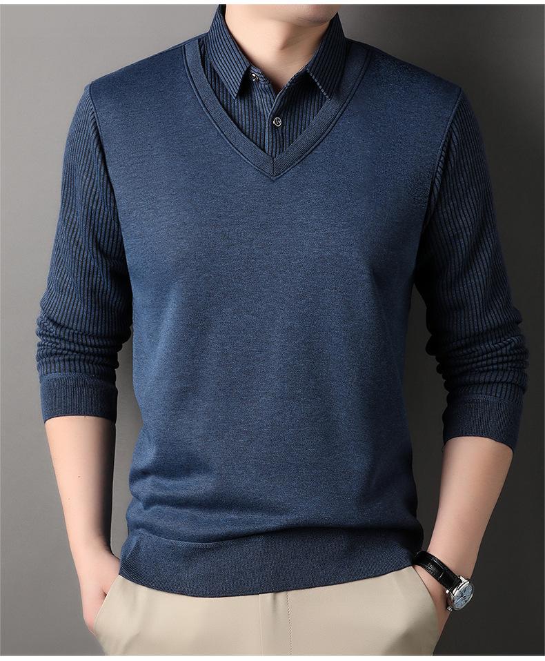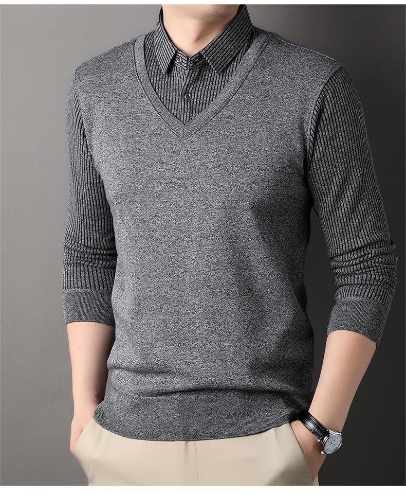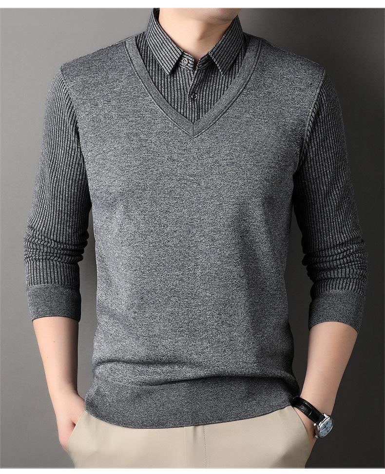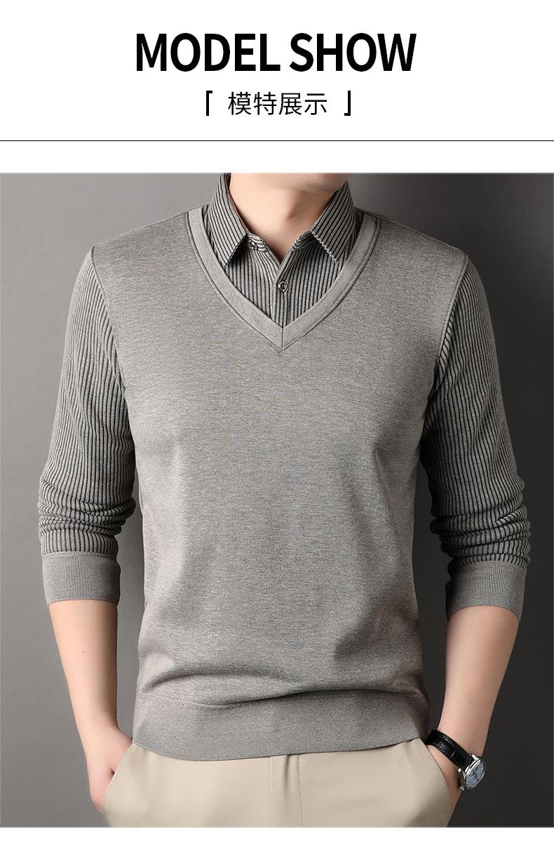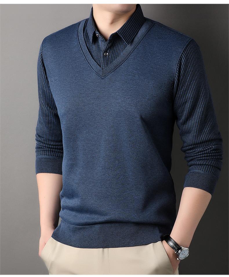 Otoño e invierno 2023, nuevo cárdigan de punto de dos piezas falso para hombre, versátil abrigo con cuello de camisa, suéter para hombre, ropa interior, comercio exterior