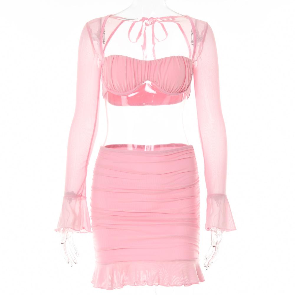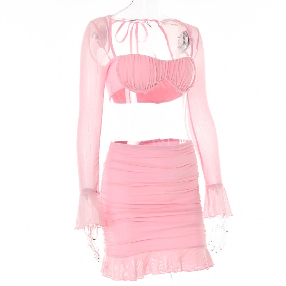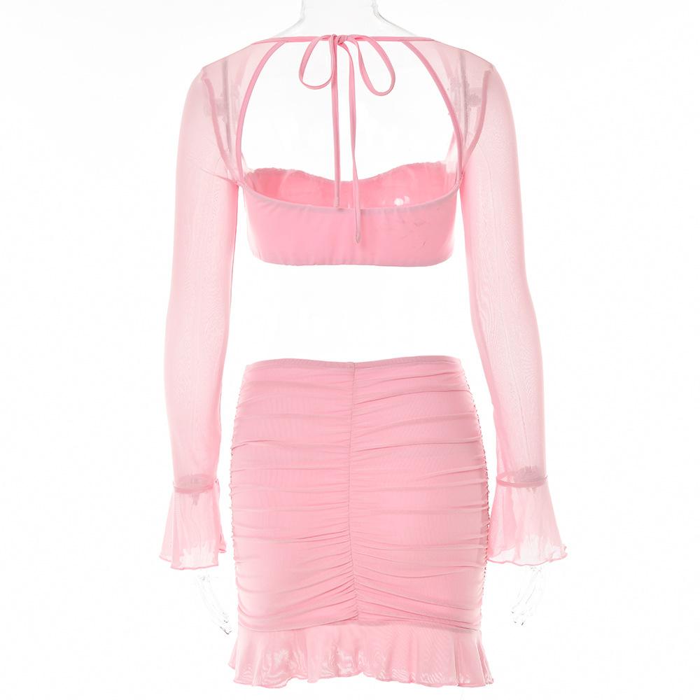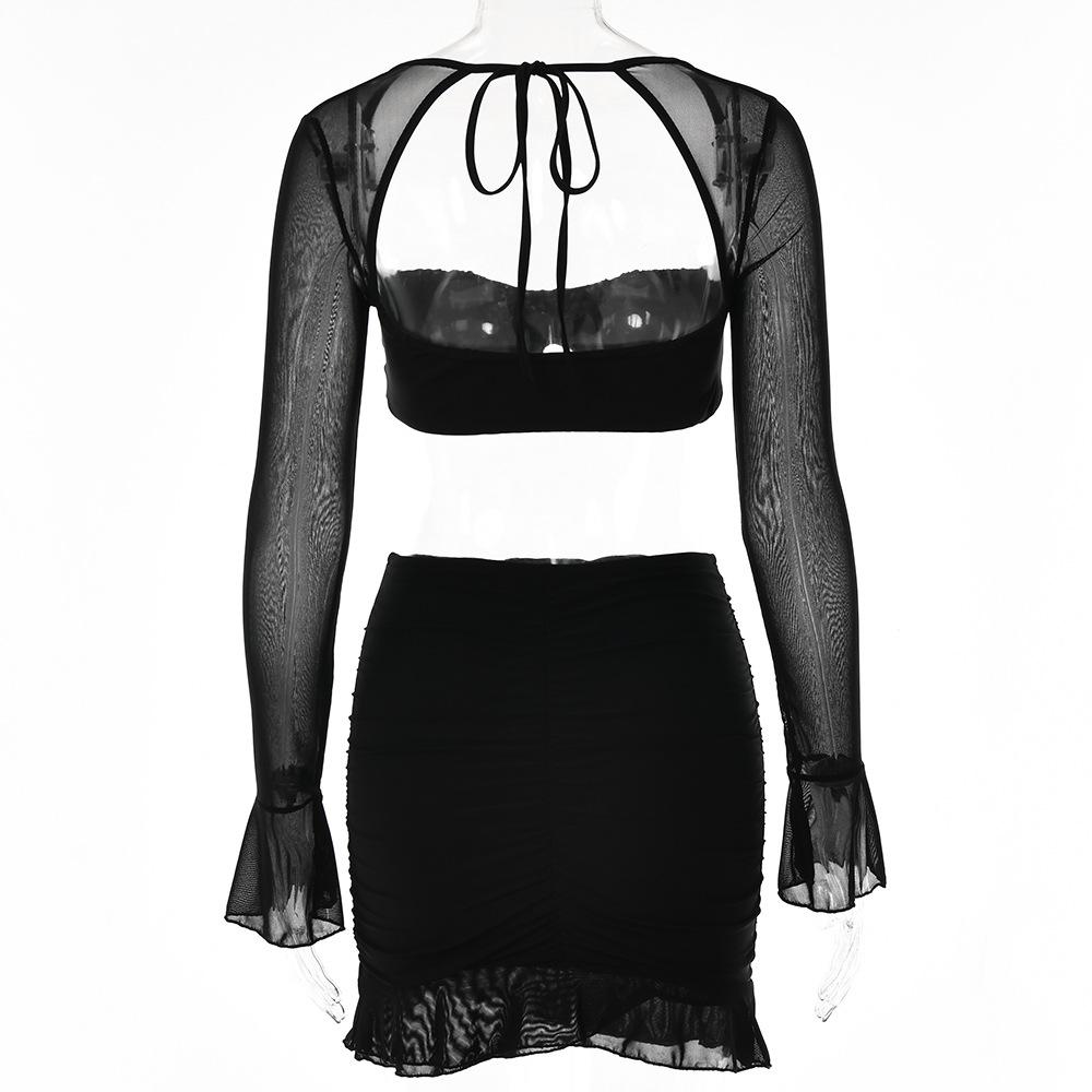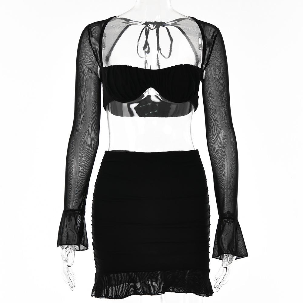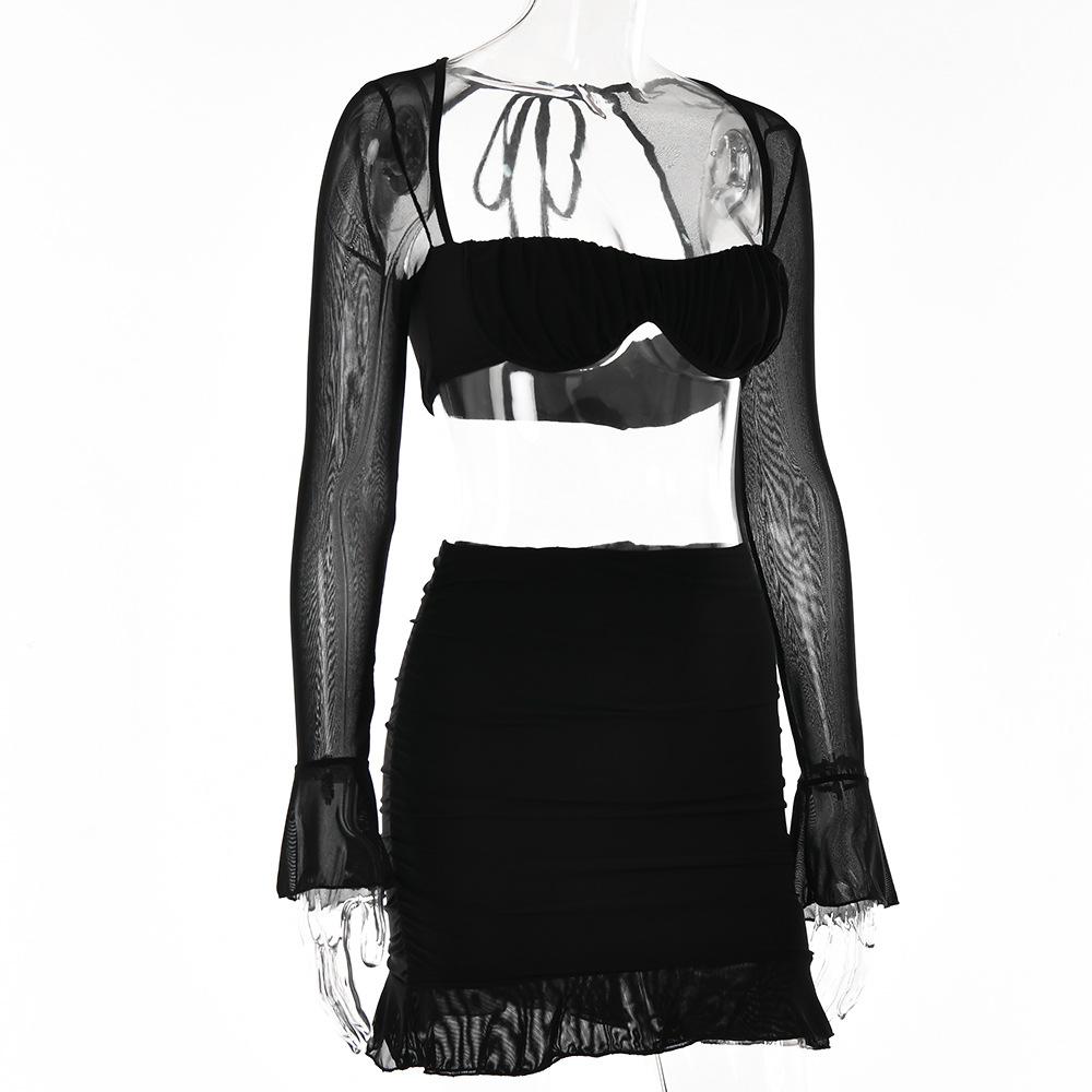 Conjunto Sexy de Dos Piezas sin Tirantes Transfronterizo Europeo y Americano para Mujer Otoño Nueva Moda Gasa con Perspectiva Tirantes Falda Corta de Manga Larga