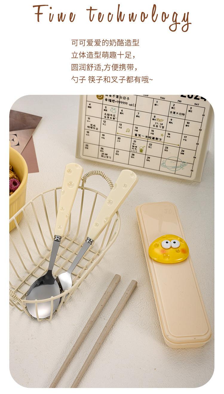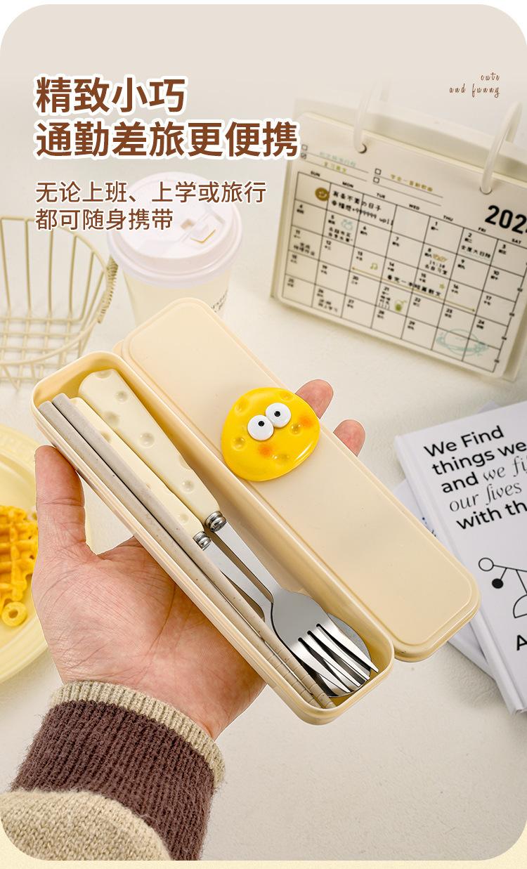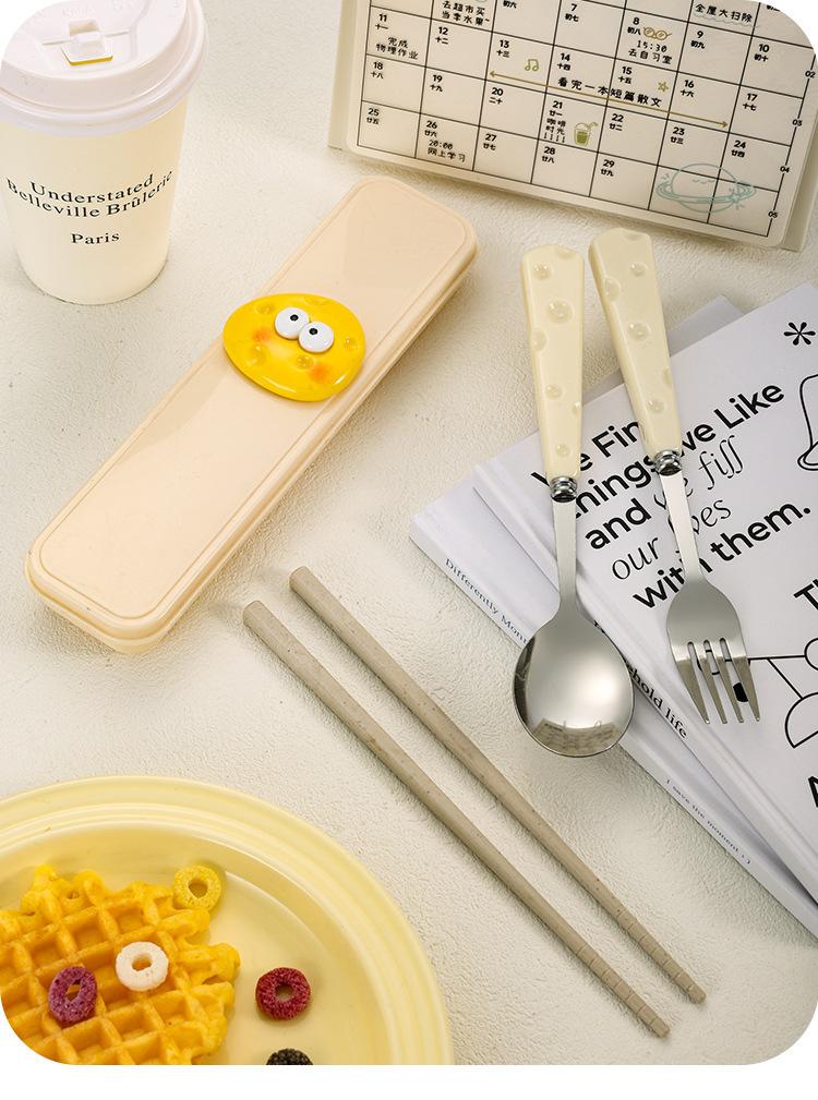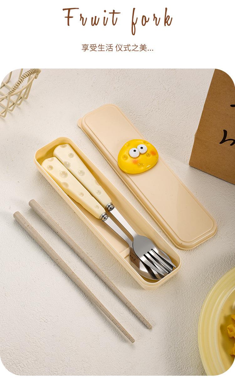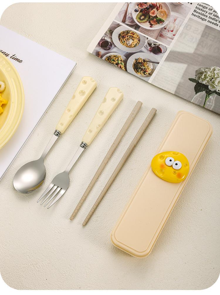 Juego de tres piezas de cuchara, tenedor y palillos de queso con diseño popular y bonito para estudiantes y niños, caja de almacenamiento de vajilla portátil.