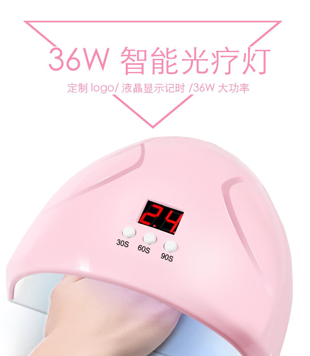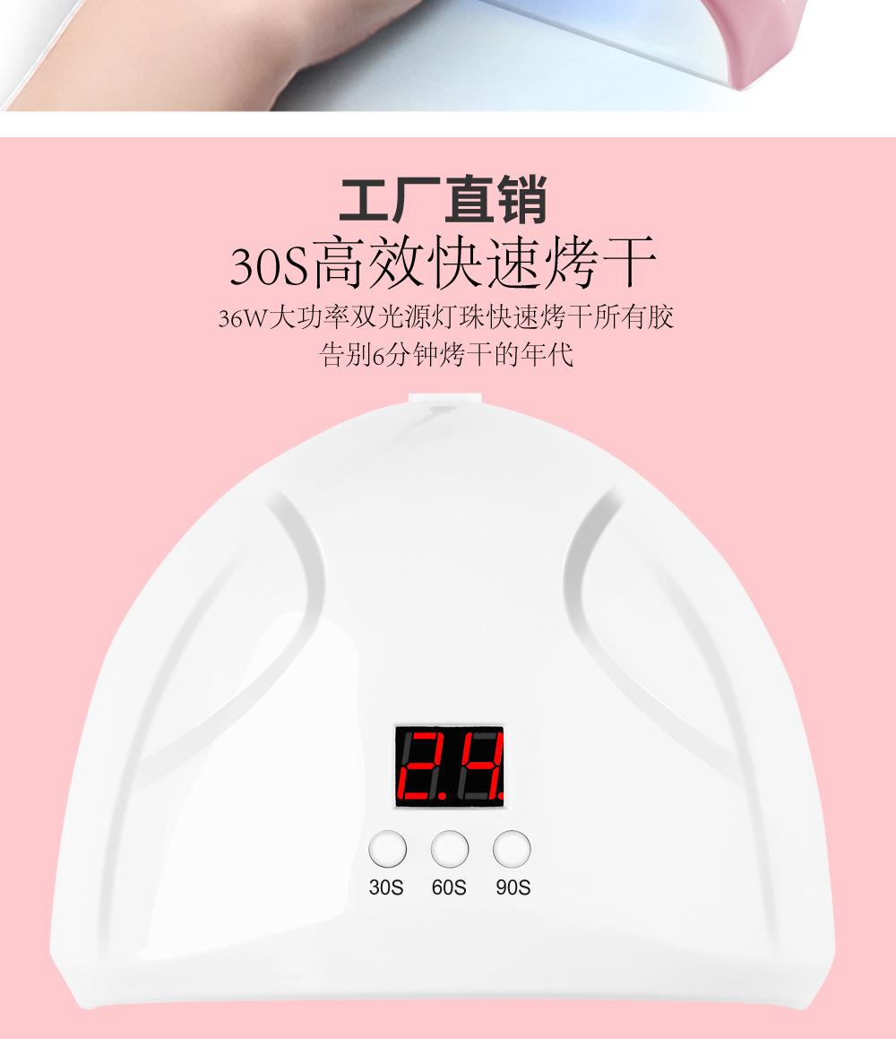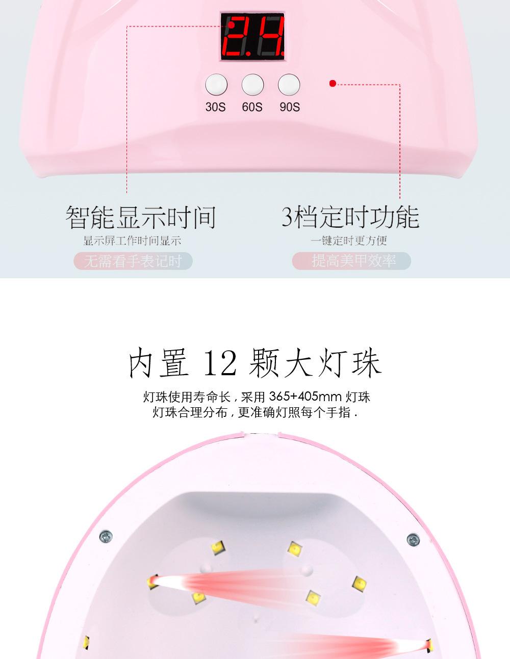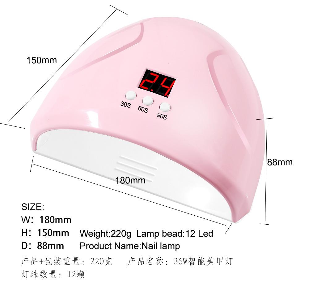 36W de alta potencia, 12 perlas de fuente de luz LED, seca todo el esmalte de uñas, la fuente de luz no daña los ojos, no oscurece las manos, no pica y tiene 3 funciones de temporización. |