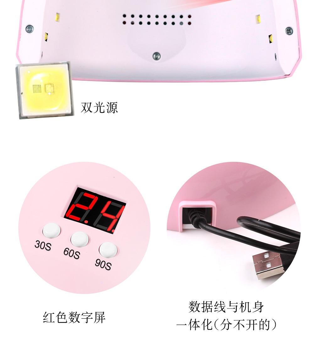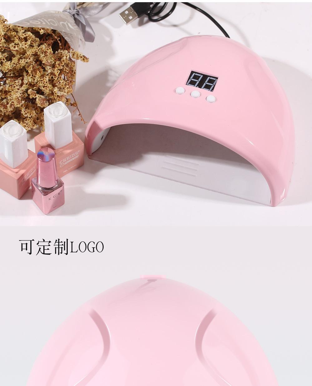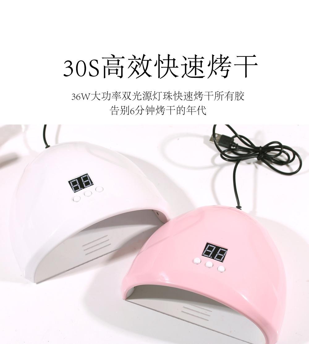 La lámpara LED para uñas de 36W viene estándar con un enchufe USB. 36W de alta potencia, 12 cuentas de fuente de luz LED, seca todo el esmalte de uñas, la fuente de luz no daña los ojos, no oscurece las manos, no pica y tiene 3 funciones de temporización.