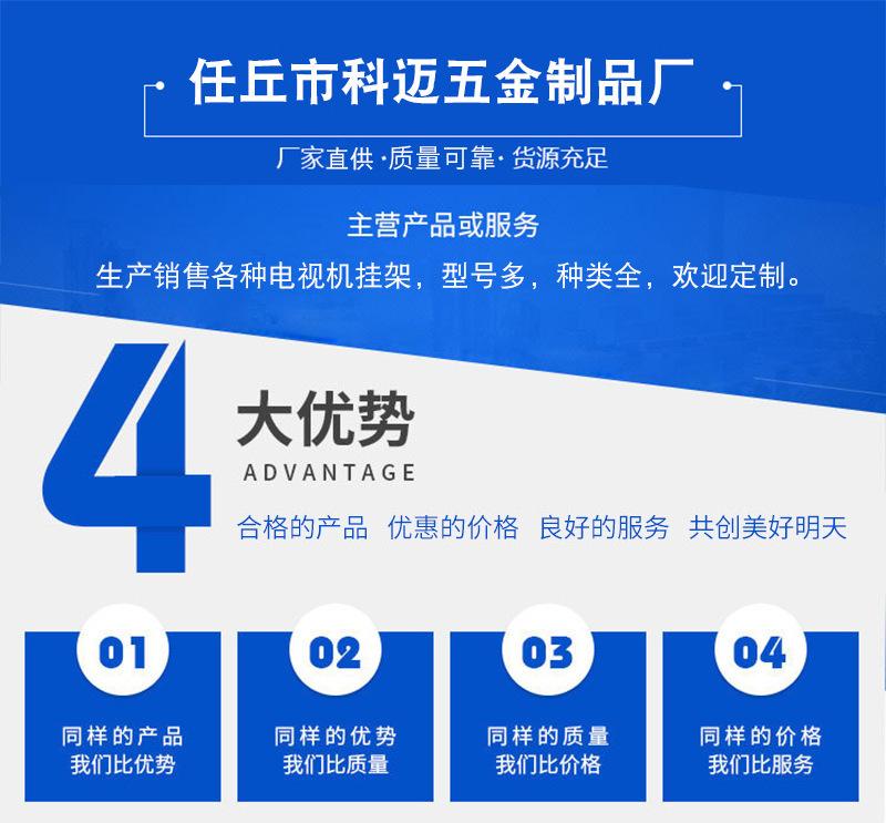 Renqiu Kemai Hardware Products Factory es un fabricante profesional de soportes para TV, soportes para TV, colgadores para TV, soportes para audio, soportes para aire acondicionado, etc. Nuestra fábrica cuenta con una amplia gama de equipos: punzonadoras de 250T, punzonadoras de 125T, punzonadoras de 80T, punzonadoras de 63T, punzonadoras de 45T, dobladoras, cizallas y otros equipos. Contamos con más de 15 empleados en nuestra línea de producción. Contamos con un equipo de ventas profesional. Exportamos a India, África, Sudeste Asiático, Europa y otras regiones durante todo el año. Contamos con una amplia experiencia en exportación. Le invitamos a conversar sobre negocios.