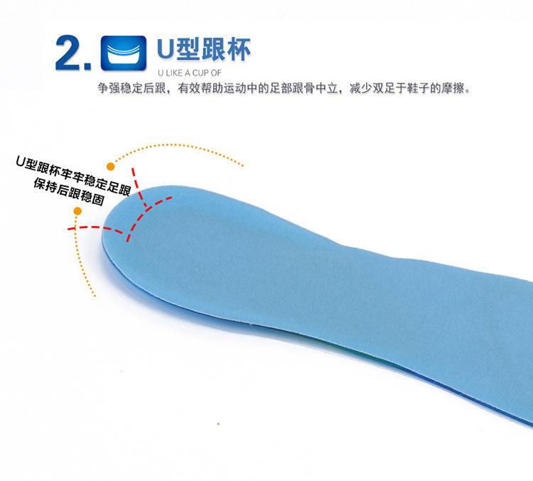 Función del producto: Reducir el daño a la planta del pie causado por la vibración durante el ejercicio. Apoyar eficazmente el arco del pie y reducir la presión en el área del arco, aliviar la fatiga y el dolor del arco. Al mismo tiempo, tiene la función de absorber el sudor y desodorizar.