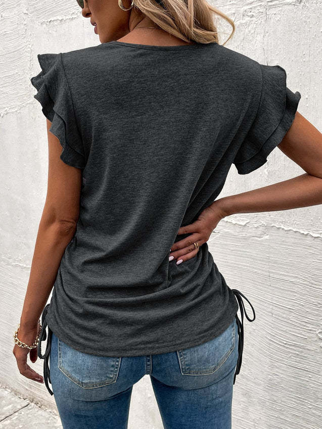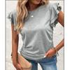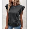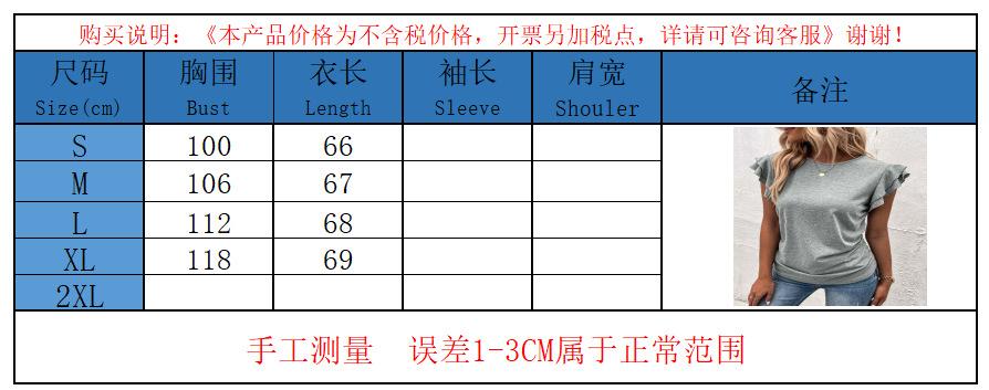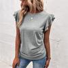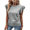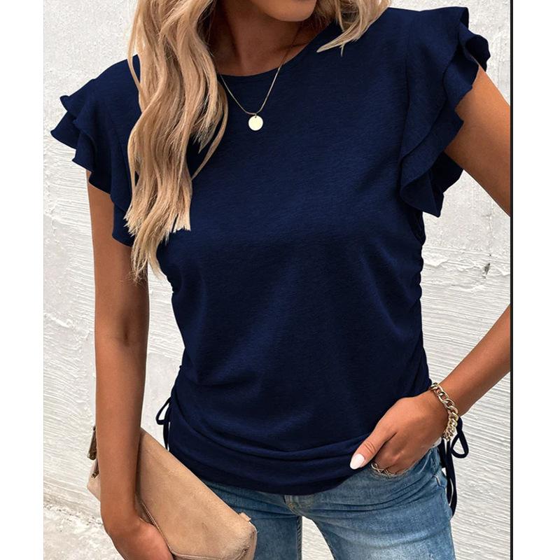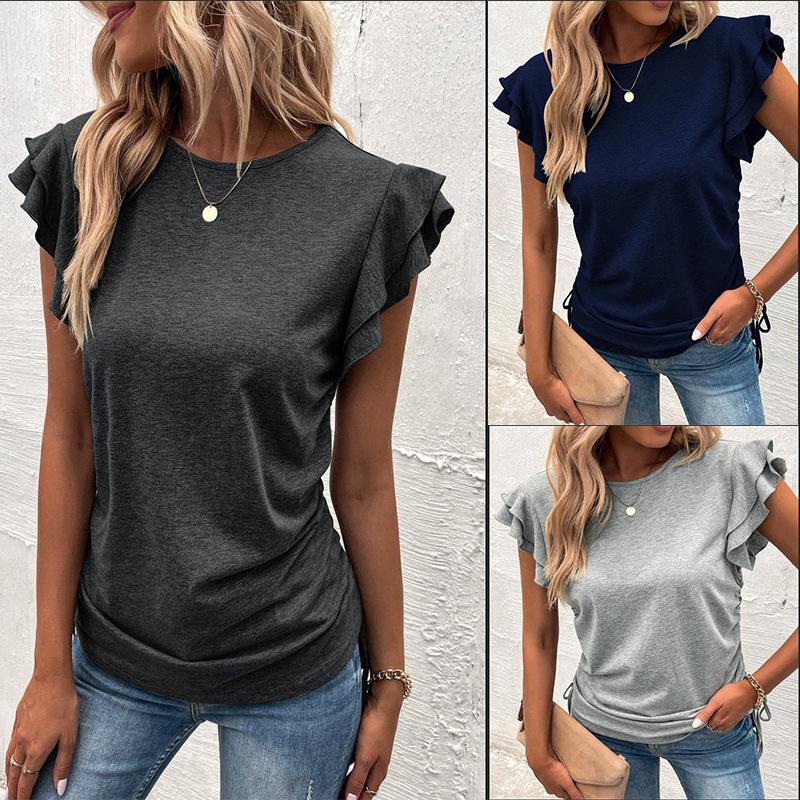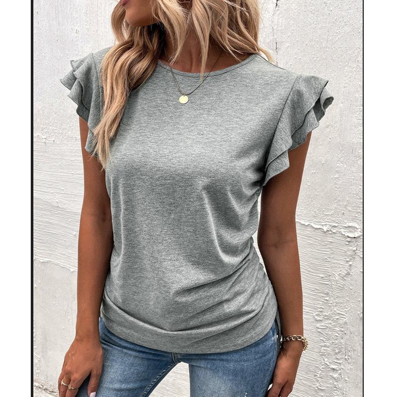 Ropa de Mujer Transfronteriza Europea y Americana 2024 Amazon Verano Nuevo Color Puro Cuello en V Manga Volante Doble Capa Top Suelto Camiseta
