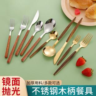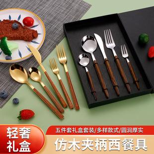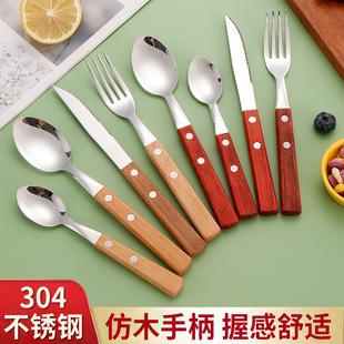 | Cubiertos de acero inoxidable transfronterizos de Amazon, cuchillo y tenedor con mango de madera de imitación, cuchara y tenedor de postre occidental portugués retro, cinco piezas principales |