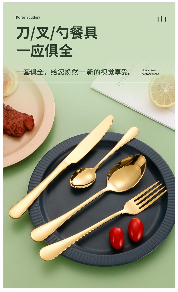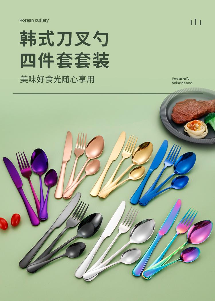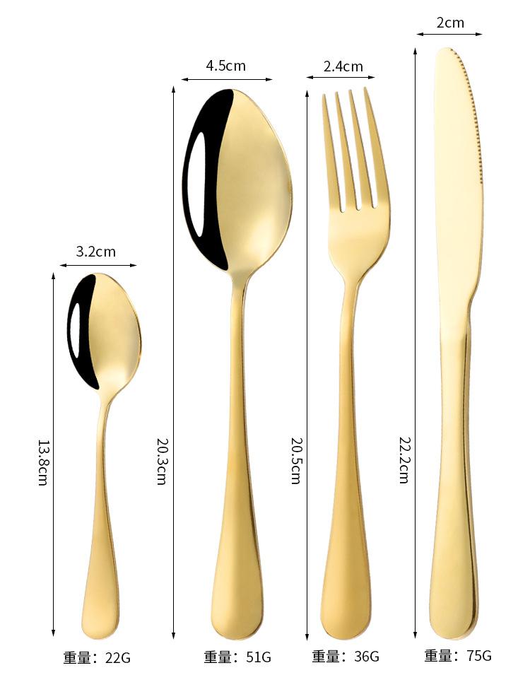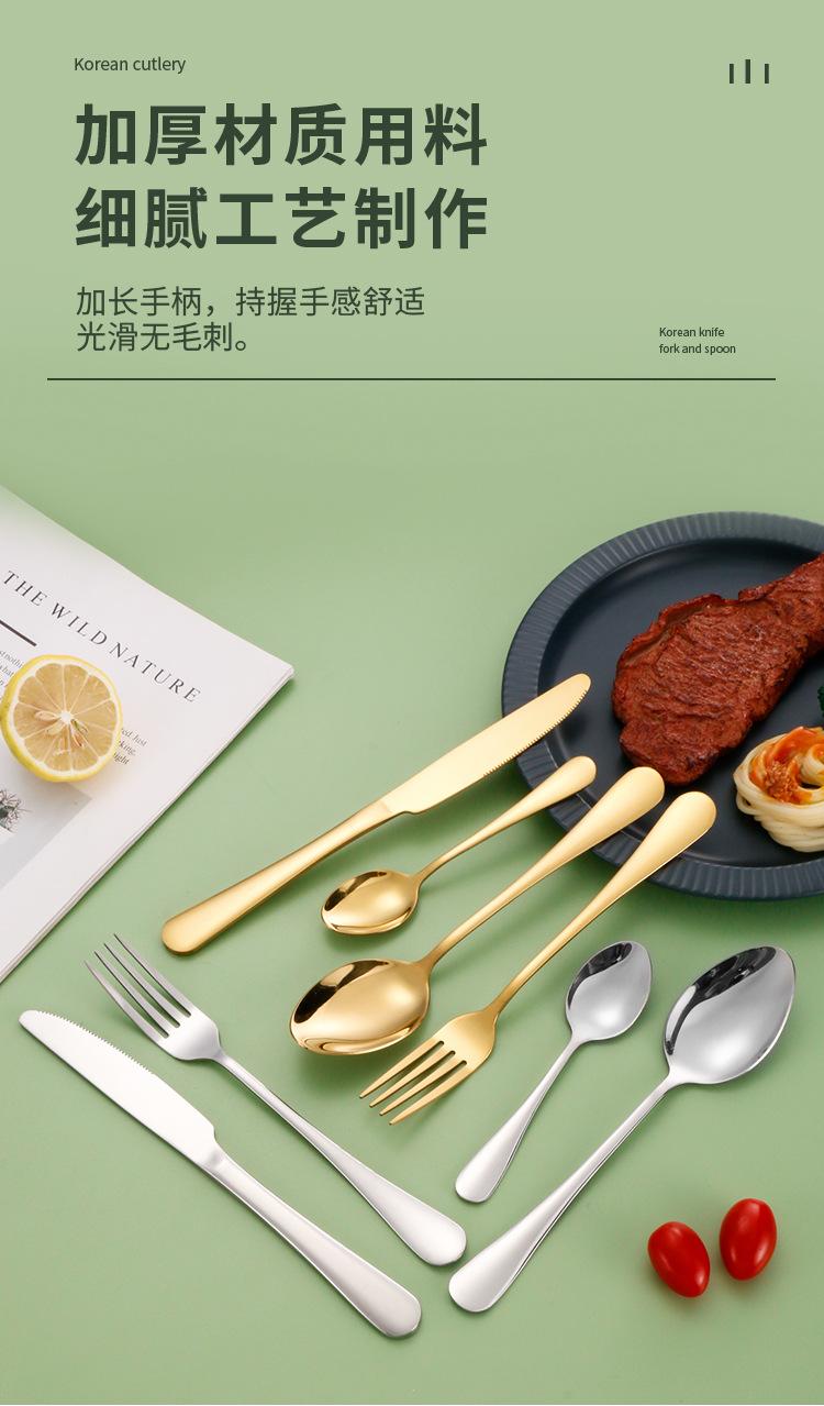| Oferta especial de Amazon: juego de cuatro piezas de cuchillo, tenedor y cuchara de acero inoxidable 1010, cuchillo y tenedor para carne estilo occidental, cubiertos chapados en oro. |
