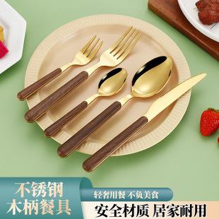 | Vajilla de acero inoxidable con mango de imitación de madera, estilo transfronterizo, con veta de madera, cuchillo para carne de acero inoxidable, tenedor y cuchara, cuchara chapada en oro para hotel. |