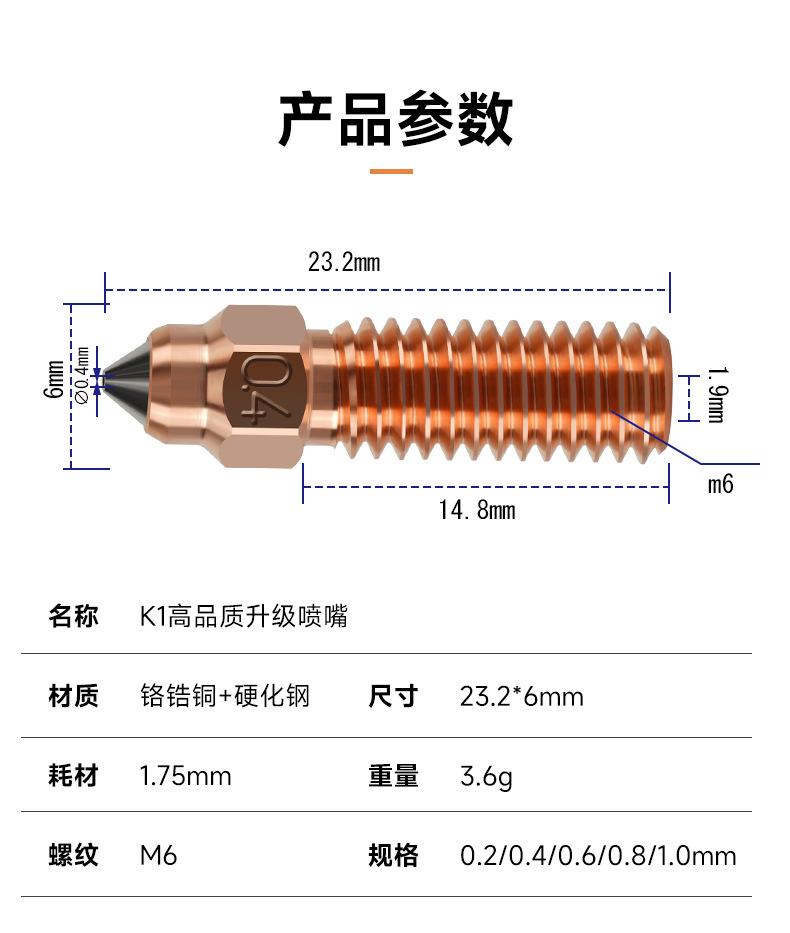 K1 high quality chrome zirconium copper + hard steel inlay upgraded nozzle 0.2mm (individually packaged)