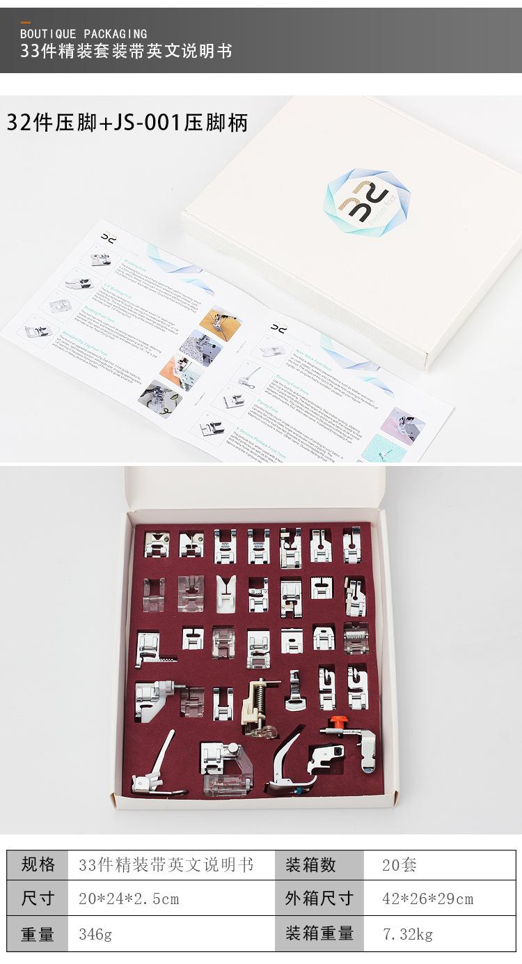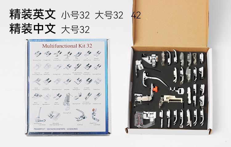 1. Pie prensatelas jacquard 2. Pie prensatelas para tira de ribete 3. Pie prensatelas para coser cuentas 4. Pie prensatelas para coser cuentas 5. Pie prensatelas de tanque delgado 9 ranuras 6. Pie prensatelas de tanque grueso 7 ranuras 7. Pie prensatelas para cremallera invisible 8. Pie prensatelas para cinco cordones 9. Pie prensatelas para encaje enrollado de 6 mm 10. Pie prensatelas antiadherente (cuero) 11. Pie prensatelas de apertura transparente 12. Pie prensatelas de gran apertura 13. Pie prensatelas para tres cordones 14. Pie prensatelas para acolchado de 1/4 de pulgada en línea recta 15. Pie prensatelas de línea recta central 16. Pie prensatelas para acolchado de 1/4 de pulgada con guía 17. Pie prensatelas para borde de bloqueo 18, pie prensatelas transparente para bordado de apliques 19, pie prensatelas para incrustación de siete cordones 20, pie prensatelas para empalme 21, pie prensatelas para regla 22, pie prensatelas para puntada invisible 23, pie prensatelas para fruncir material delgado 24, pie prensatelas para dobladillo de 3 mm 25, pie prensatelas para dobladillo de 6 mm 26, pie prensatelas para encaje de 3 mm 27, pie prensatelas de rodillo para cuero 28, pie prensatelas para bordado y zurcido 29, pie prensatelas ajustable para tira de tela ancha 30, pie prensatelas para acolchado y bordado libre 31, pie prensatelas ajustable de un solo lado 32, pie prensatelas sincrónico para material delgado