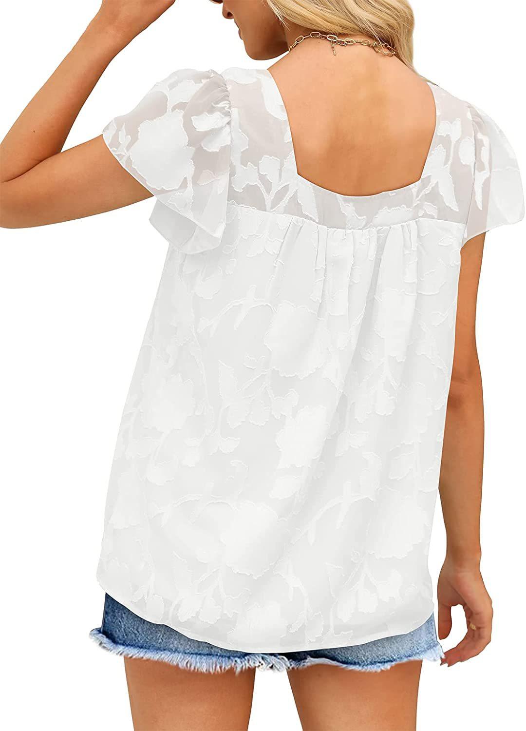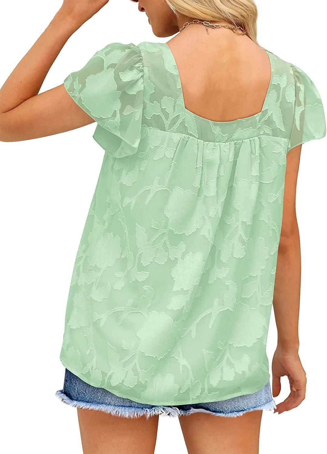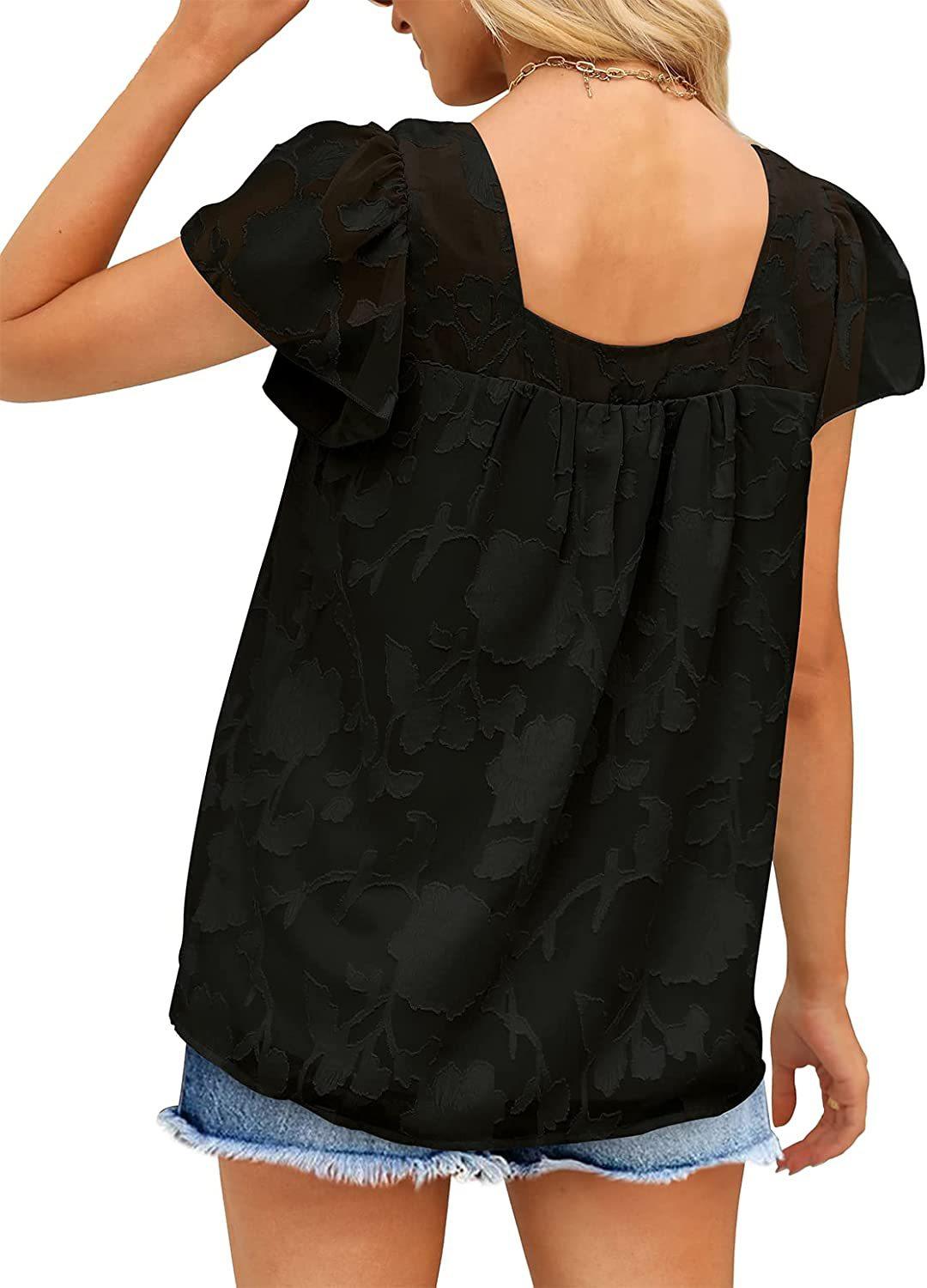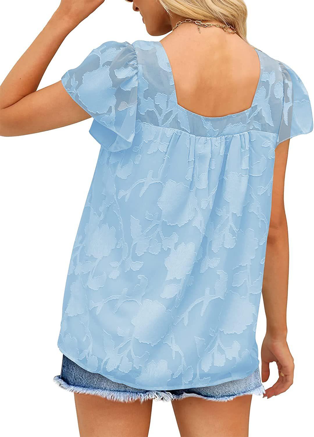 Camisa de gasa de manga corta con cuello cuadrado y encaje calado de Amazon, ropa de mujer transfronteriza de comercio exterior europeo y americano de verano de 2024
