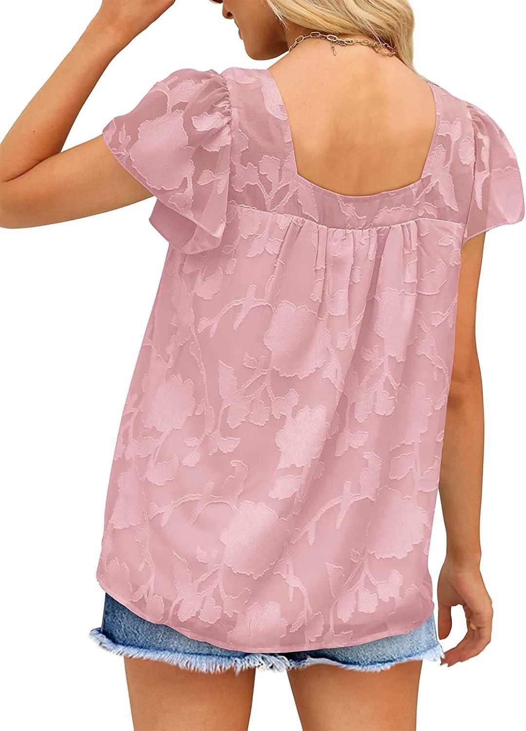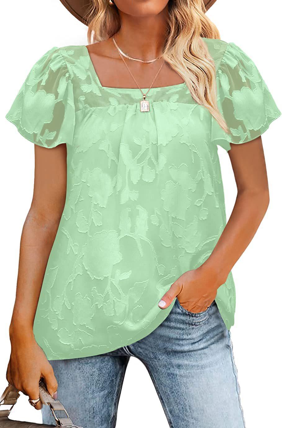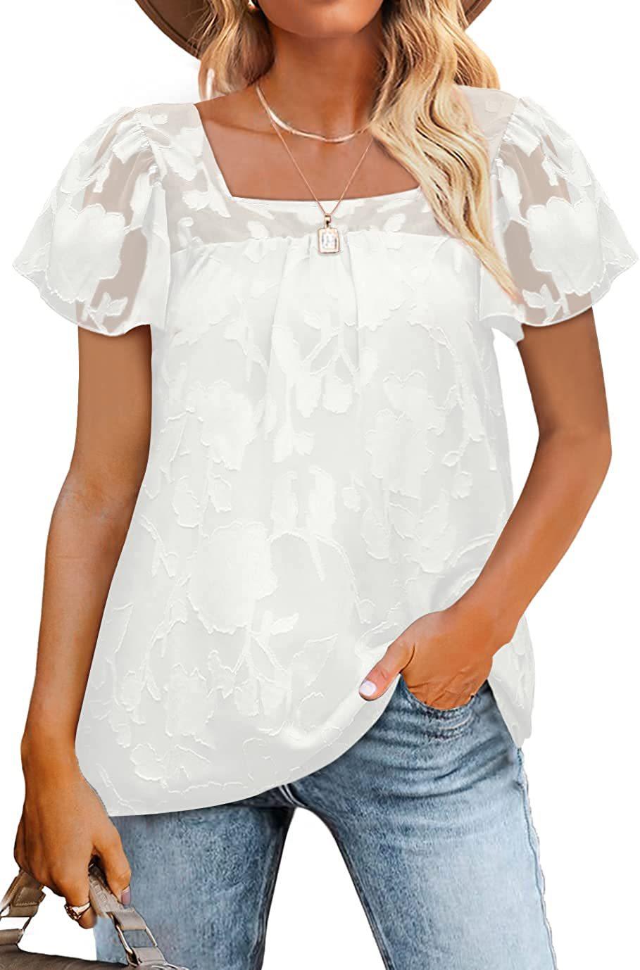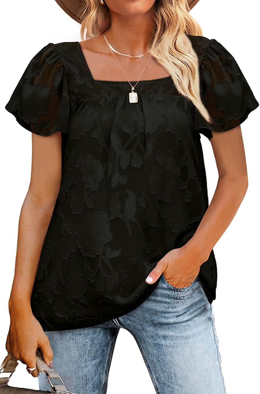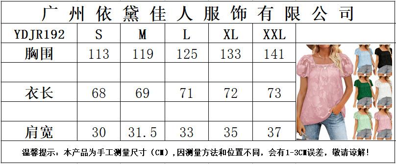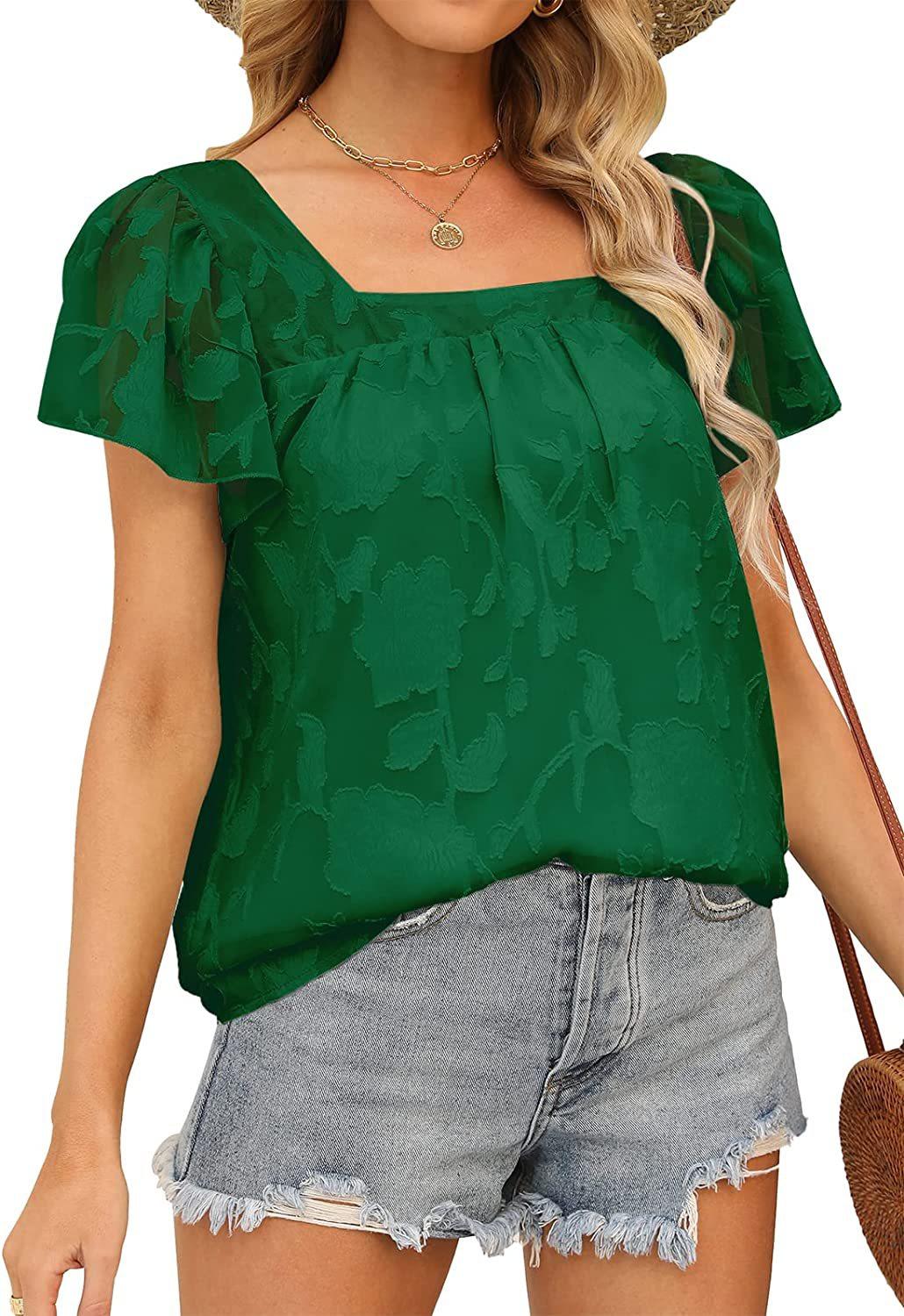 Camisa de gasa de manga corta con cuello cuadrado y encaje calado de Amazon, ropa de mujer transfronteriza de comercio exterior europeo y americano de verano de 2024
