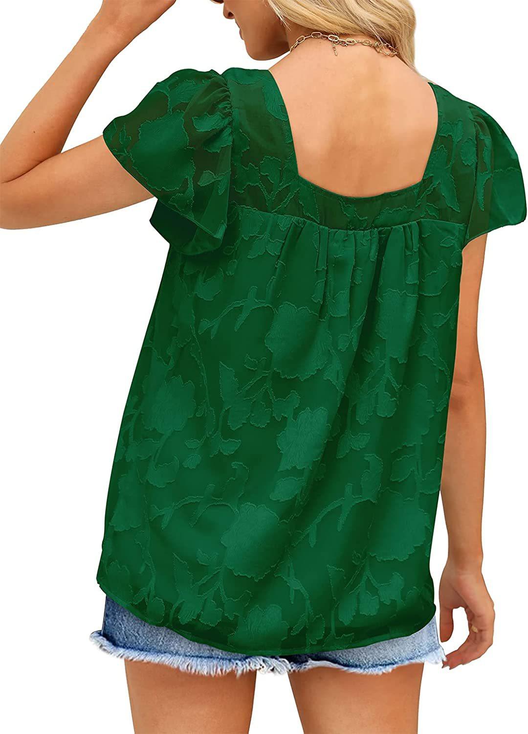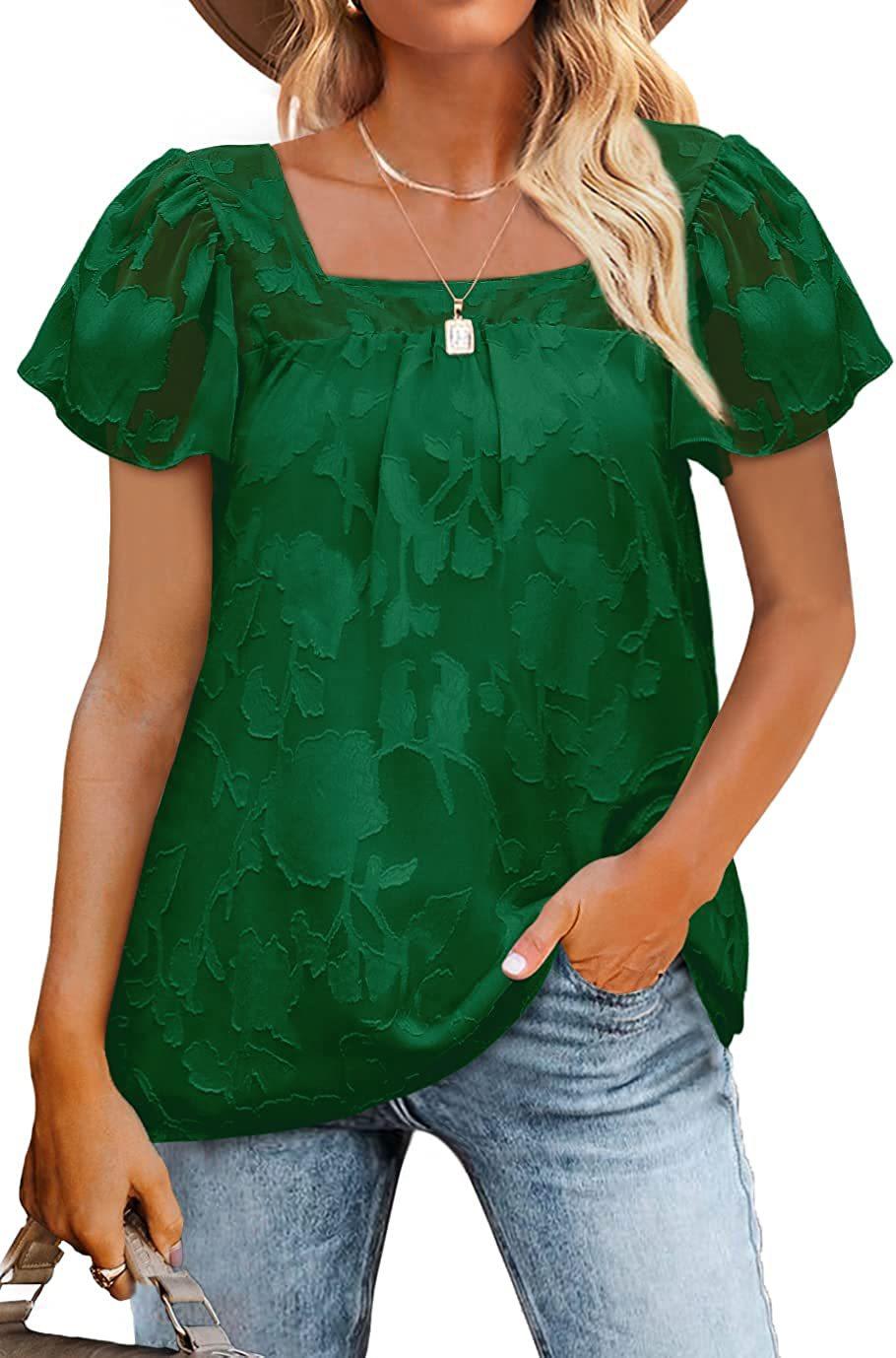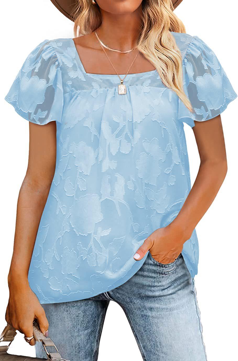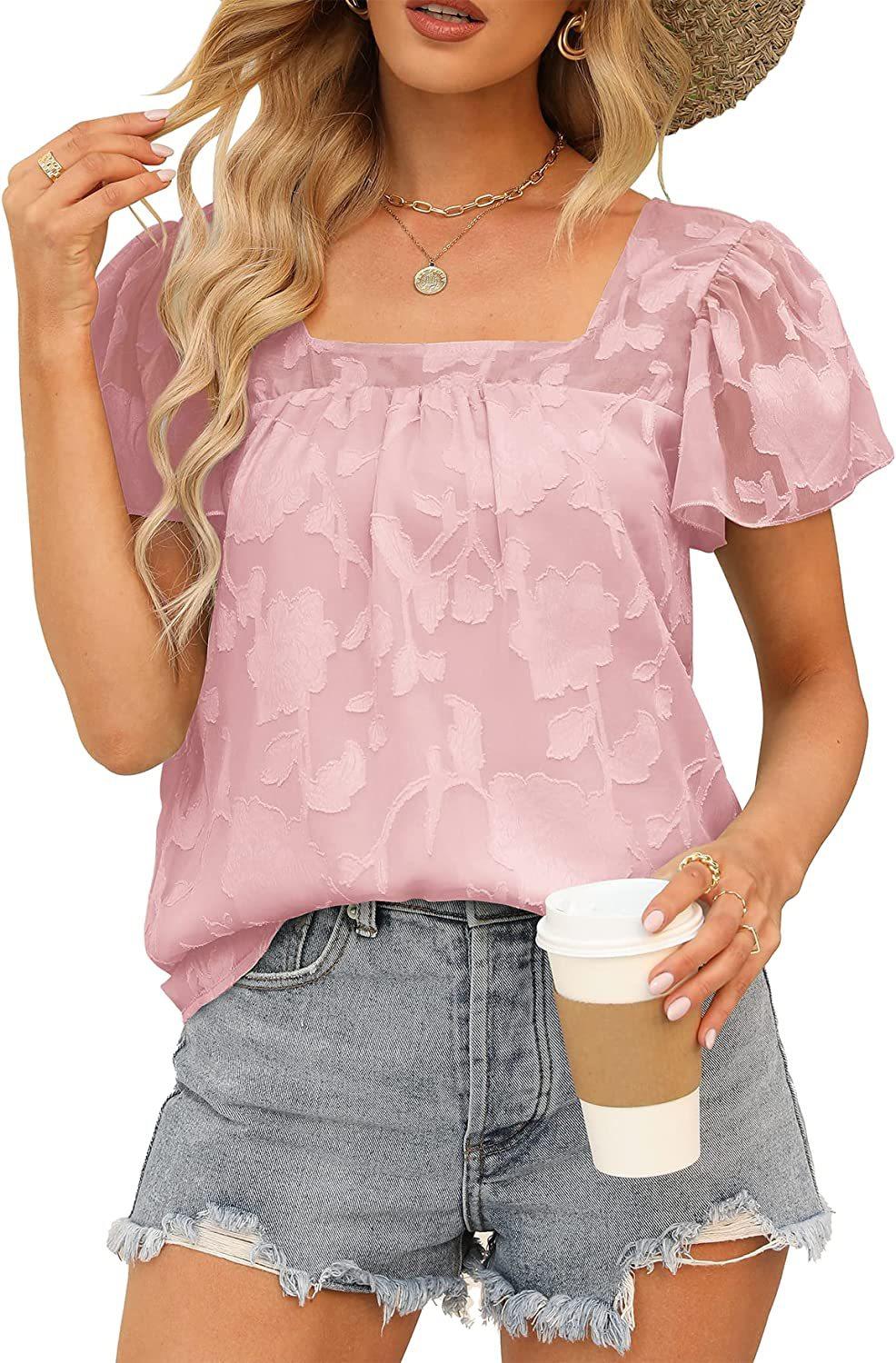 Camisa de gasa de manga corta con cuello cuadrado y encaje calado de Amazon, ropa de mujer transfronteriza de comercio exterior europeo y americano de verano de 2024