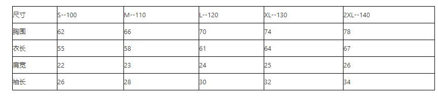 S---100cm, M---110cm, L---120cm, XL----130cm, XXL---140