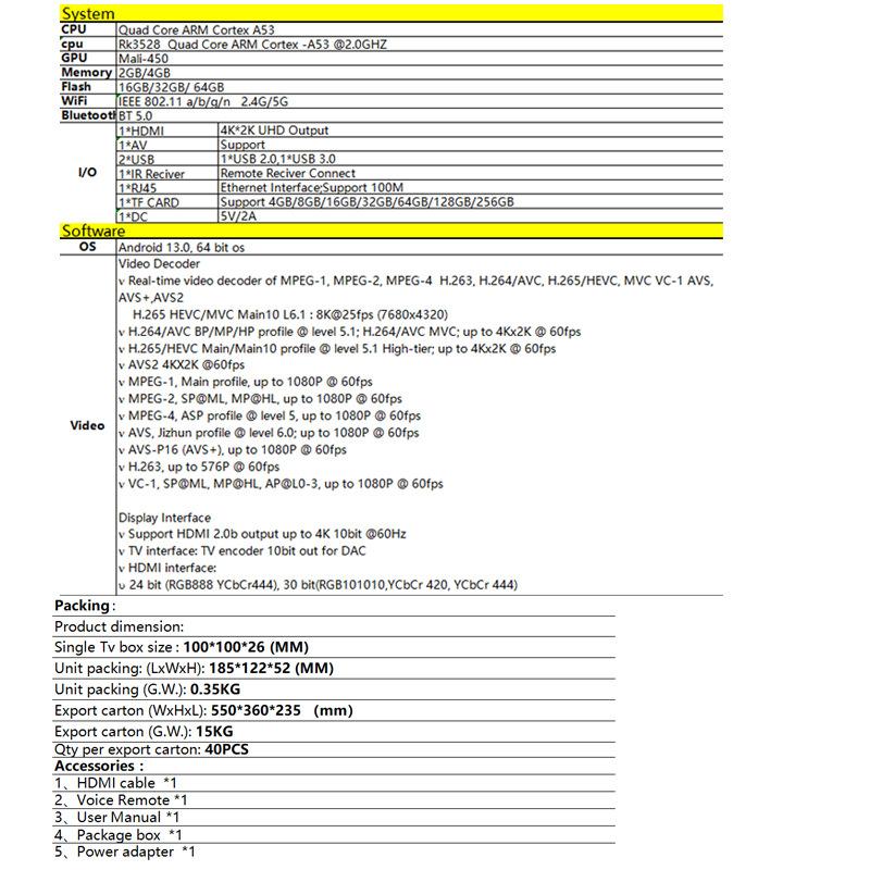 Set-top box, remote control, hdml cable, manual, dc power supply, color box