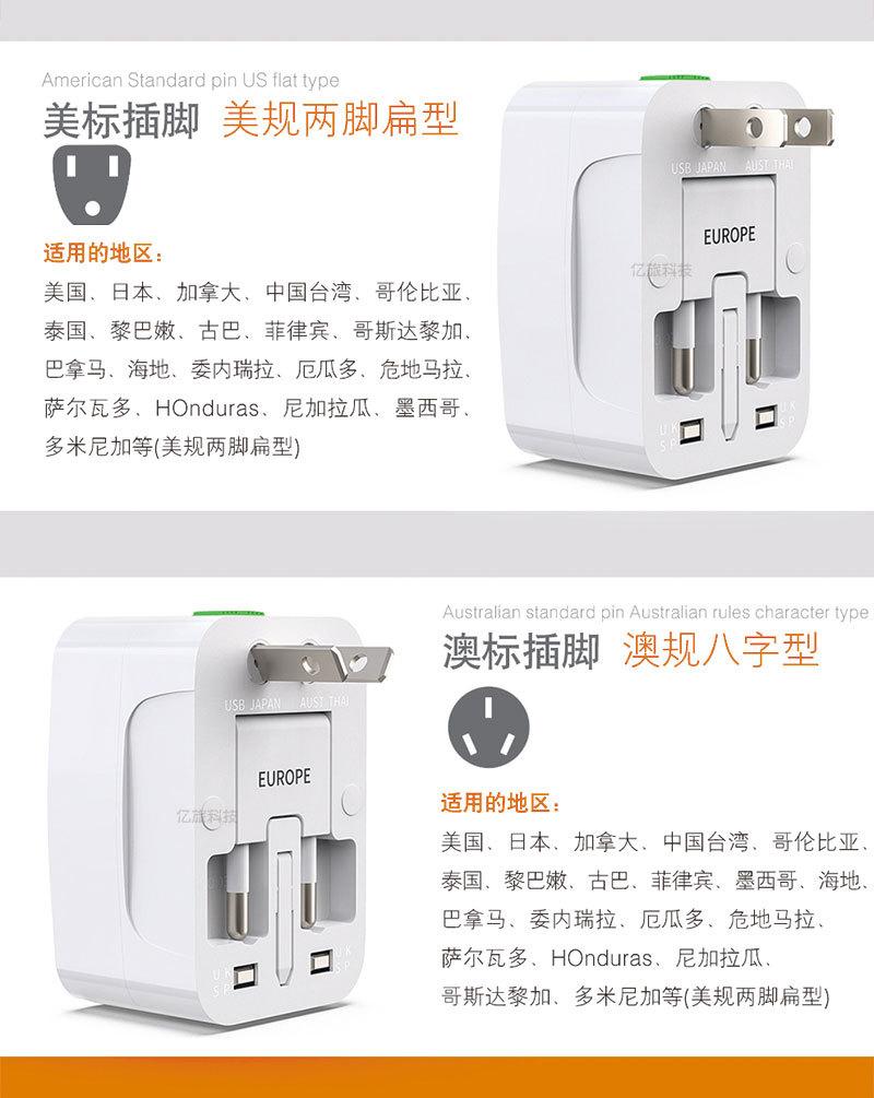 7. Tipo de enchufe: estándar americano, estándar australiano, estándar británico, estándar europeo, cuatro tipos de enchufes en uno.