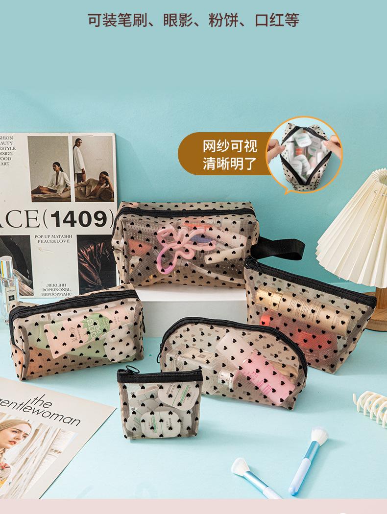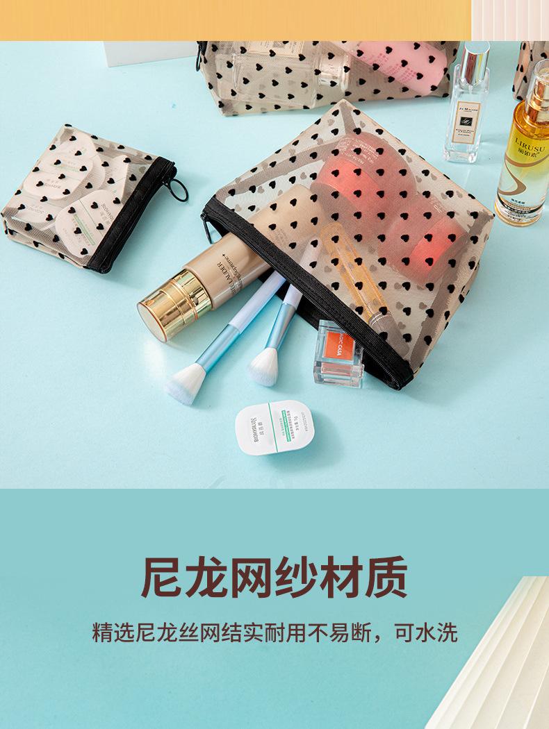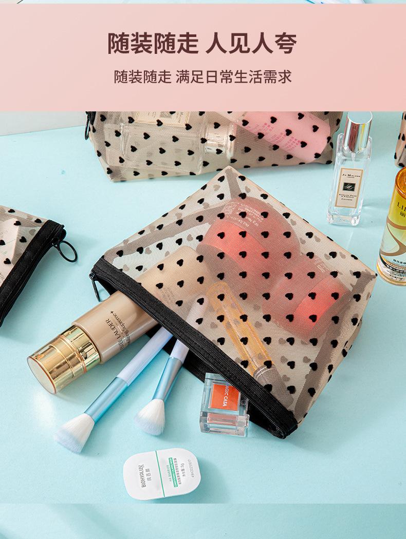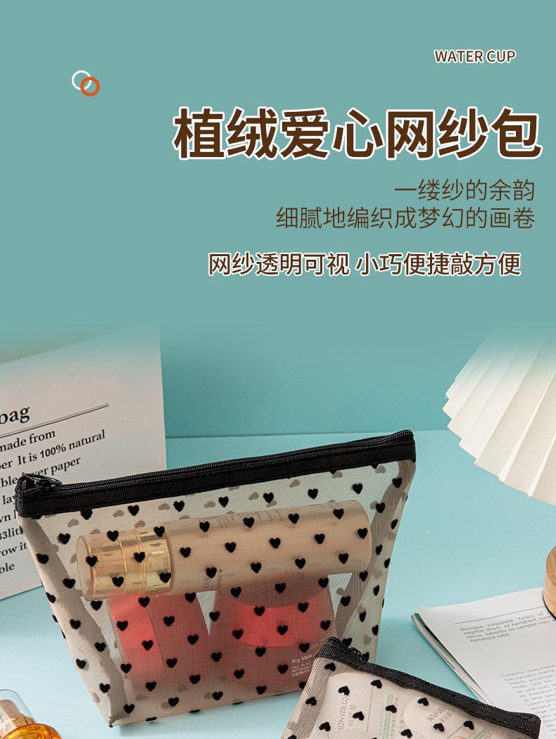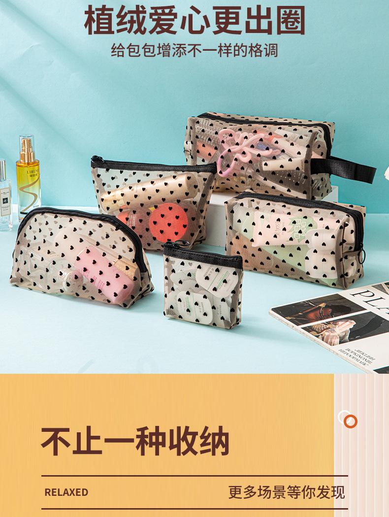 Verano Nuevo Flocado Amor Malla Transparente Portátil Bolsa de Cosméticos Gran Capacidad Portátil Viaje Neceser Almacenamiento