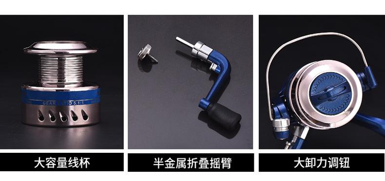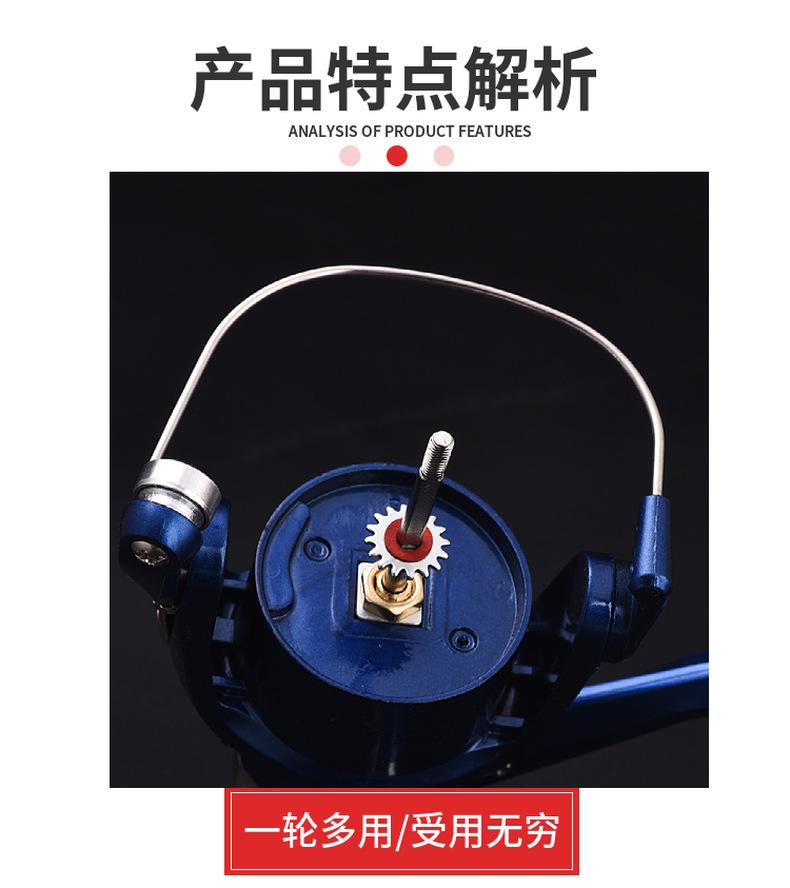 Atributos del producto: carrete de plástico, cuerpo de plástico, balancín plegable semimetálico, bobina de engranaje fino, mango de goma suave, varilla de engranaje de cobre, husillo de acero inoxidable, disco de engranaje de aleación de zinc, 5BB.