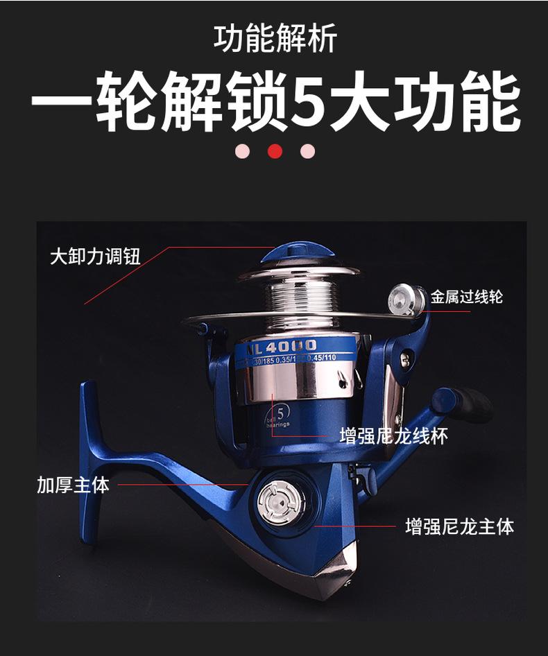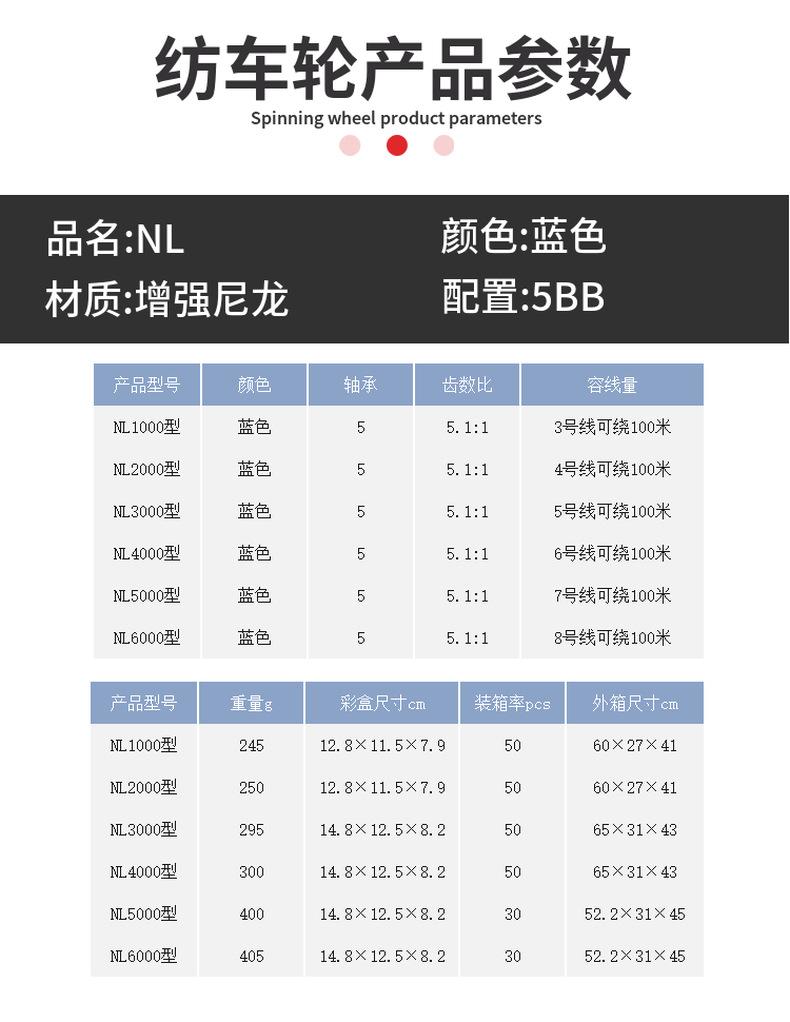 | NL2000 | azul | 5BB | 128✖115✖79cm | La línea 4 puede recorrer unos 100 metros. | 250 gramos |