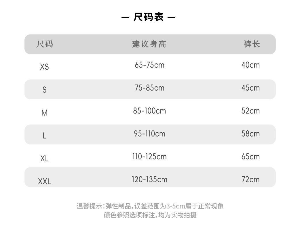 XS (pants length 40cm, 65-75cm recommended), S (pants length 45cm, 75-90cm recommended), M (pants length 52cm,...