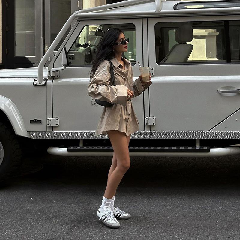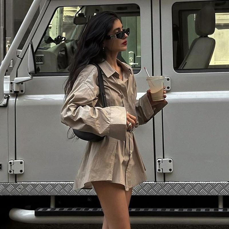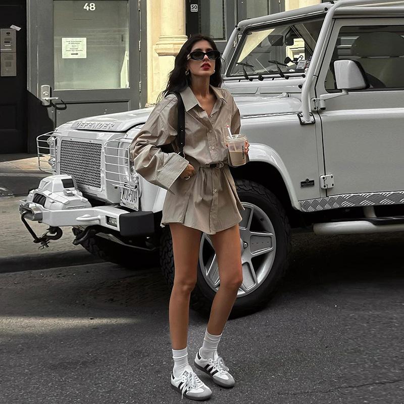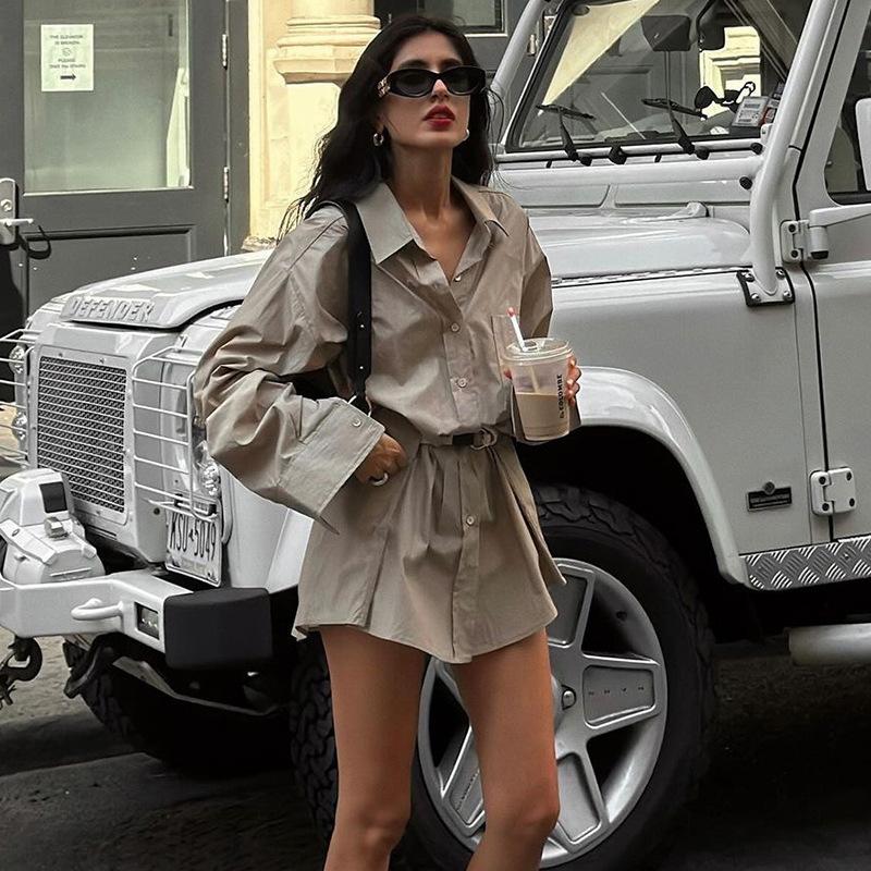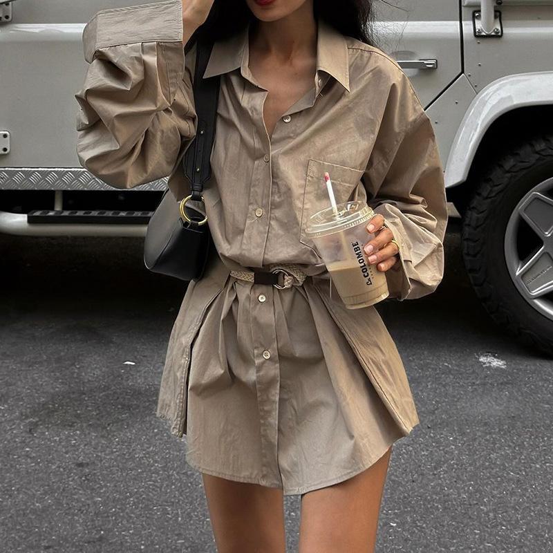Transfronterizo 2024 estilo europeo y americano verano nuevo vestido de mujer de color sólido holgado moda callejera cintura alta solapa manga larga