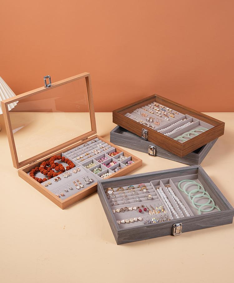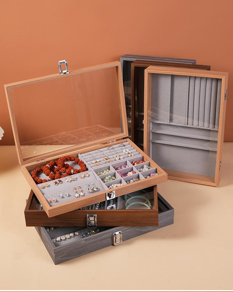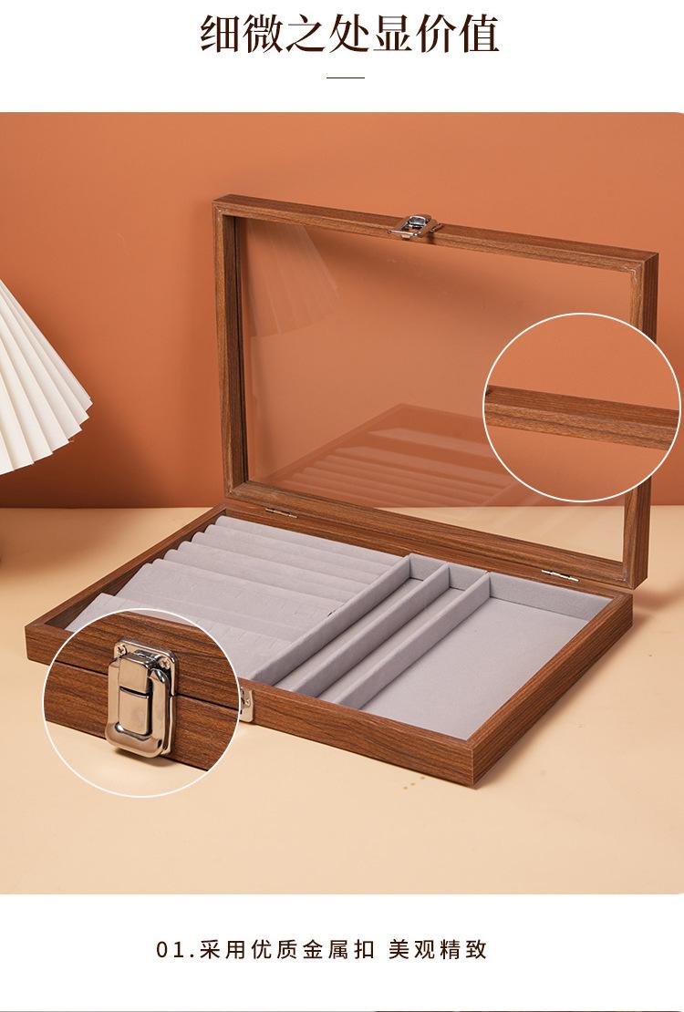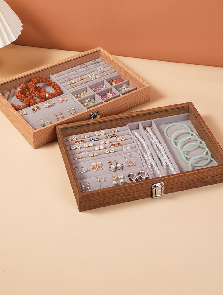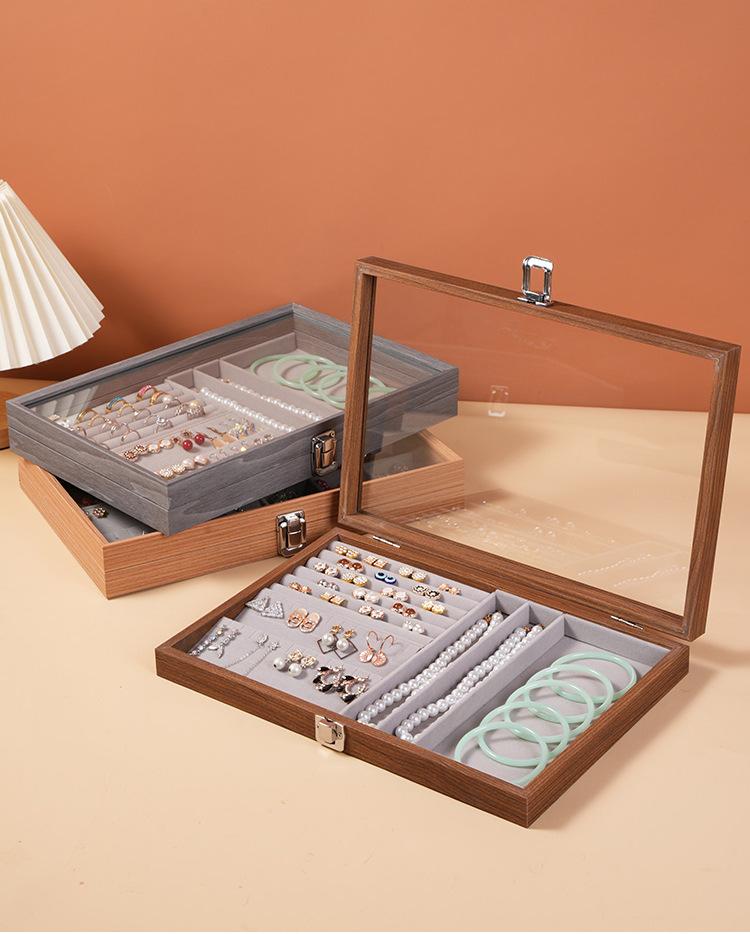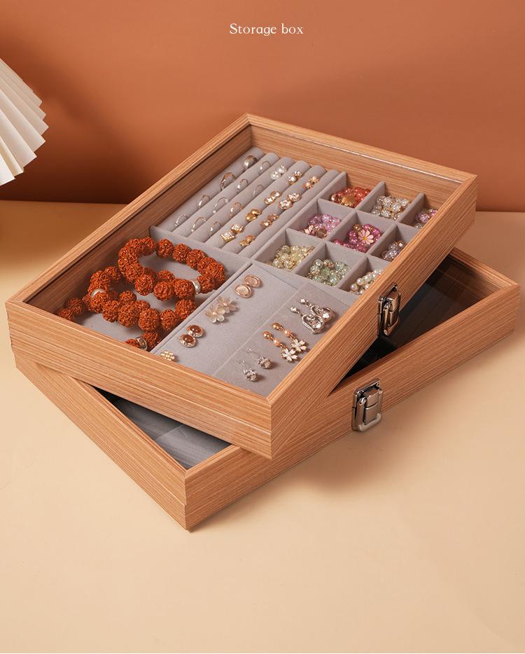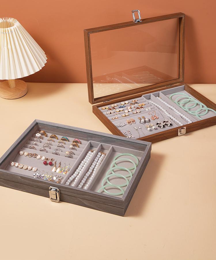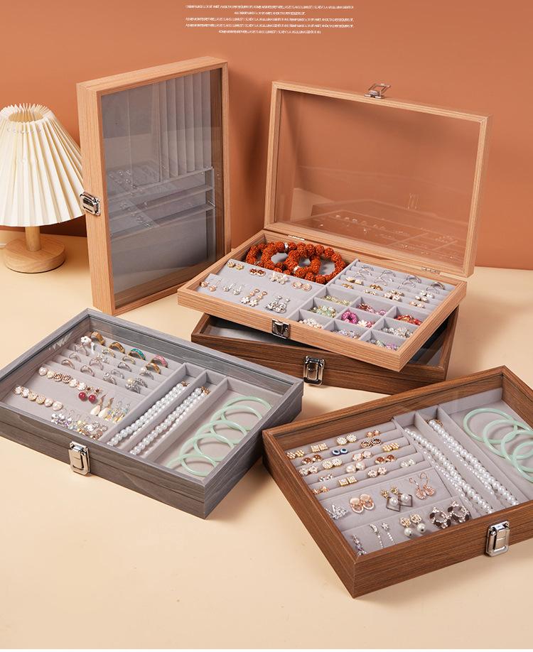 Caja de almacenamiento de joyas para anillos de color nogal, transparente, a prueba de polvo, para aretes, collares, joyas, acabado de joyas, joyero.