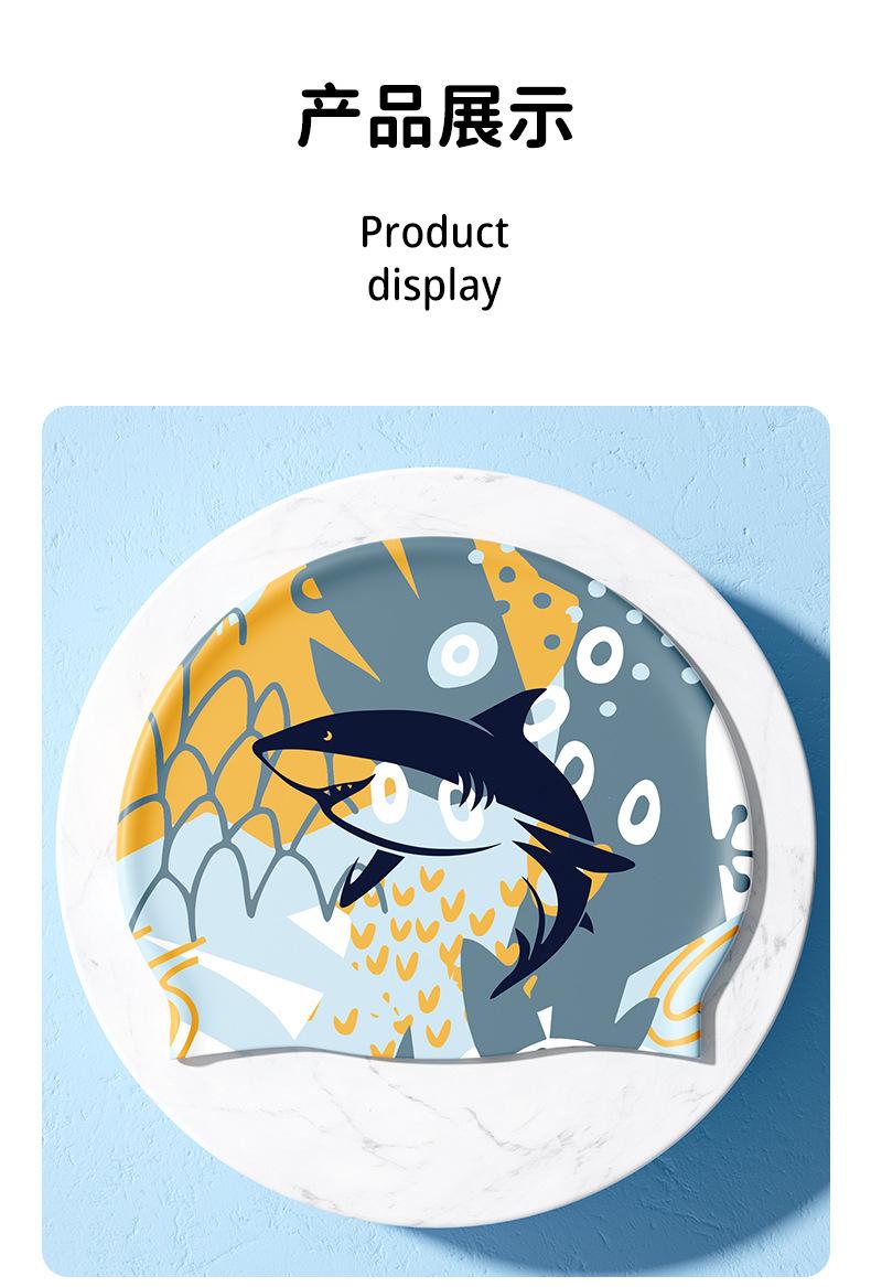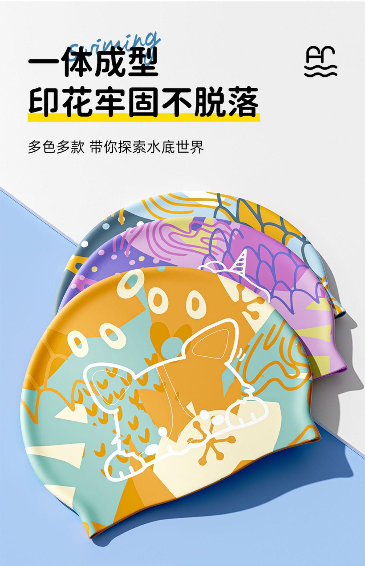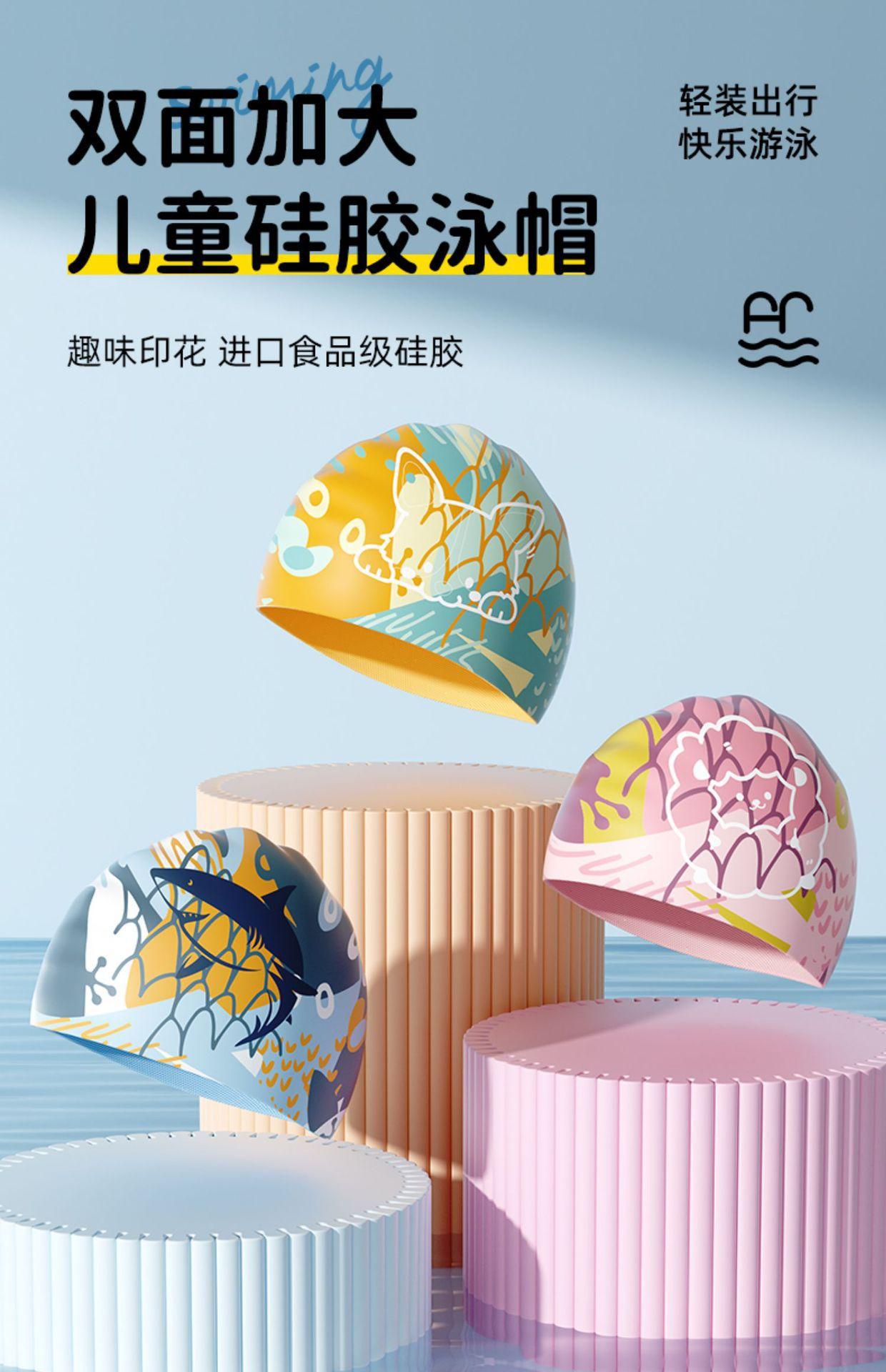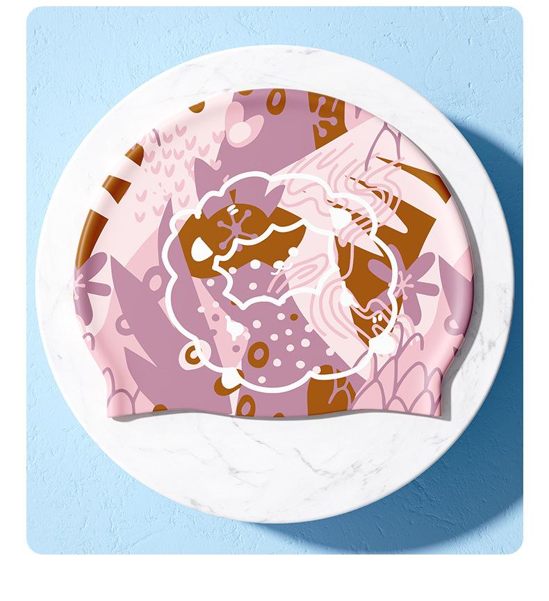 dark blue shark [silicone swimming cap]], Purple unicorn [silicone swimming cap]], Chocolate sheep [silicone s...