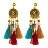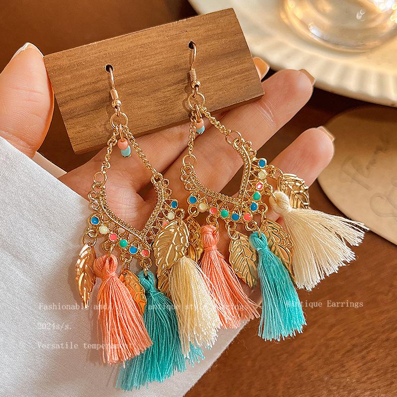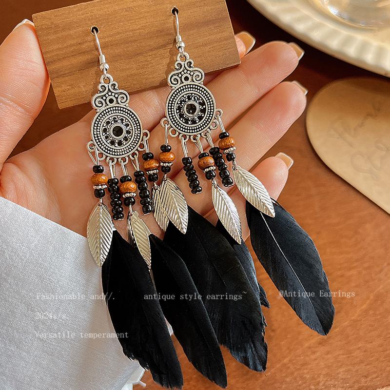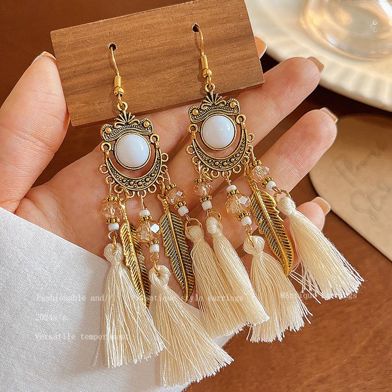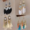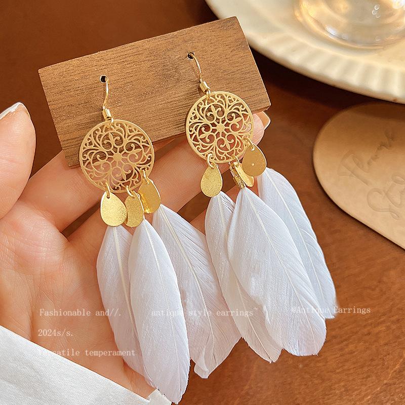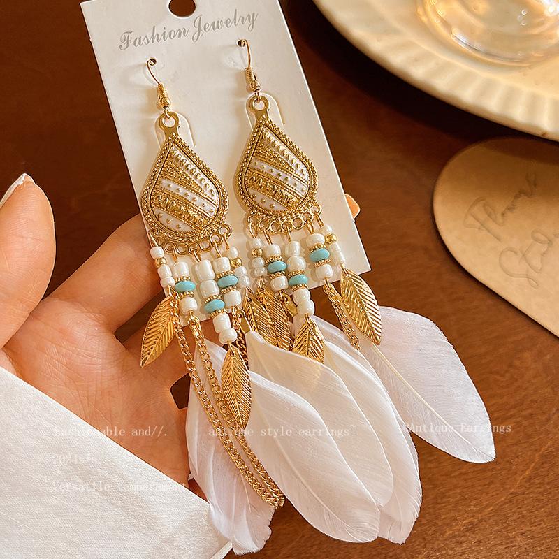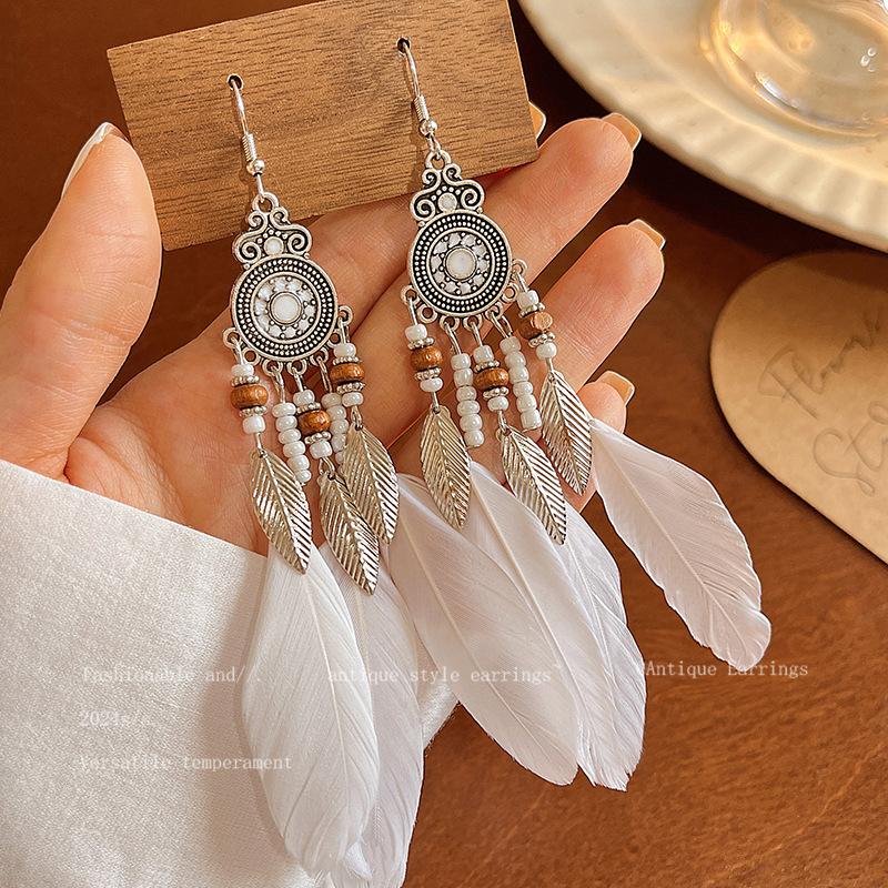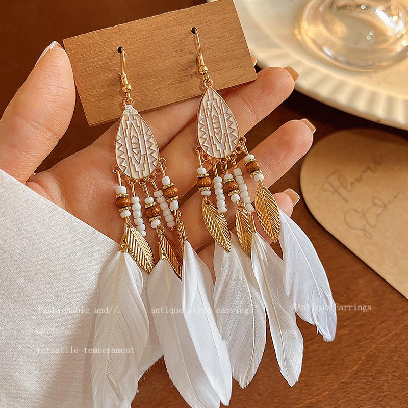 Pendientes largos con borlas estilo bohemio, pendientes de plumas blancas de alta gama, pendientes de estilo étnico, ganchos para las orejas.