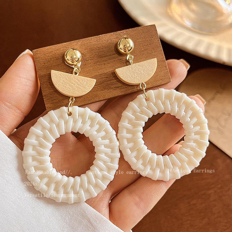 Crescent red bead ear hooks, Candy beige circle stud earrings, Candy khaki circle stud earrings