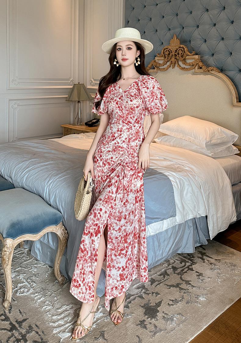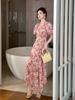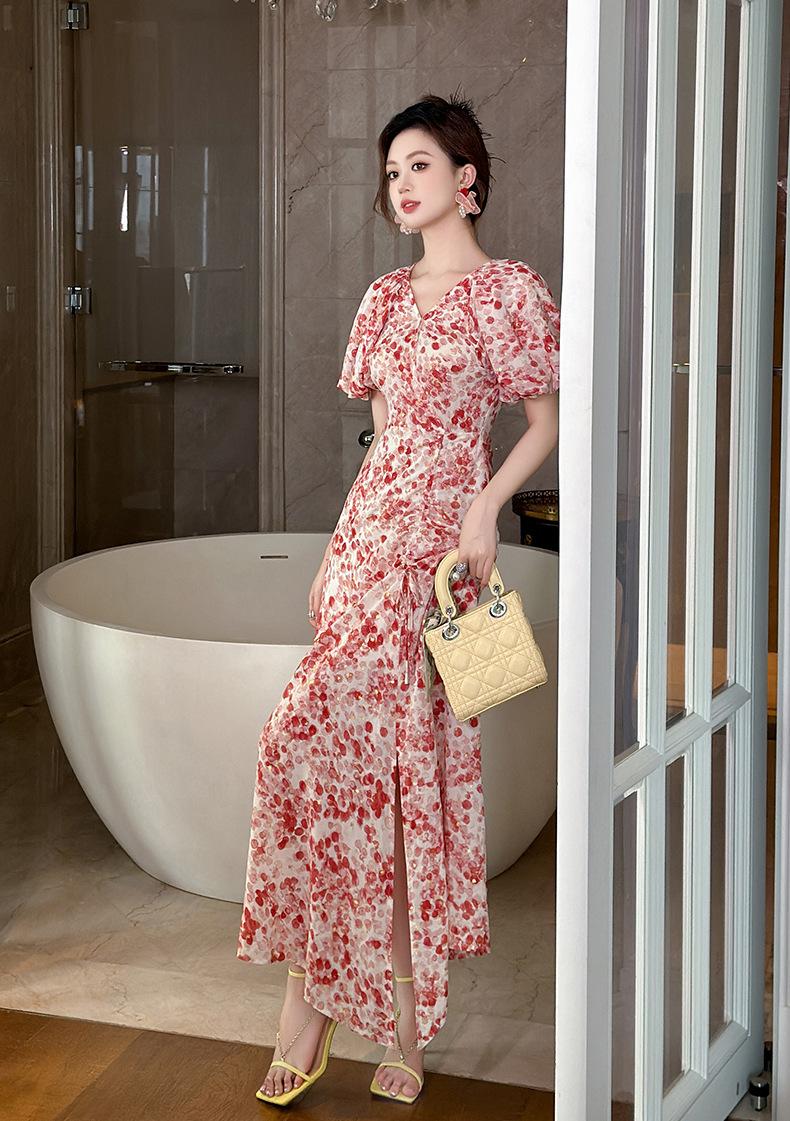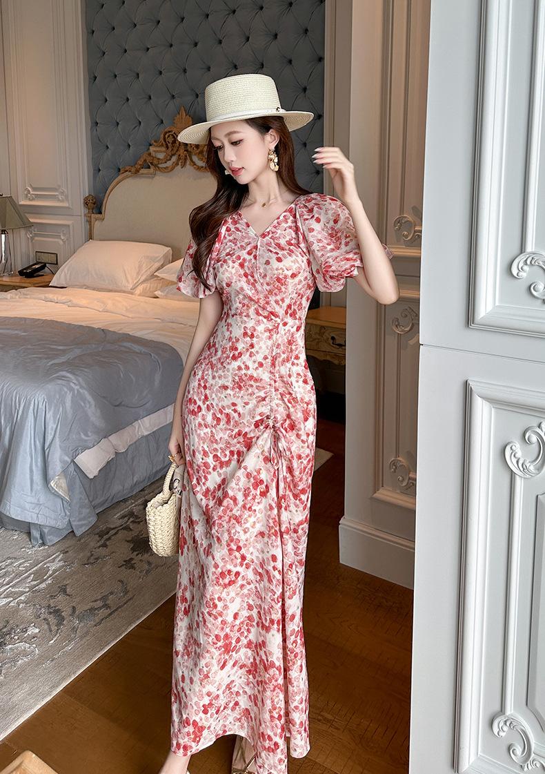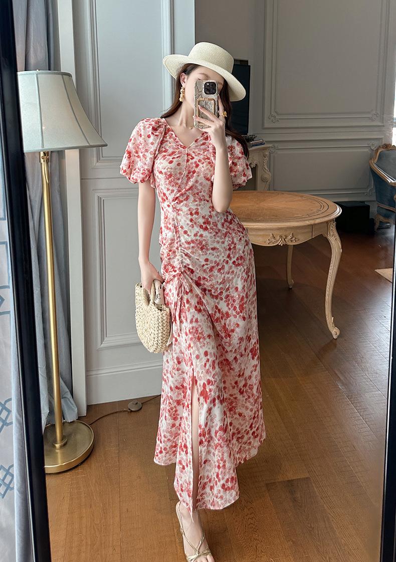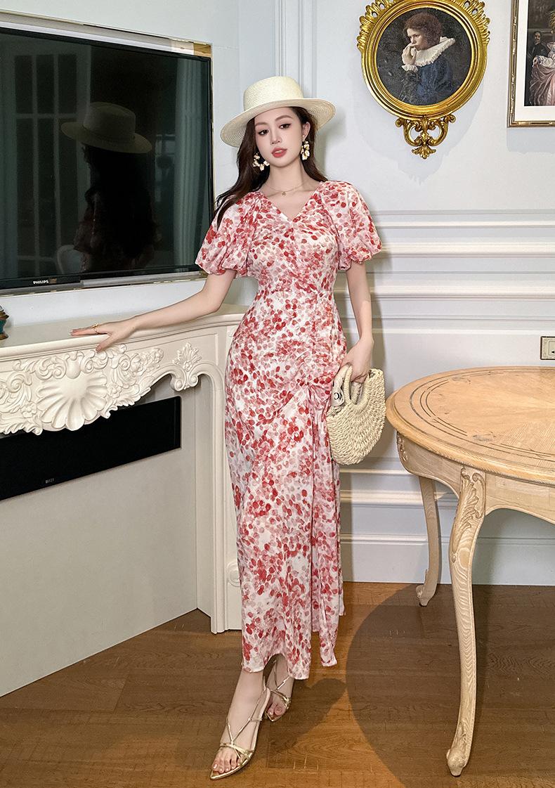2025 Nuevo Verano Vestido Floral Plisado para Mujer Francés Cuello en V Manga Abullonada Cintura Adelgazante Look 30921