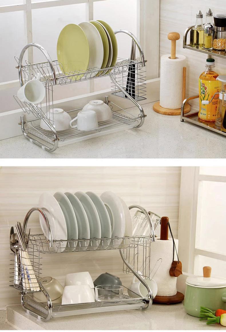 Escurridor de platos de doble capa con drenaje para cocina, almacenamiento de vajilla, escurridor de platos de doble capa en forma de S