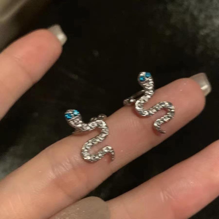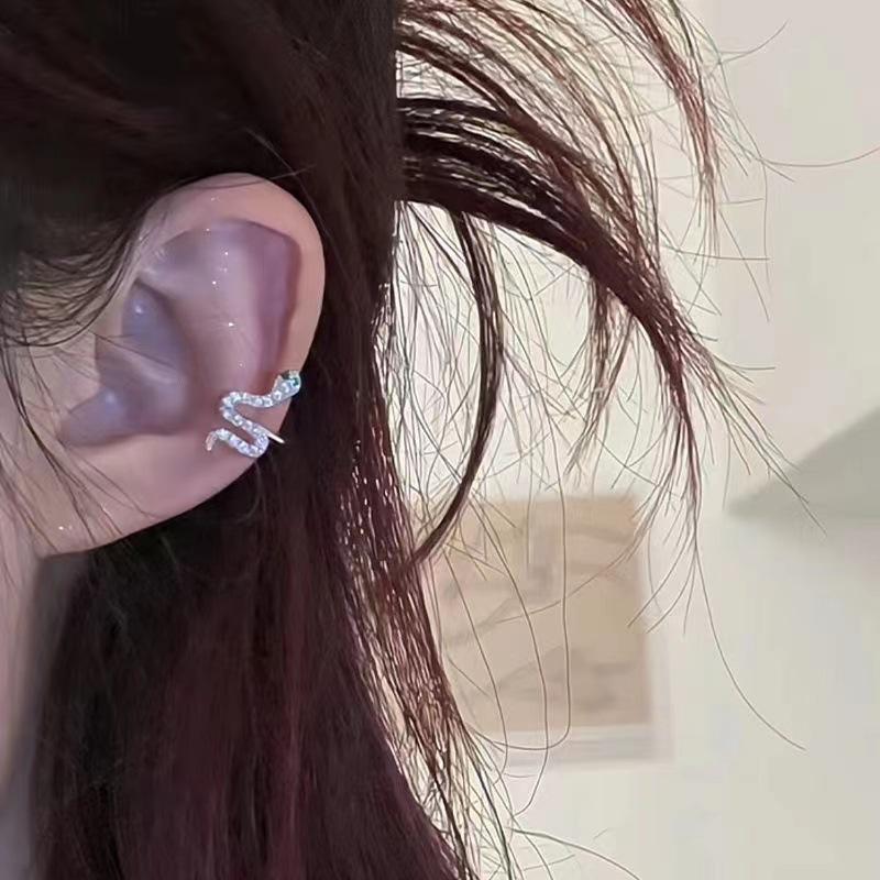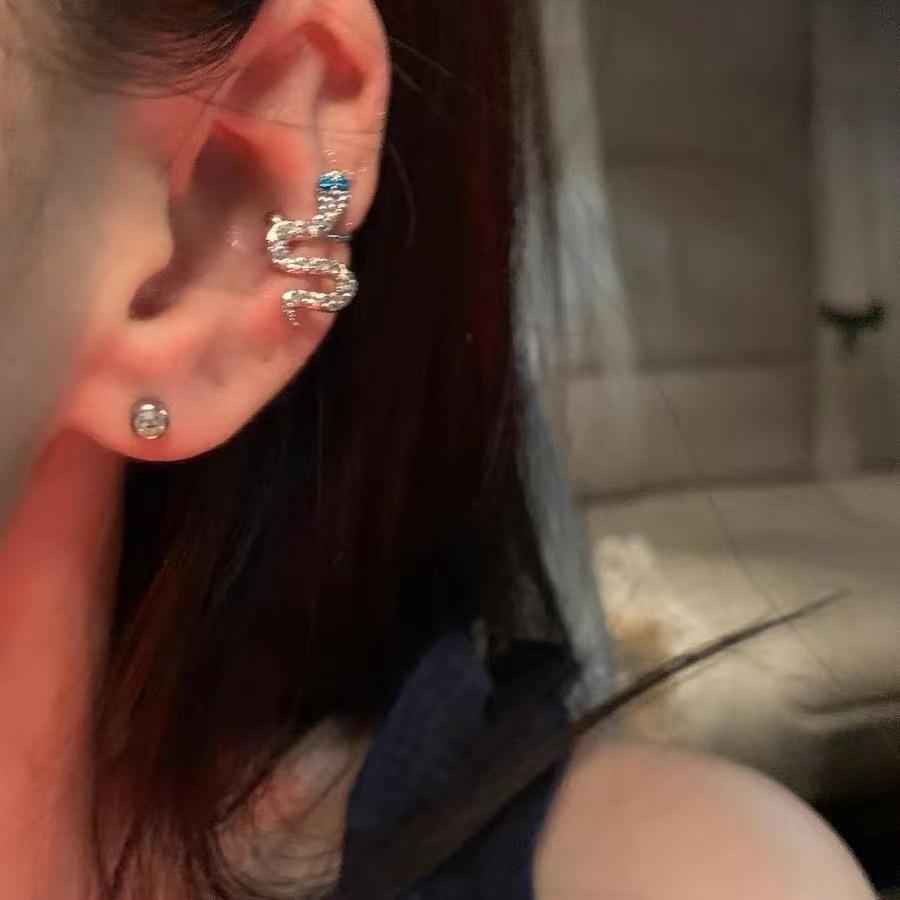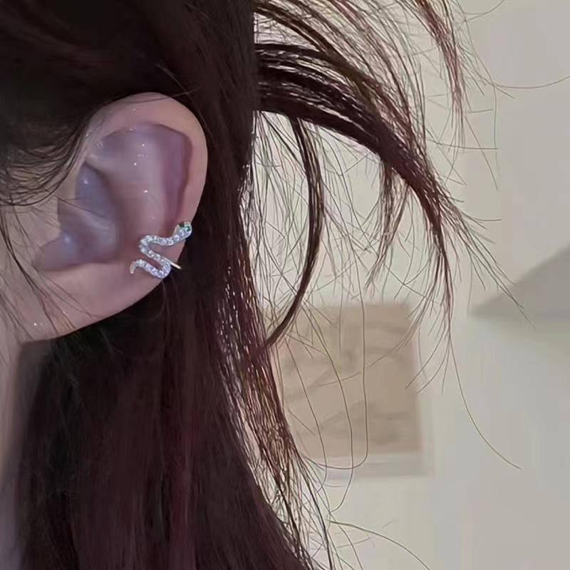 Ins clip para oreja con forma de serpiente de diamantes completos aretes de serpiente pequeña verdes exquisito sentido de alta gama nicho personalidad clip para hueso de oreja sin perforación femenino